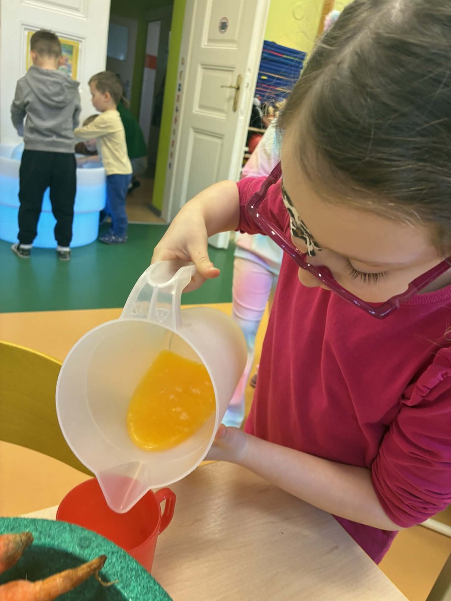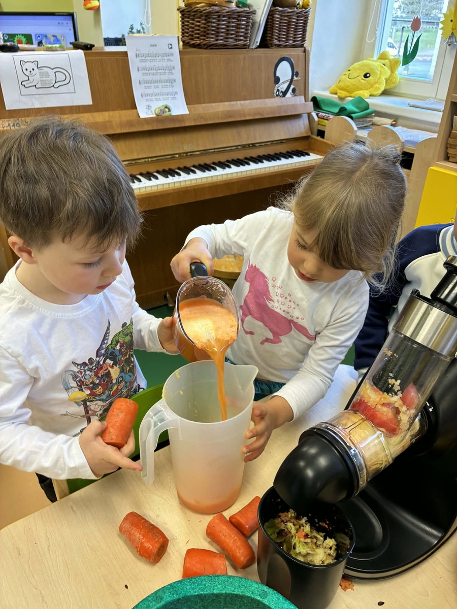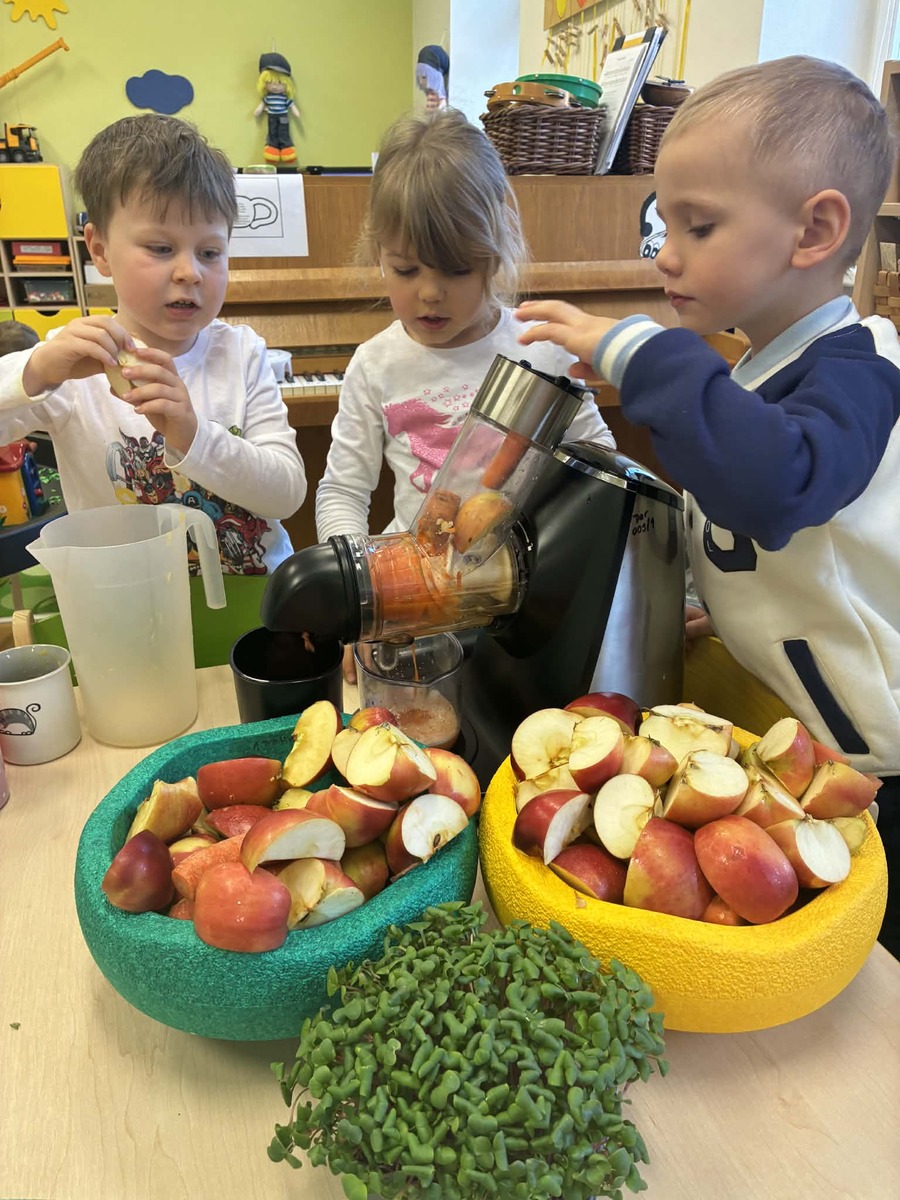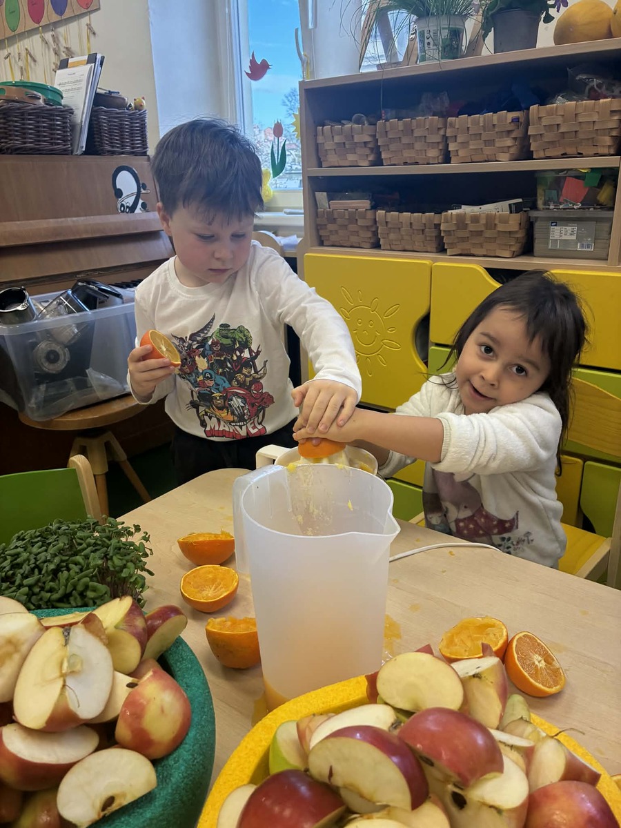 Díky ovoci od rodičů jsme s dětmi zažili malé „vitamínové experimentování“. K dispozici jsme měli jablka, pomeranče a mrkev, a děti měly velkou chuť si samy vyzkoušet odšťavňování. Využili jsme ruční odšťavňovač na citrusy i klasický odšťavňovač. Děti zkoušely různé kombinace, objevovaly nové chutě a s radostí ochutnávaly výsledky své práce. Přirozenou cestou si tak doplnily spoustu vitamínů.