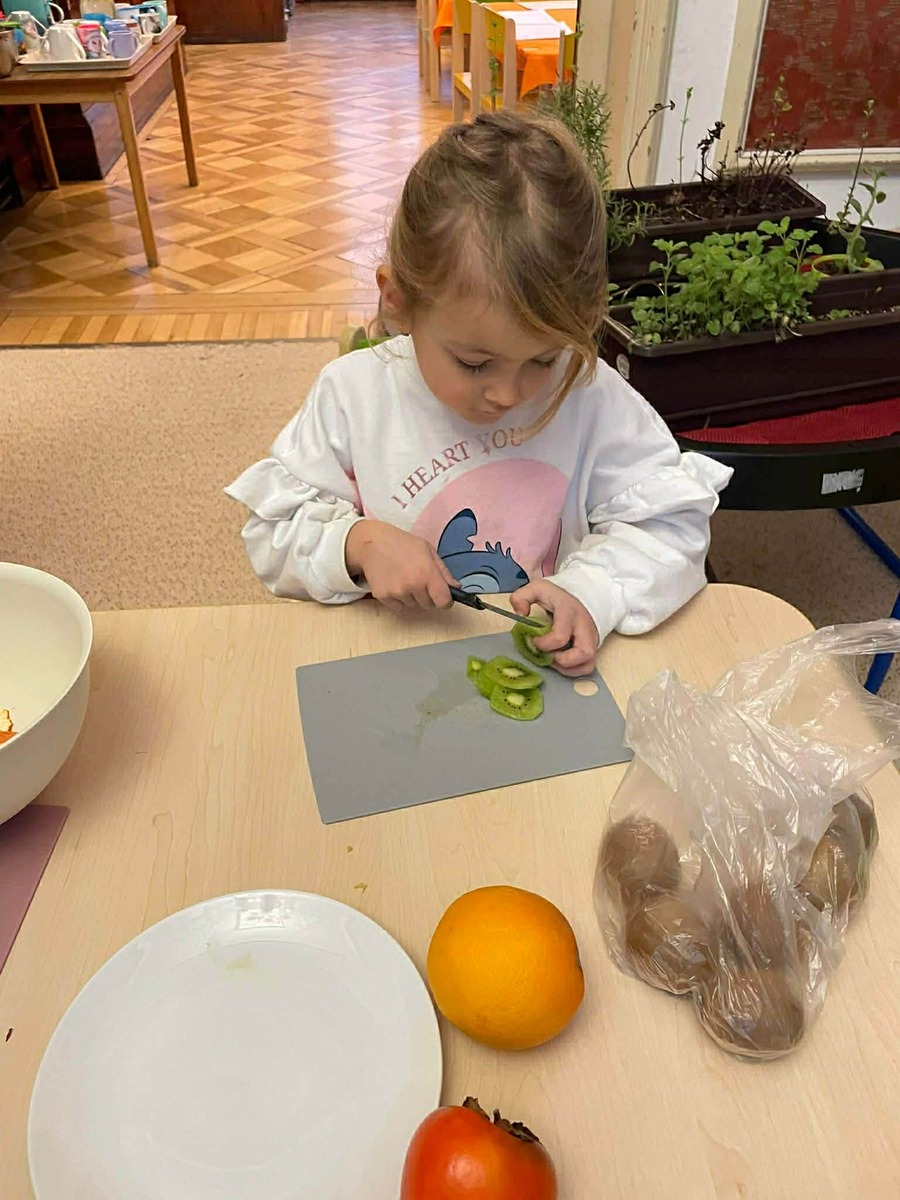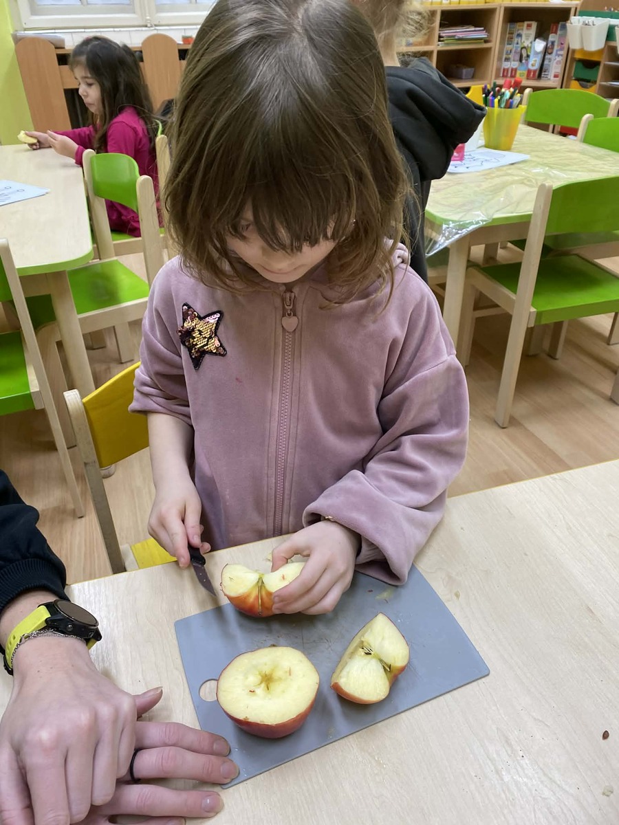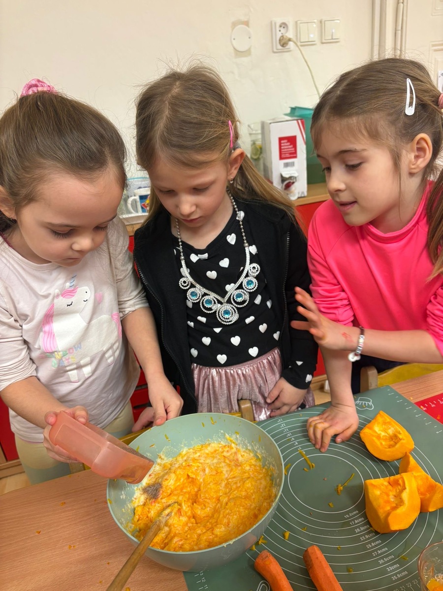 Vitamínový týden nebyl jen o jídle, ale i o tvořivosti a objevování. Děti malovaly řepou, vyráběly tiskátka z citronu a s nadšením se pustily i do netradiční činnosti – rozbíjení kokosového ořechu, které pro ně bylo velkým dobrodružstvím. Společně jsme si také upekli dýňovo-mrkvovou bábovku, která se setkala s velkým ohlasem.