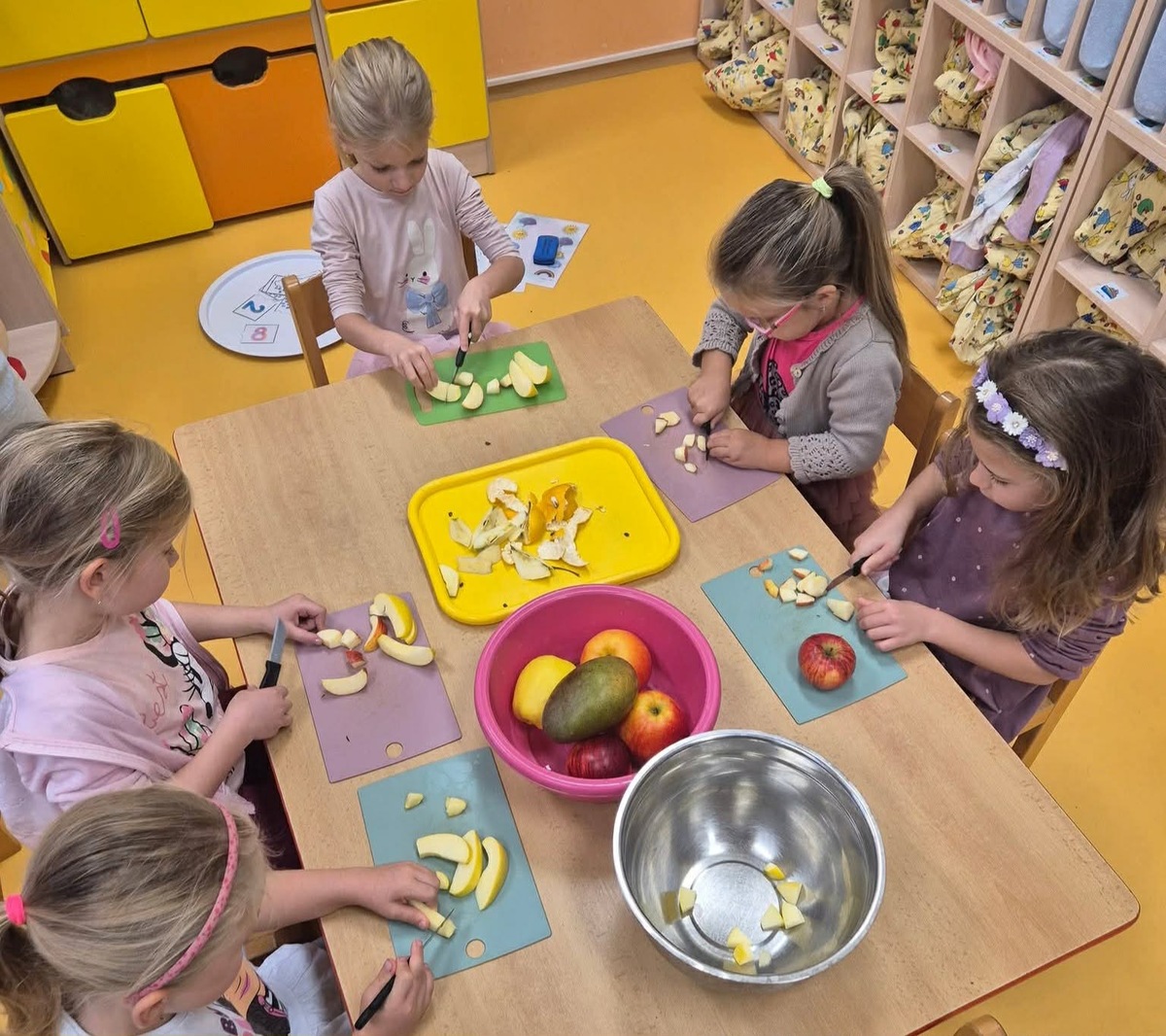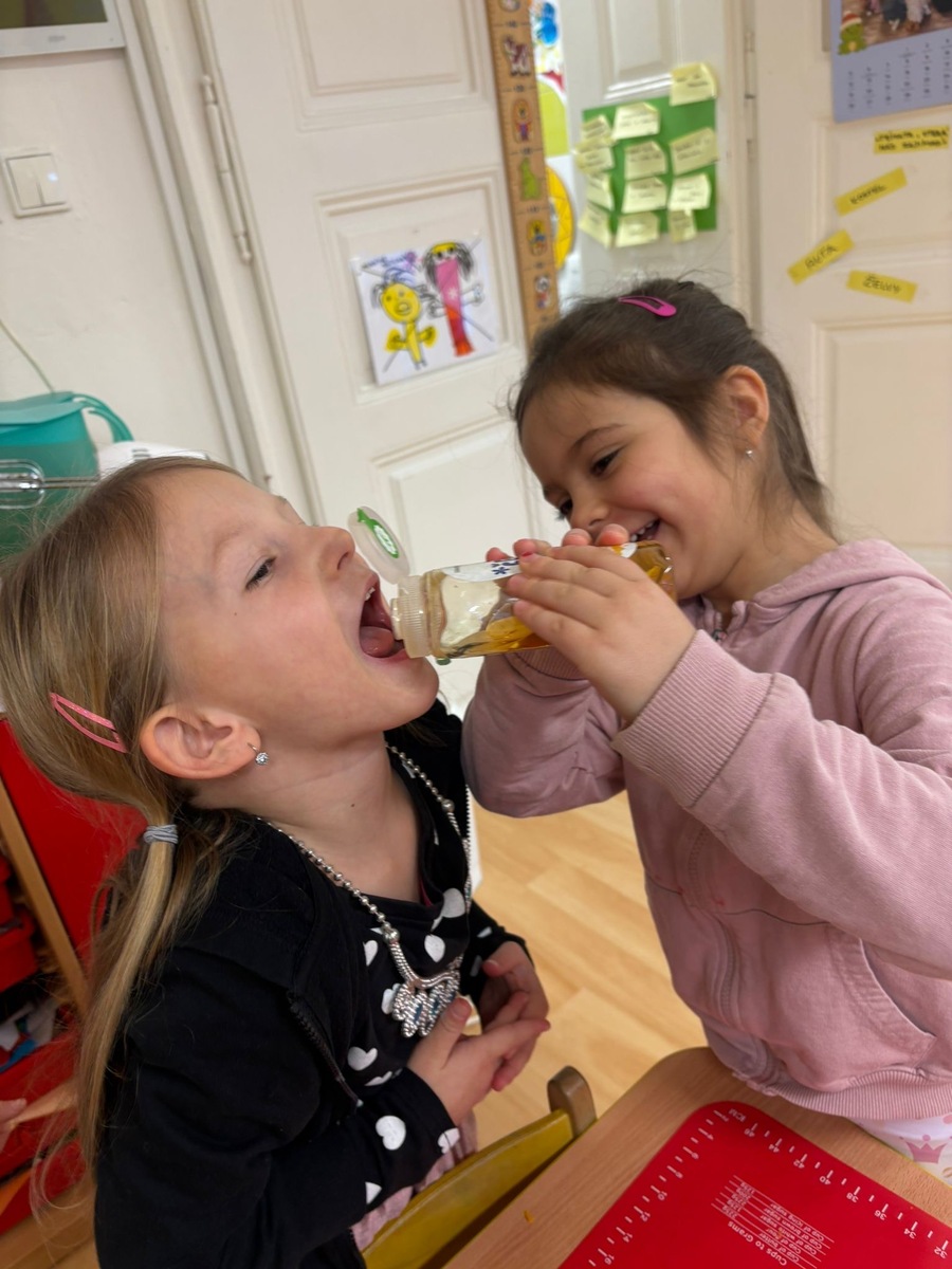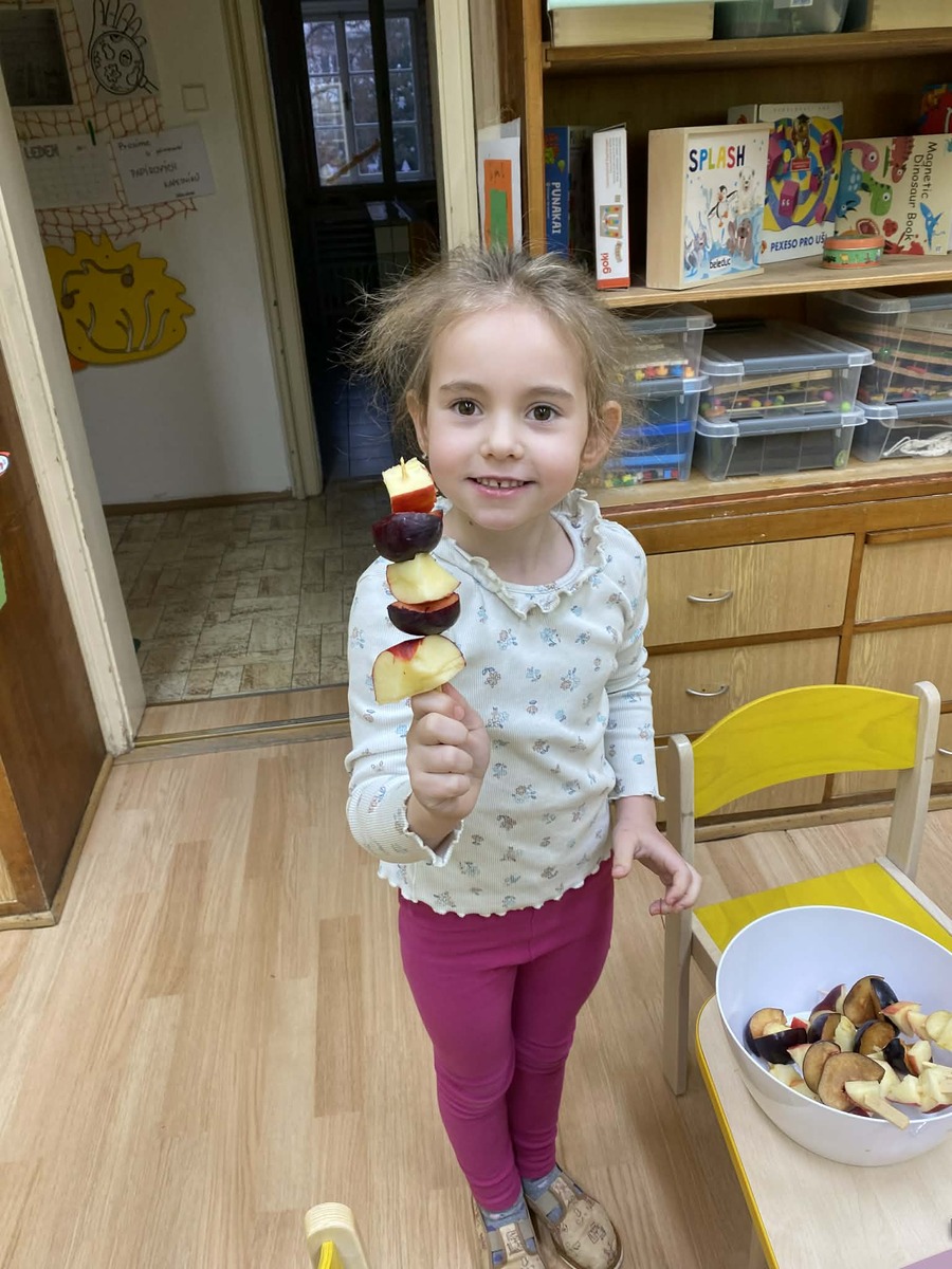 Děti se aktivně zapojily do všech činností a díky spolupráci s rodiči, kteří přinesli širokou škálu ovoce a zeleniny, jsme měli každý den k dispozici pestrý výběr zdravých surovin. Společně jsme připravovali ovocné špízy, lisovali čerstvé šťávy z ovoce i zeleniny, vyráběli zeleninové chipsy, sušili ovoce a zkoušeli ochutnávky „poslepu“. Velký úspěch měly také domácí želé bonbony z ovocné šťávy.