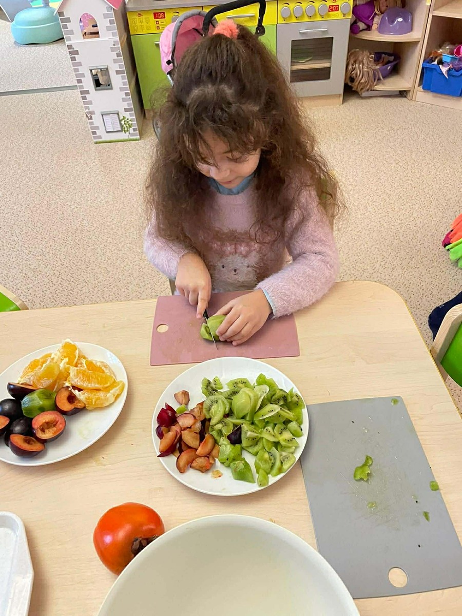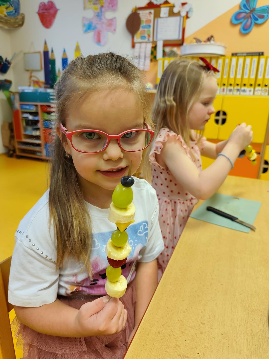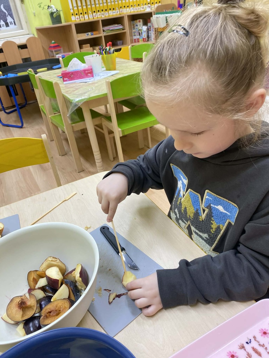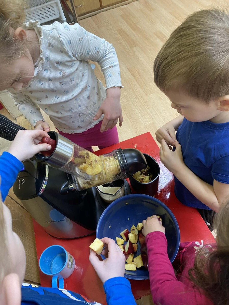 Děti se aktivně zapojily do všech činností a díky spolupráci s rodiči, kteří přinesli širokou škálu ovoce a zeleniny, jsme měli každý den k dispozici pestrý výběr zdravých surovin. Společně jsme připravovali ovocné špízy, lisovali čerstvé šťávy z ovoce i zeleniny, vyráběli zeleninové chipsy, sušili ovoce a zkoušeli ochutnávky „poslepu“. Velký úspěch měly také domácí želé bonbony z ovocné šťávy.