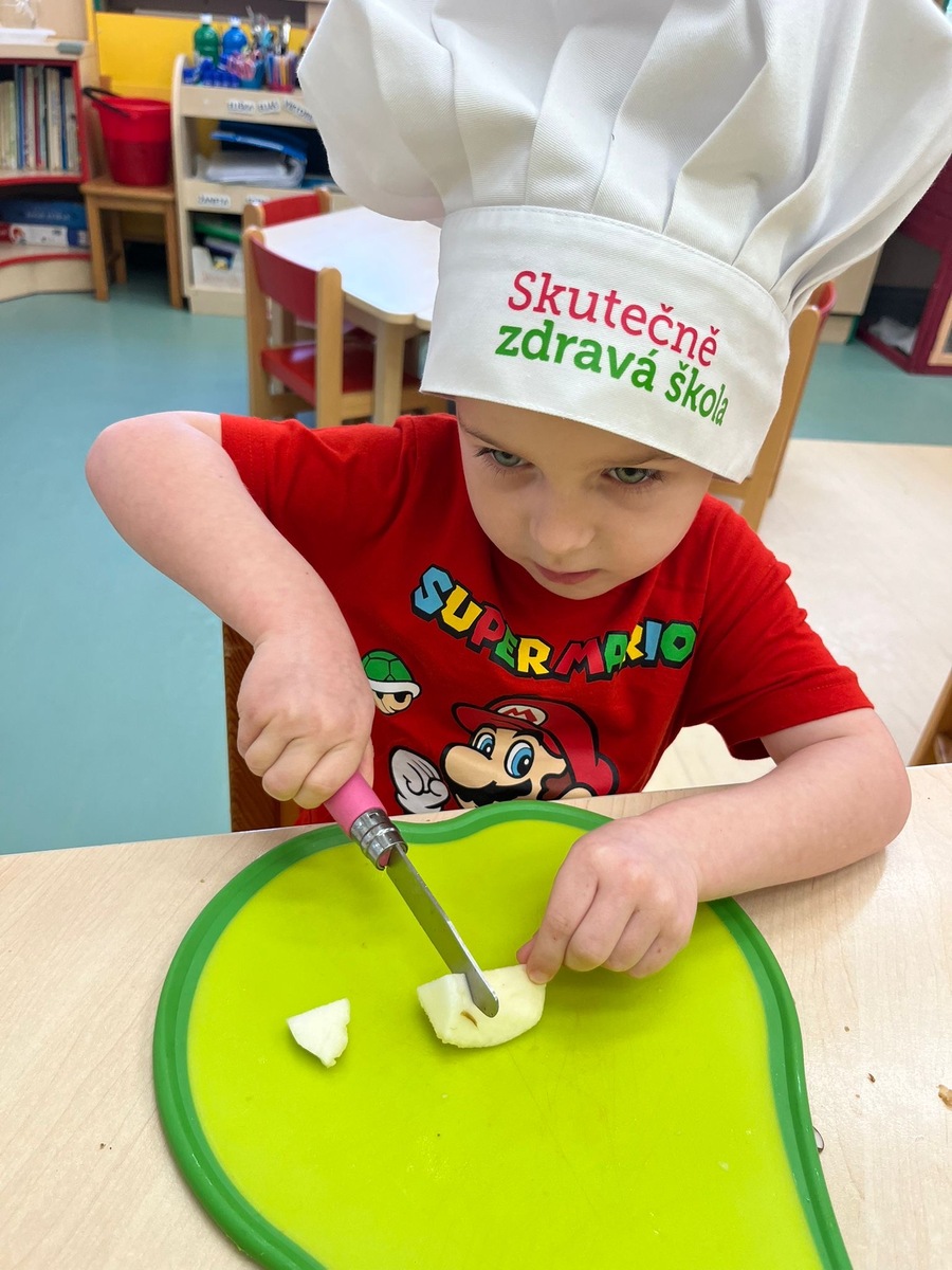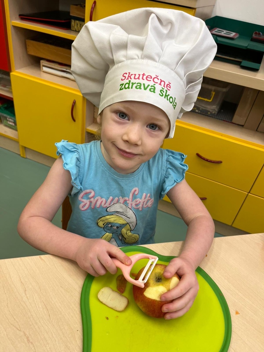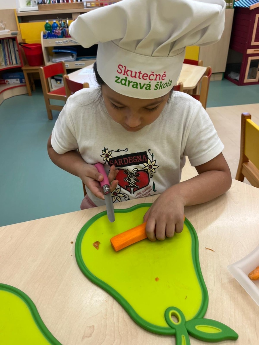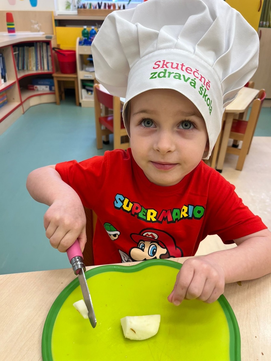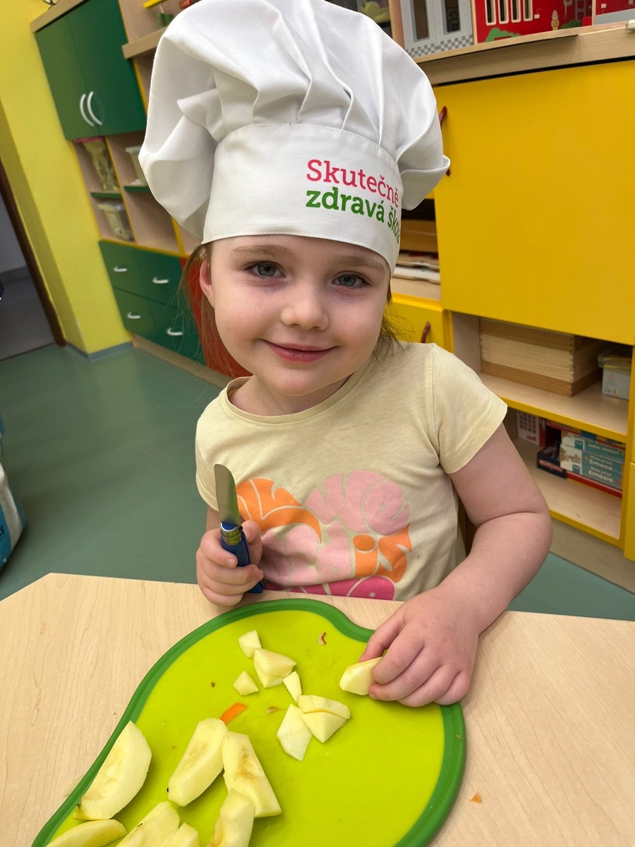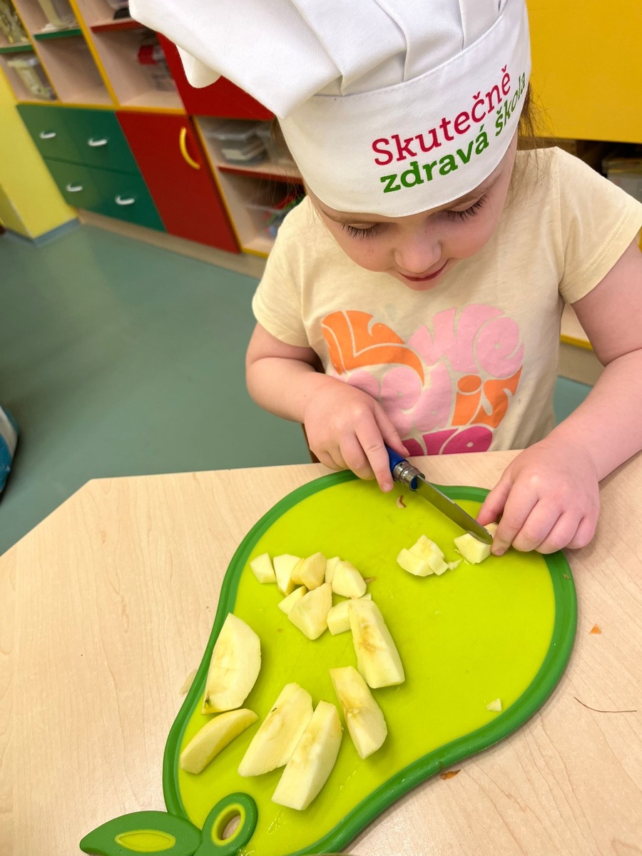 Děti si dnes v rámci doplňkové aktivity: KUCHTÍK , připravily vlastní přesnídávku se sezonních a farmářských potraviny (jablko a mrkev). Bez dochucováni bez barviv i sladidel. Víme, co jíme i odkud jídlo pochází.