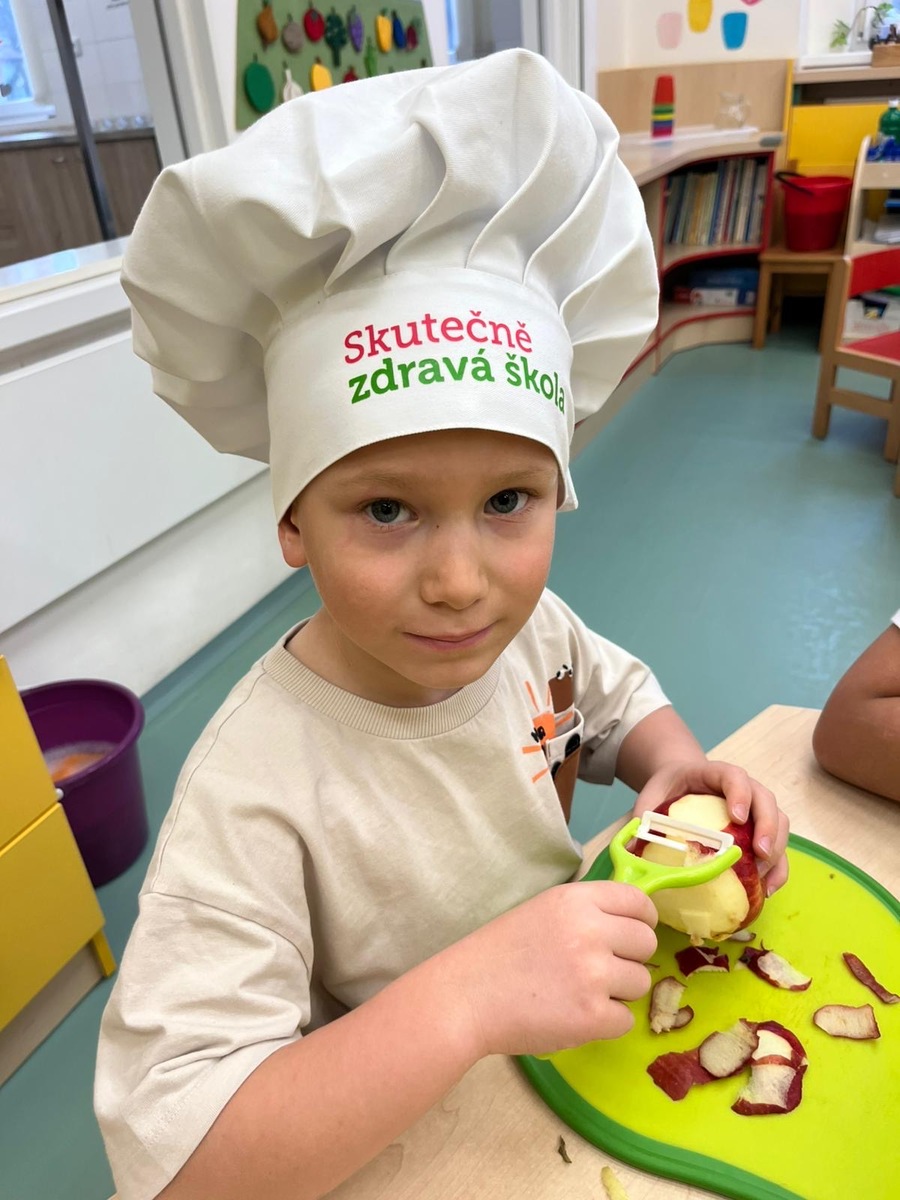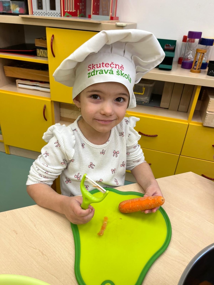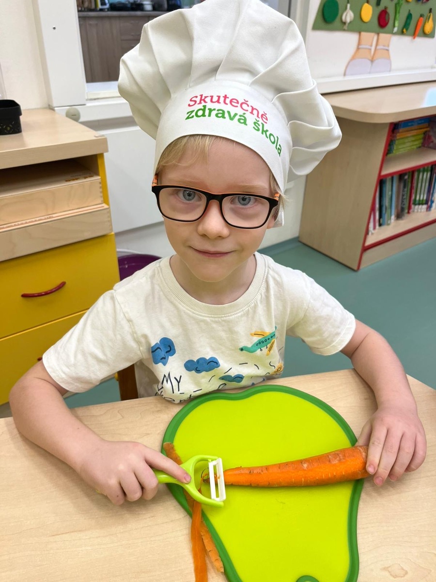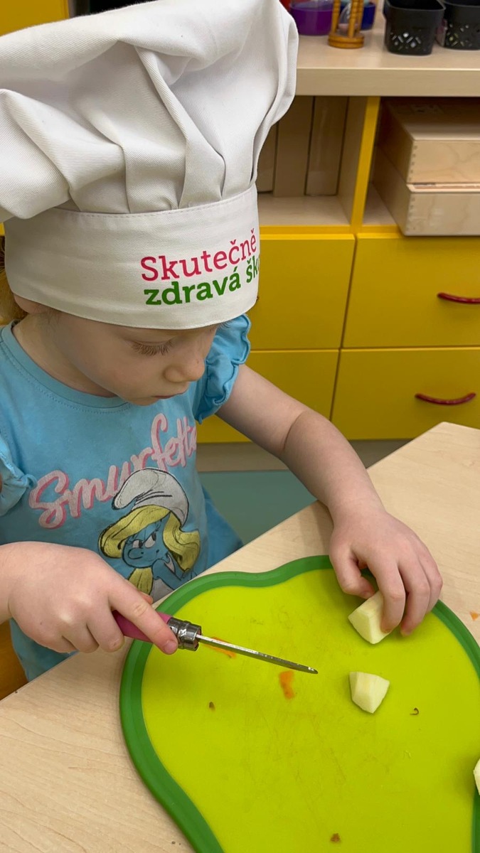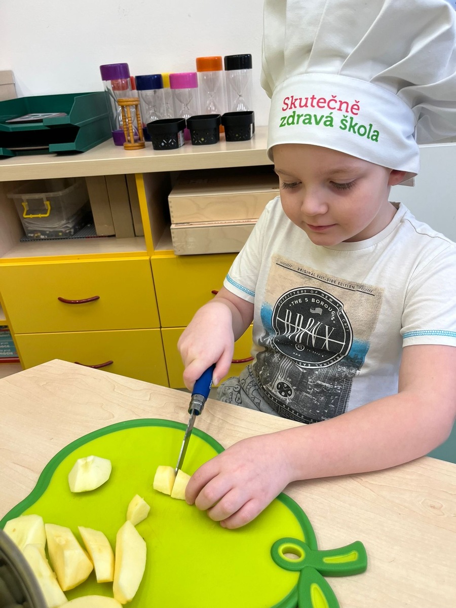 Děti si dnes v rámci doplňkové aktivity: KUCHTÍK , připravily vlastní přesnídávku se sezonních a farmářských potraviny (jablko a mrkev). Bez dochucováni bez barviv i sladidel. Víme, co jíme i odkud jídlo pochází.