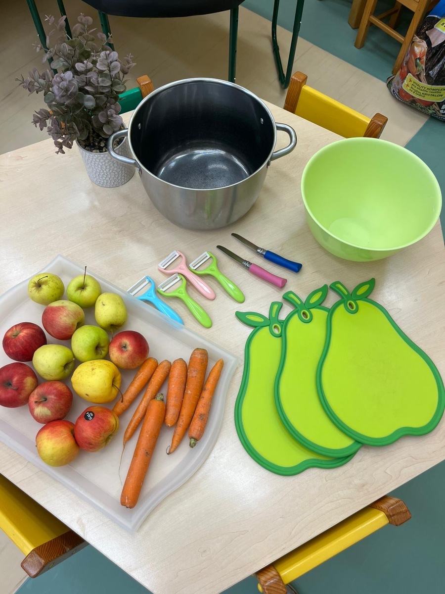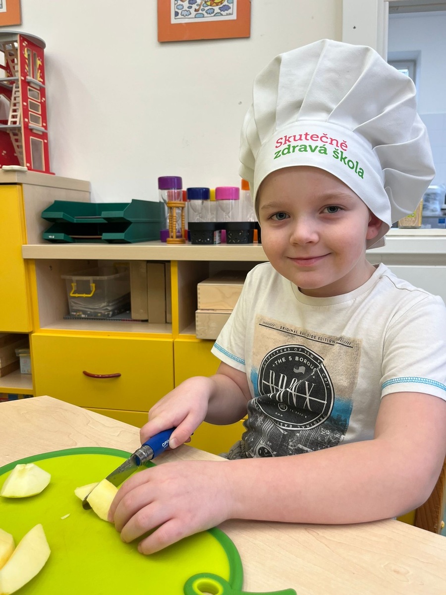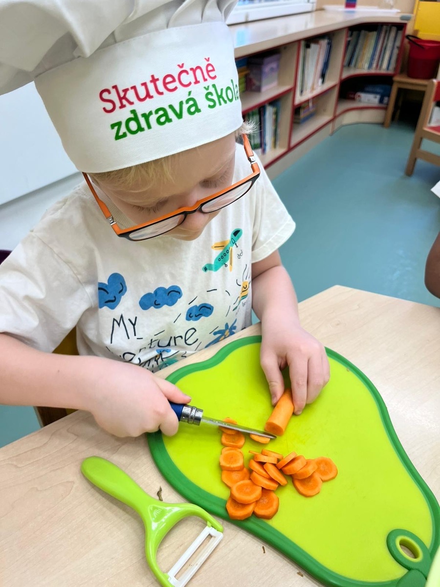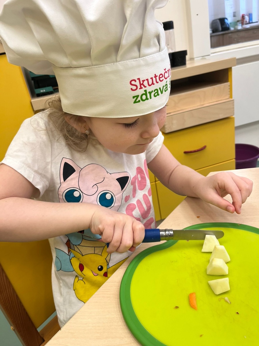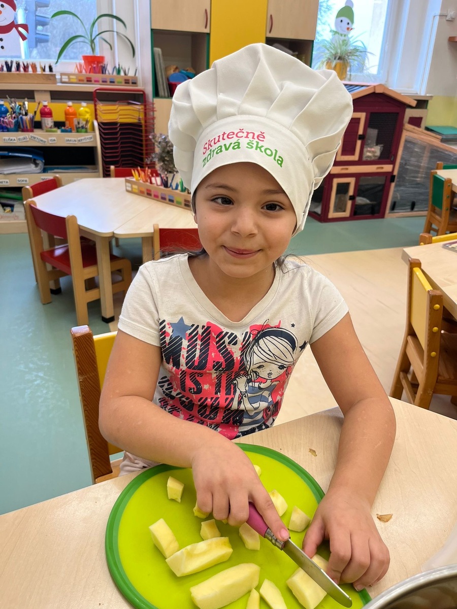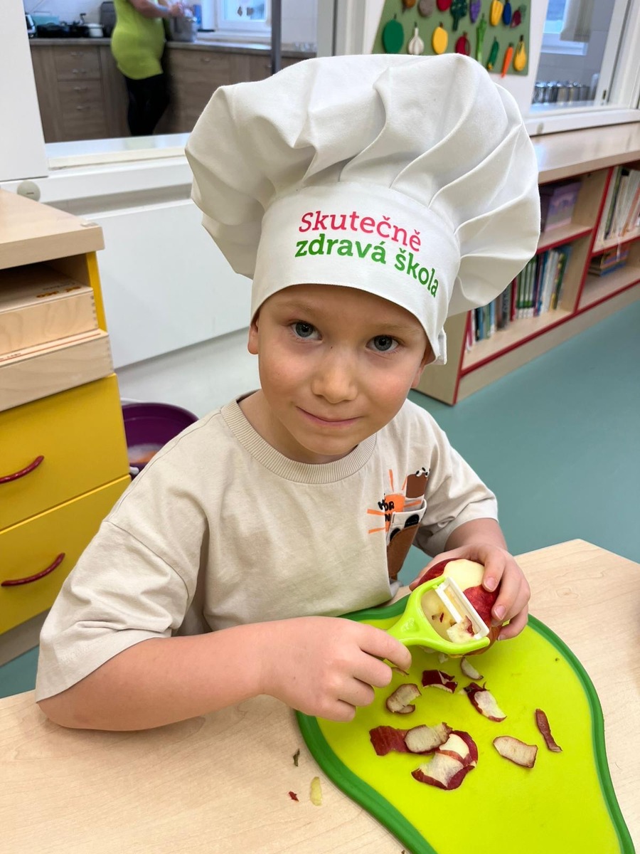 Děti si dnes v rámci doplňkové aktivity: KUCHTÍK , připravily vlastní přesnídávku se sezonních a farmářských potraviny (jablko a mrkev). Bez dochucováni bez barviv i sladidel. Víme, co jíme i odkud jídlo pochází.
