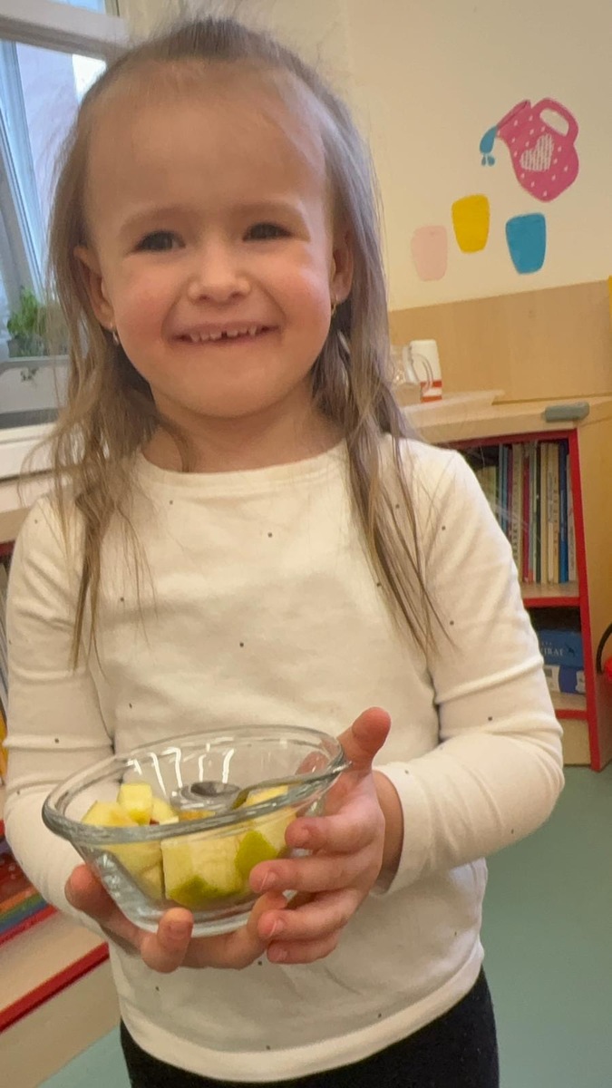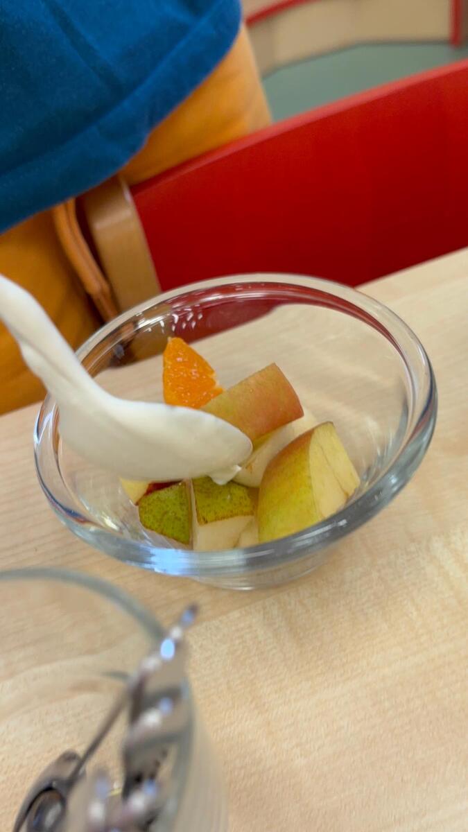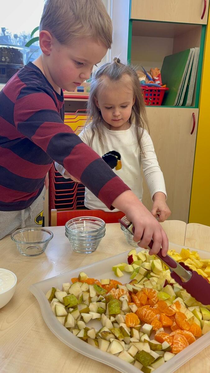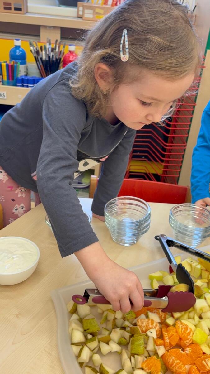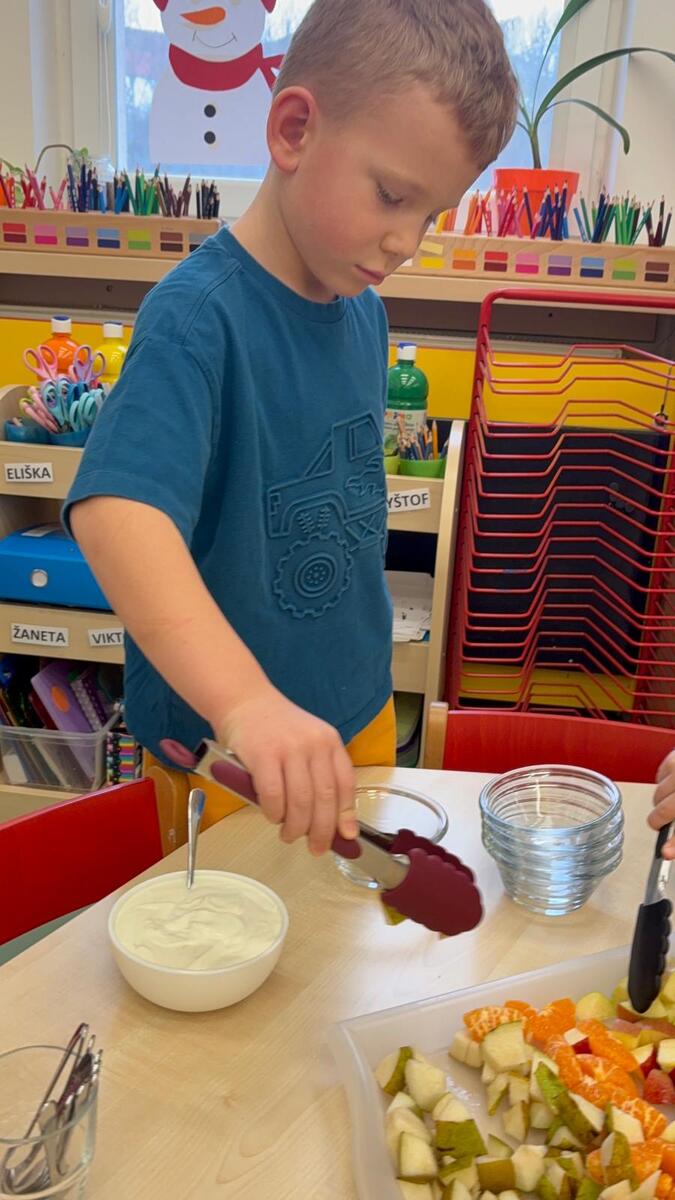 Vedeme děti k samostatnosti i odpovědnosti k jídlu. Děti si samy určují nejen velikost, ale i složení své porce v podobě ovocného salátu se smetanou. Věříte, že takhle to dětem chutná o mnoho více?