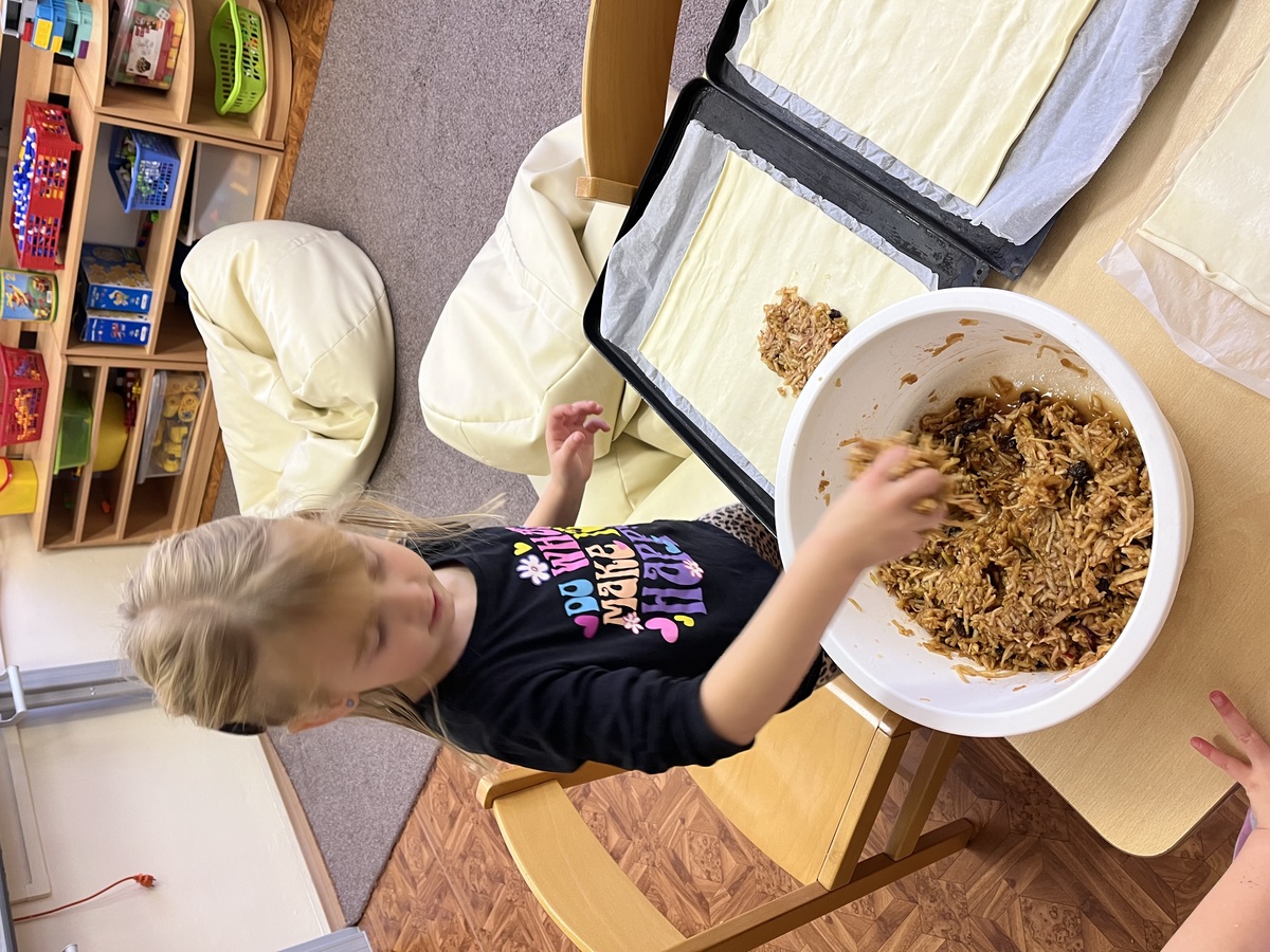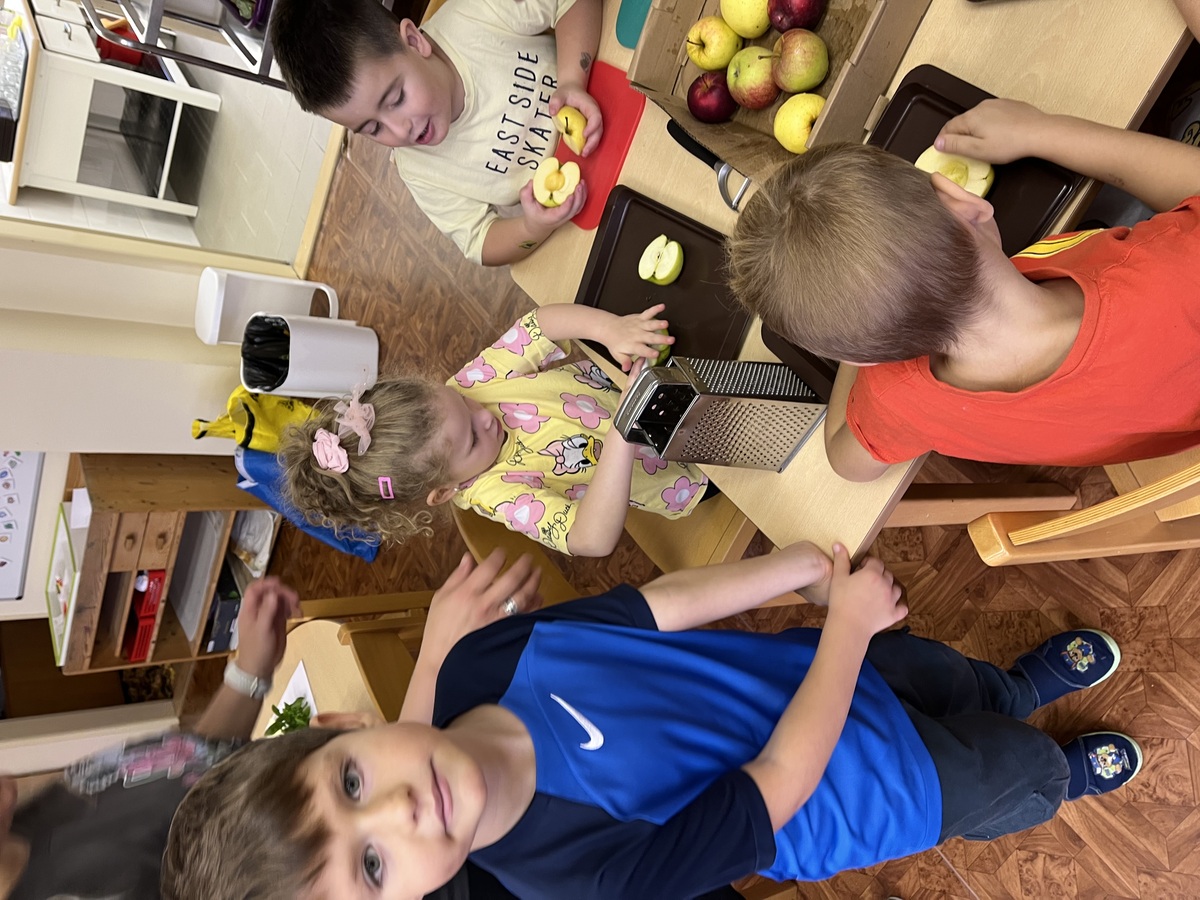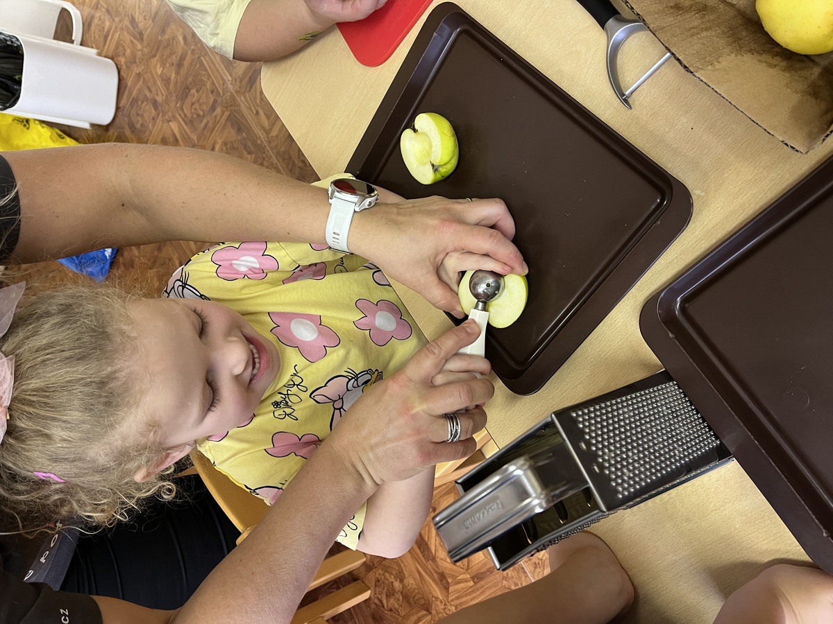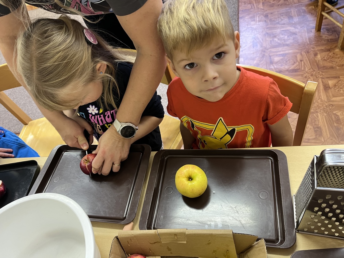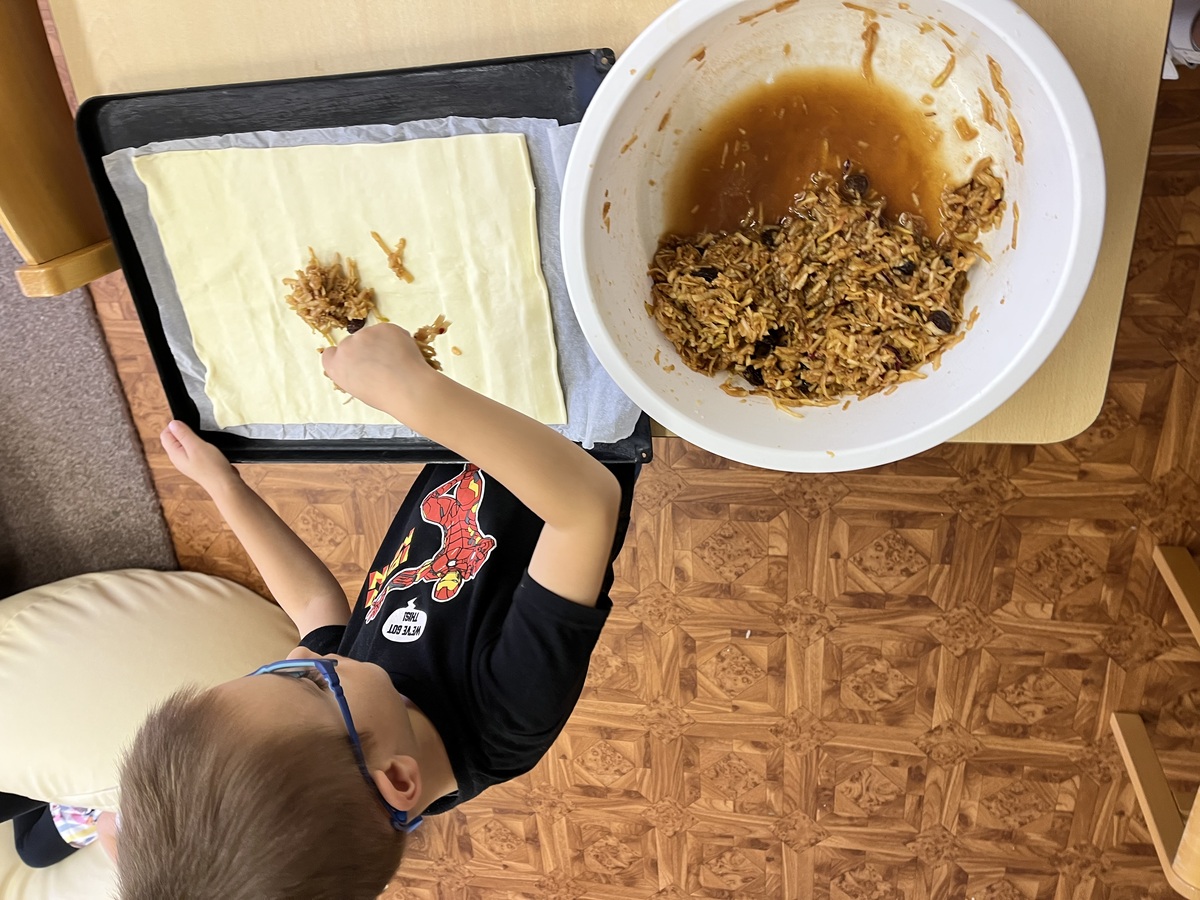 Děti měly možnost zapojit se do celého procesu přípravy – jablka si nejprve prohlédly, osahaly, společně jsme si povídali o tom, kde rostou, jak chutnají a proč jsou pro naše tělo zdravá. Poté si děti vyzkoušely krájení za asistence dospělého, učily se manipulaci s nožem a dbaly na bezpečnost při práci. Společně jsme připravili náplň, rozložili těsto a děti se podílely i na samotném zavinování štrúdlu.