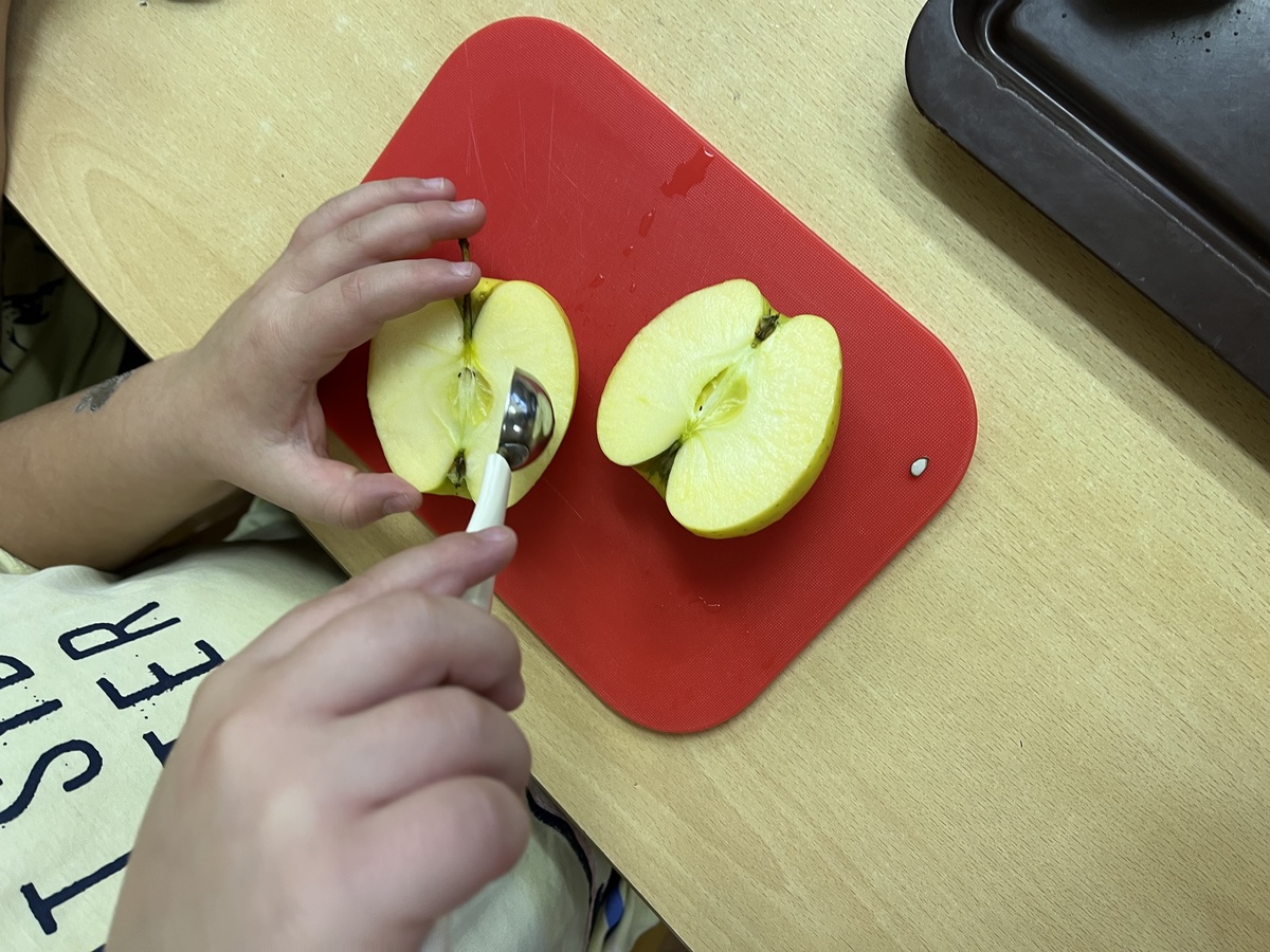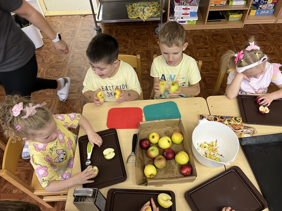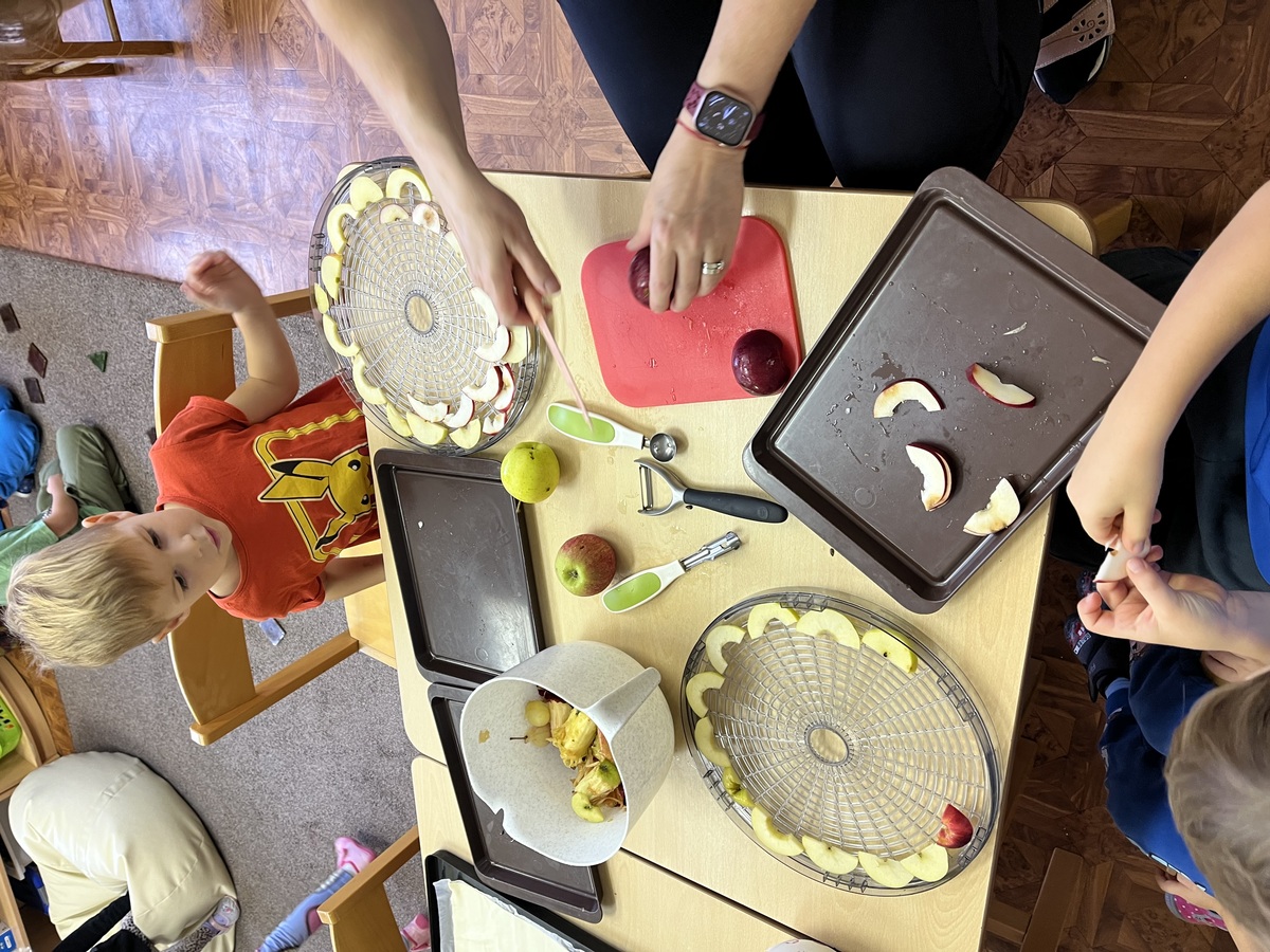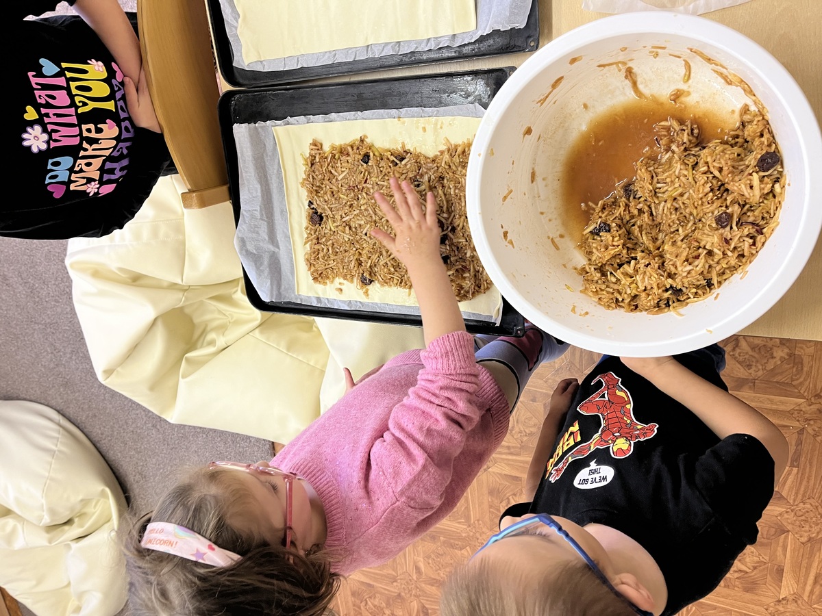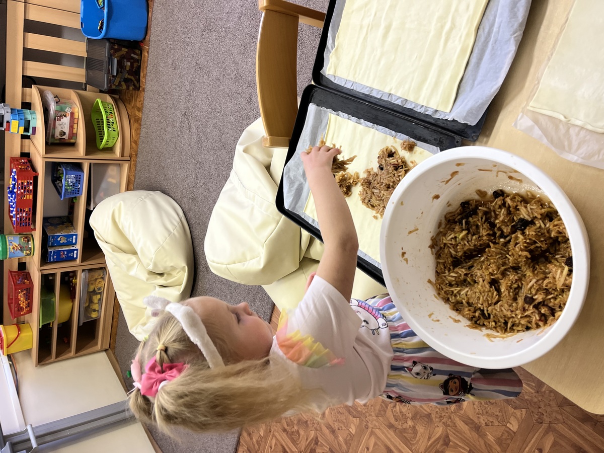 Děti měly možnost zapojit se do celého procesu přípravy – jablka si nejprve prohlédly, osahaly, společně jsme si povídali o tom, kde rostou, jak chutnají a proč jsou pro naše tělo zdravá. Poté si děti vyzkoušely krájení za asistence dospělého, učily se manipulaci s nožem a dbaly na bezpečnost při práci. Společně jsme připravili náplň, rozložili těsto a děti se podílely i na samotném zavinování štrúdlu.