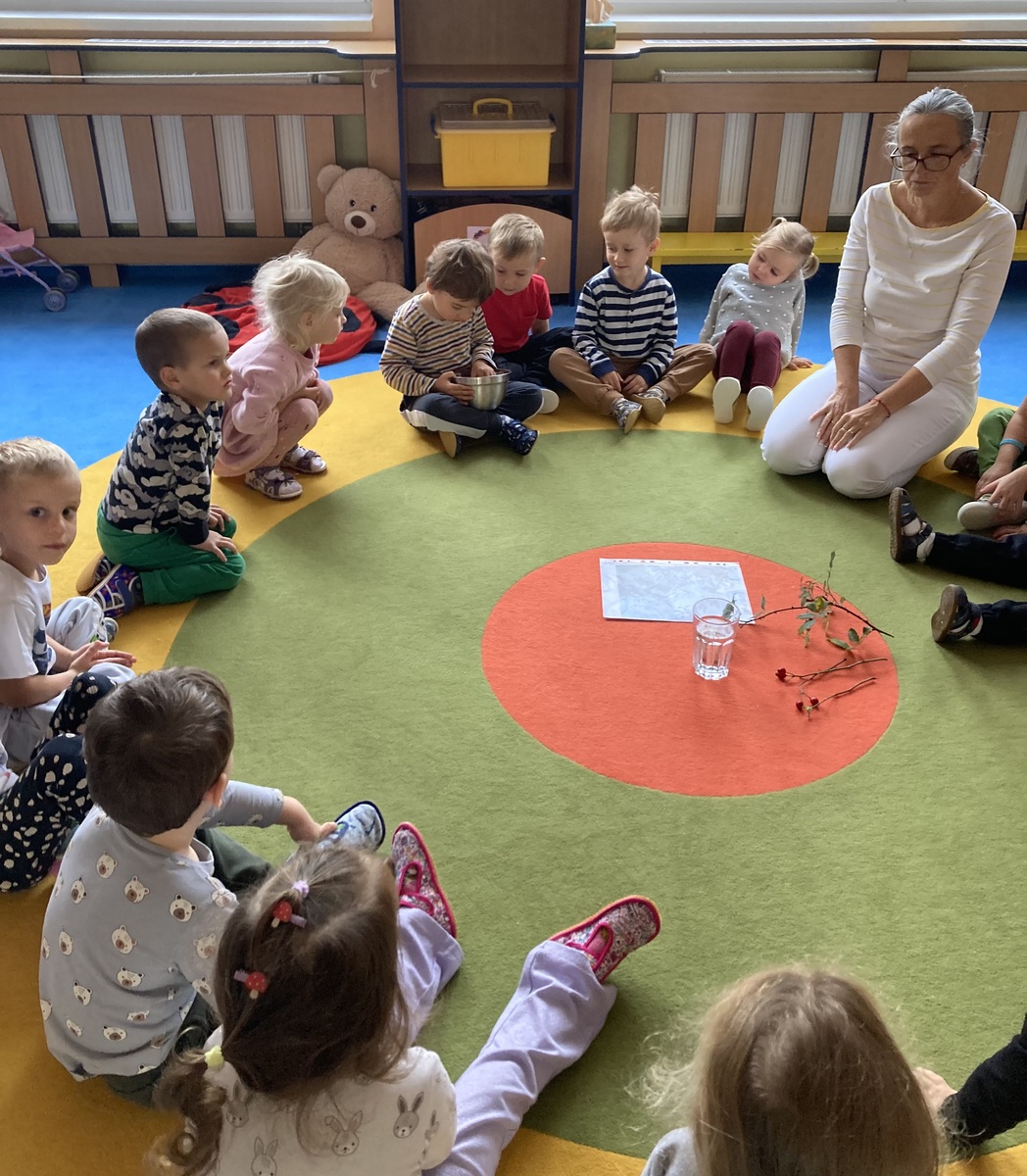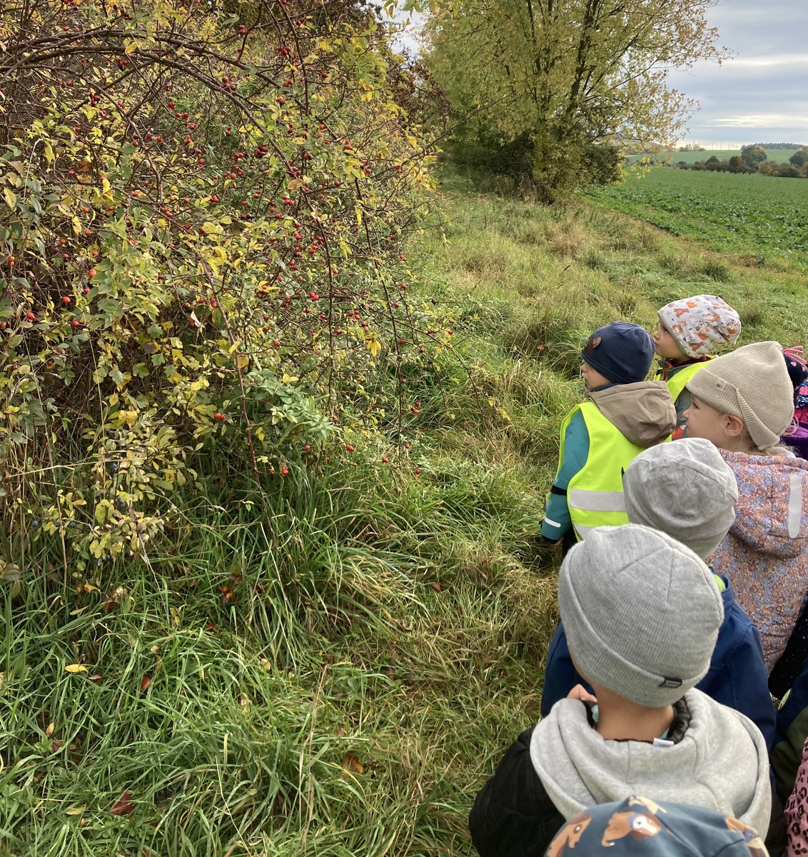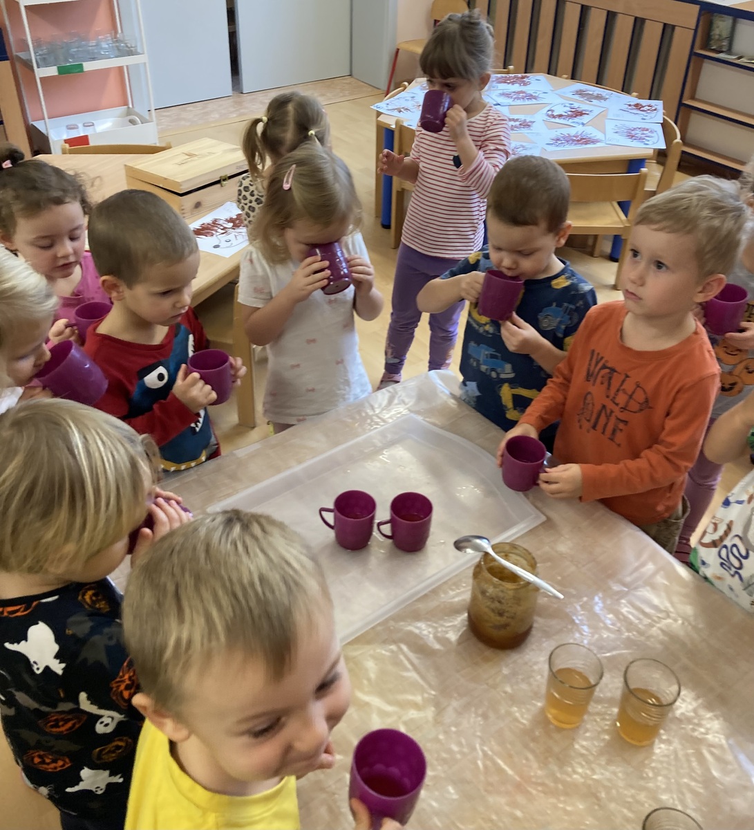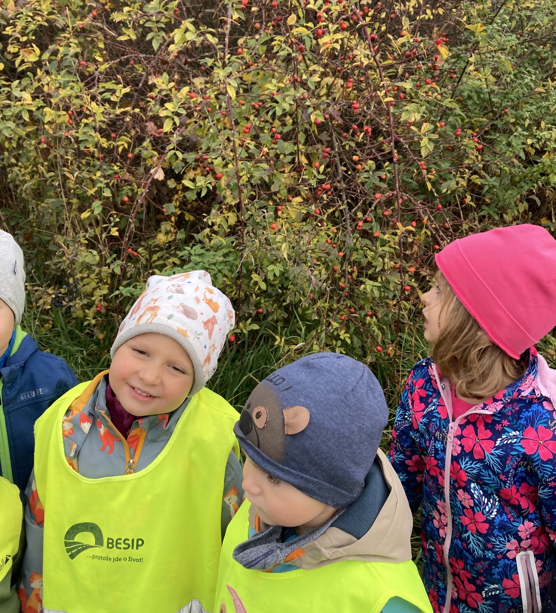 V měsíci říjnu jsme se vydali k šípkovému keři. Pověděli jsme si o rozdílu mezi stromem a keřem. Seznámili jsme se s plody, určili barvu a pověděli jsme si o užitečnosti plodů pro lidi a zvěř. Šípky jsme si natrhali a ve školce jsme ochutnali ze šípků čaj. Moc nám chutnal, přisladili jsme ho medem. Také jsme si povídali o vitamínech a prevenci proti nemocem.