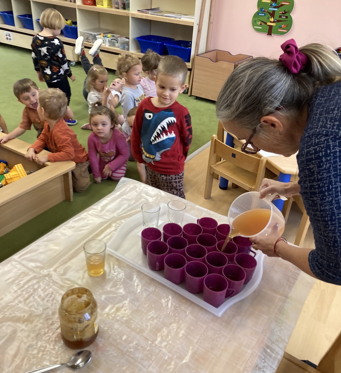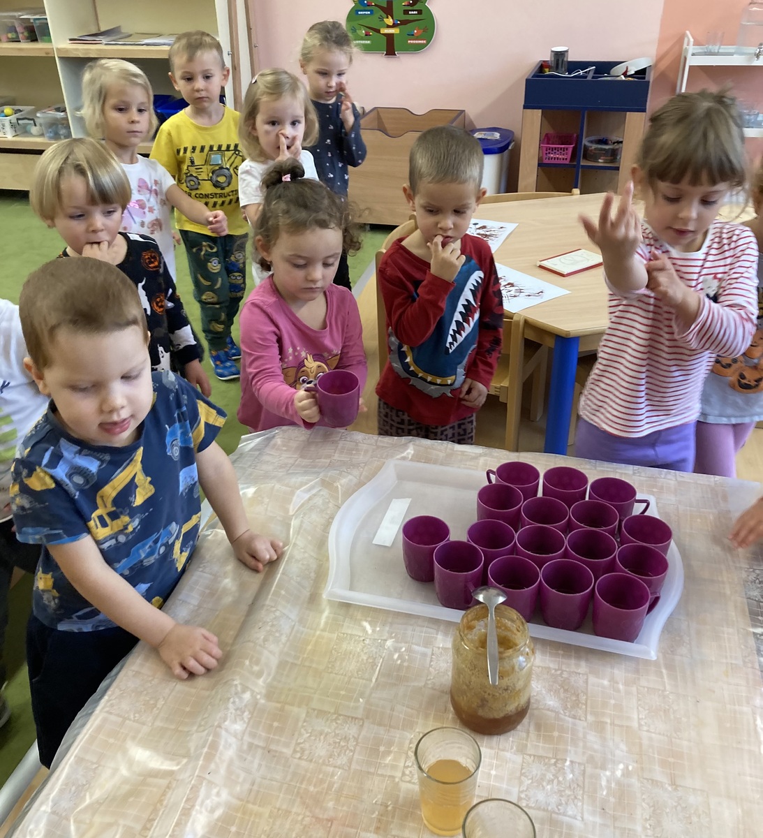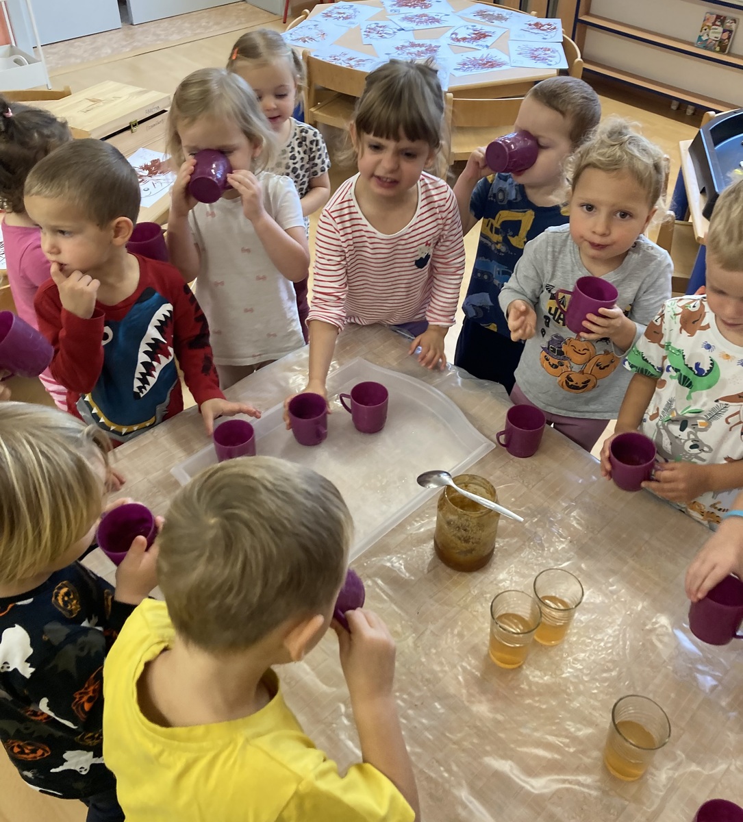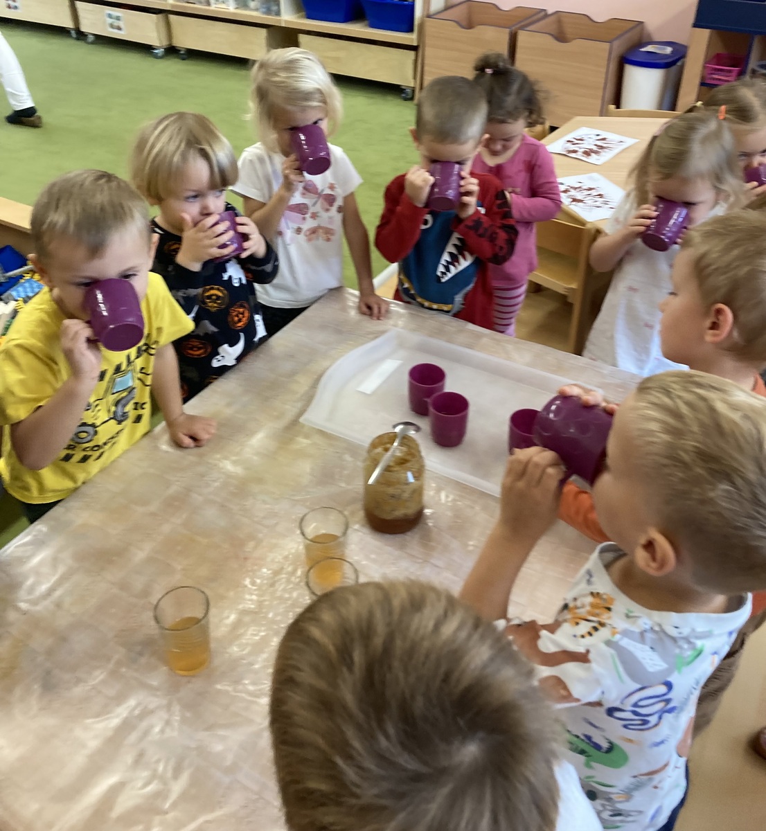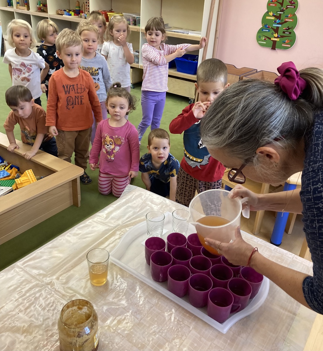 V měsíci říjnu jsme se vydali k šípkovému keři. Pověděli jsme si o rozdílu mezi stromem a keřem. Seznámili jsme se s plody, určili barvu a pověděli jsme si o užitečnosti plodů pro lidi a zvěř. Šípky jsme si natrhali a ve školce jsme ochutnali ze šípků čaj. Moc nám chutnal, přisladili jsme ho medem. Také jsme si povídali o vitamínech a prevenci proti nemocem.