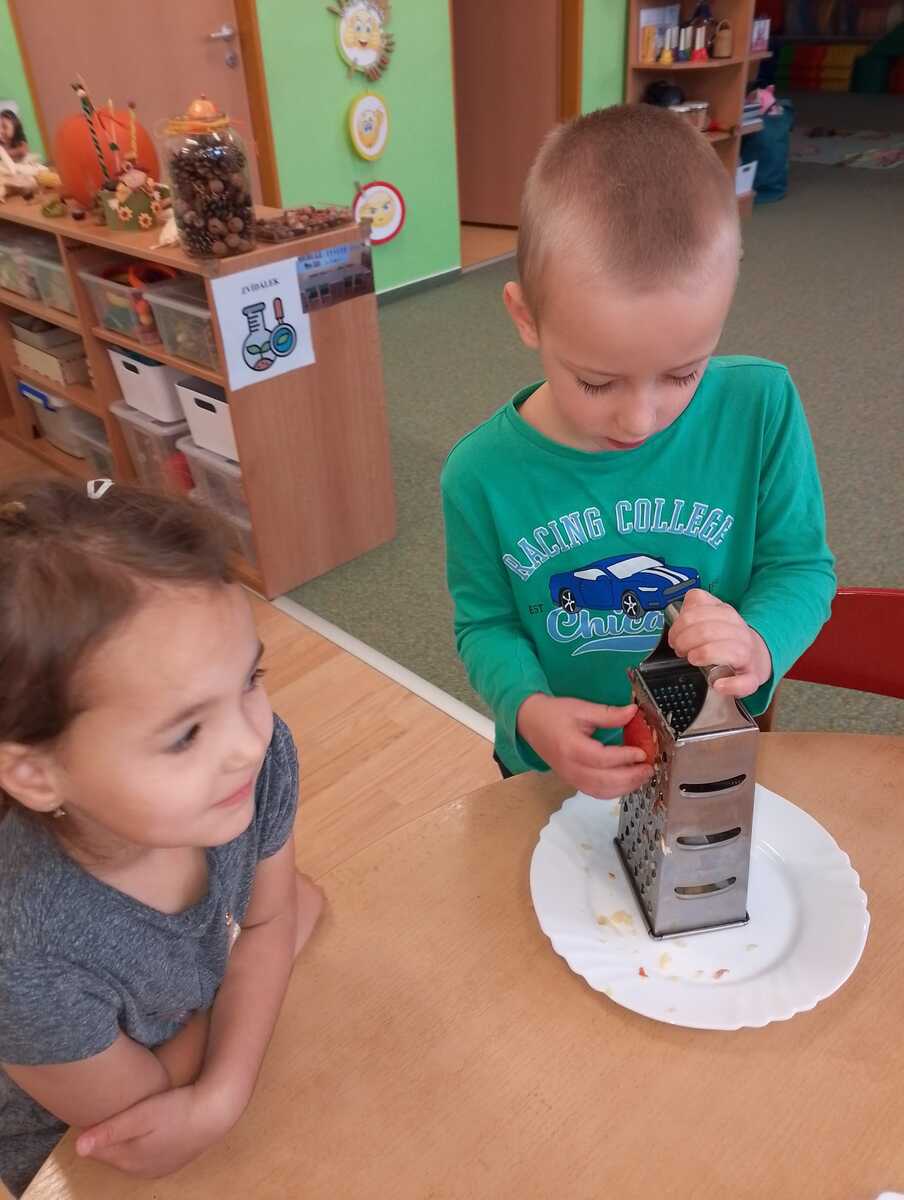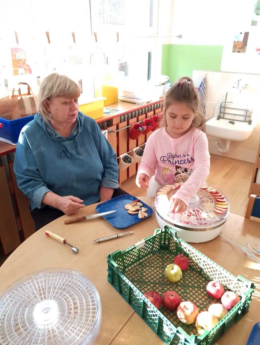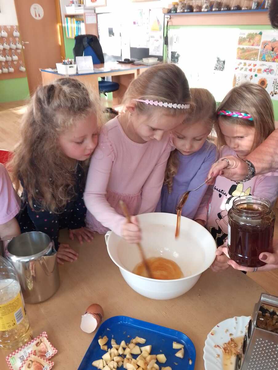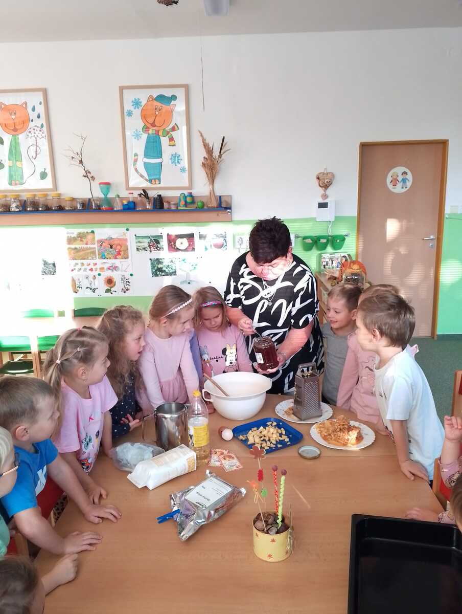 Na odpolední akci pro rodiče jsme vyráběli jablíčkový koláč. Koláč byl ze špaldové mouky, slazený medem a všem moc chutnal. Ze zbývajících jablíček jsme si nakrájeli a nasušili křížaly, abychom i v zimě mohli zdravě mlsat.
