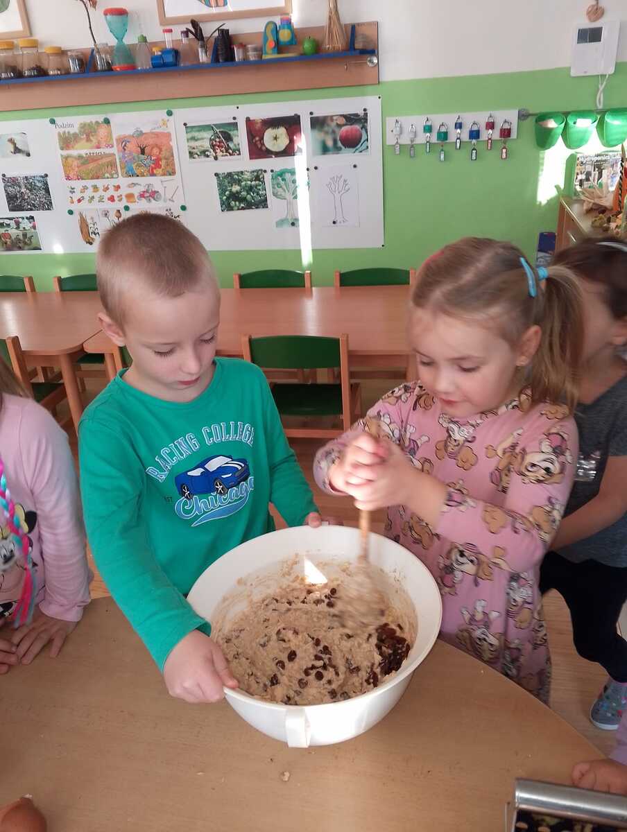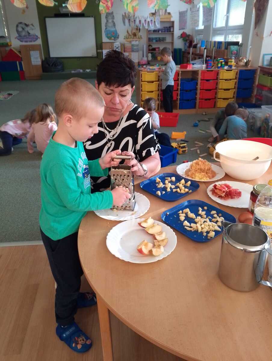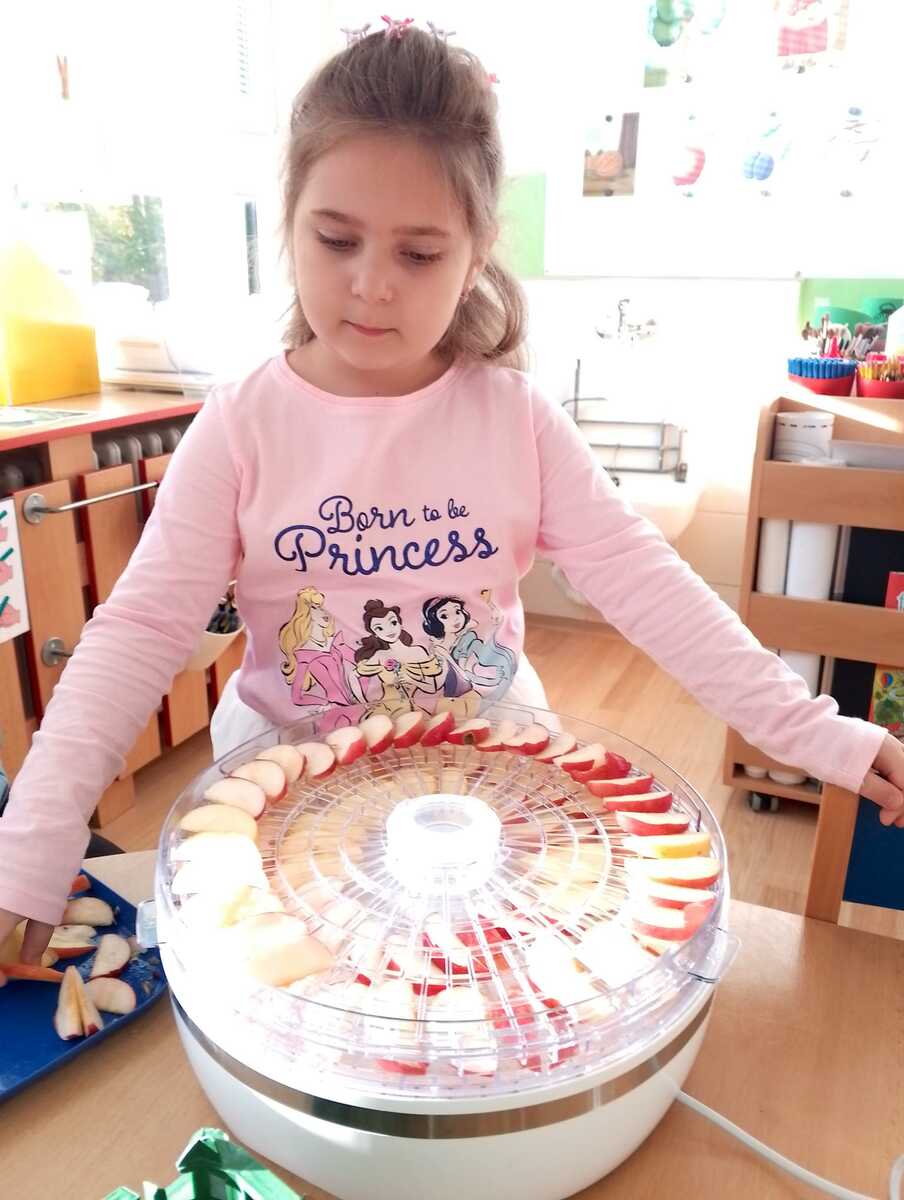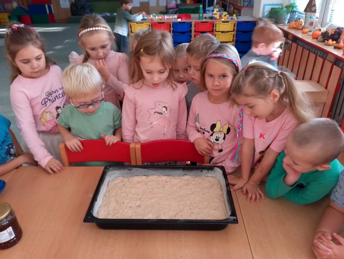 Na odpolední akci pro rodiče jsme vyráběli jablíčkový koláč. Koláč byl ze špaldové mouky, slazený medem a všem moc chutnal. Ze zbývajících jablíček jsme si nakrájeli a nasušili křížaly, abychom i v zimě mohli zdravě mlsat.