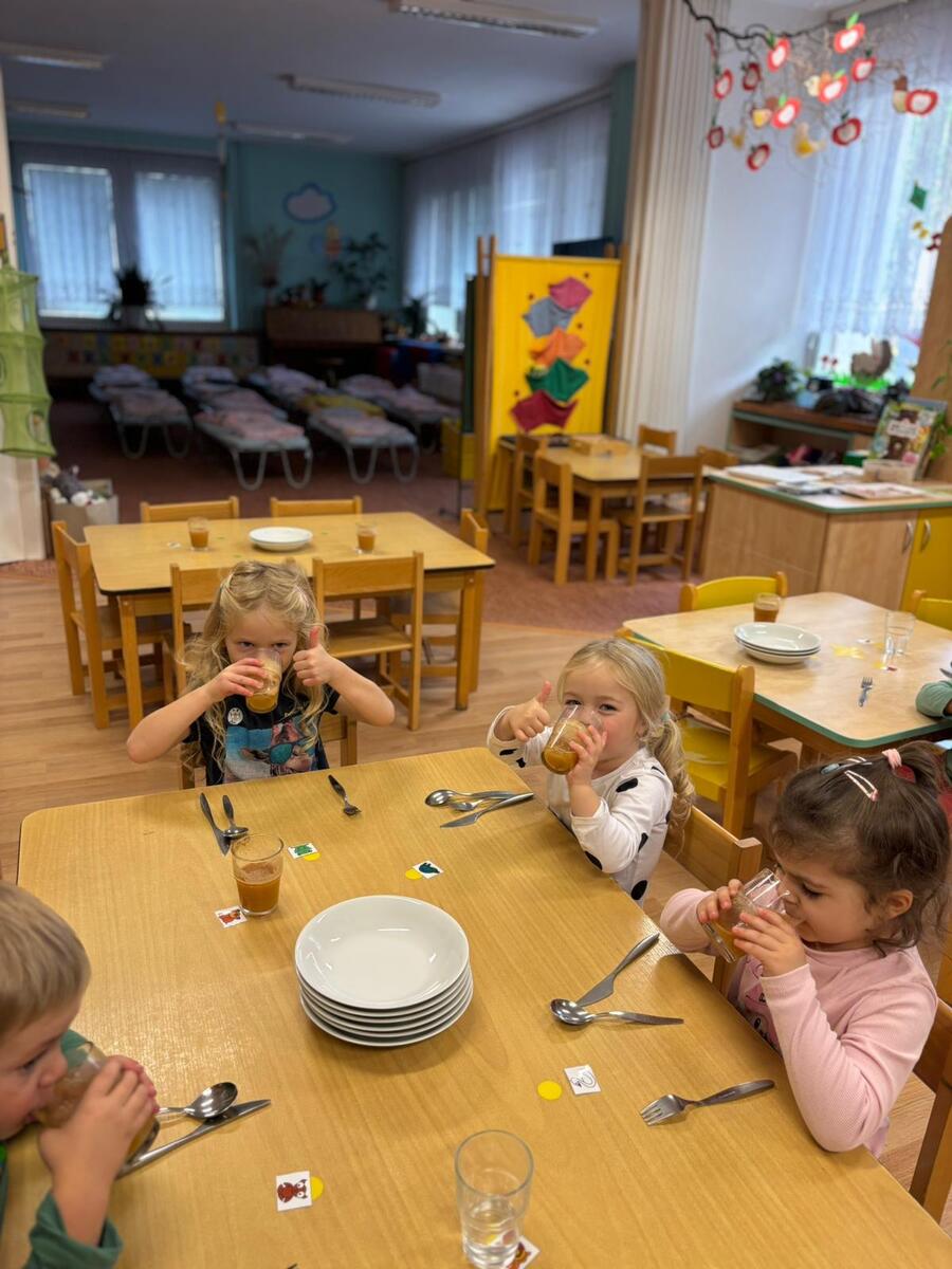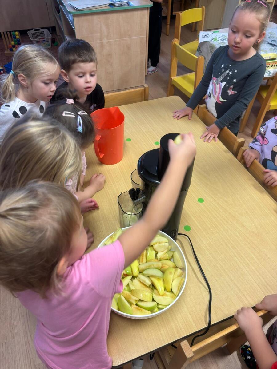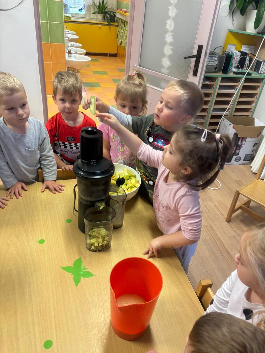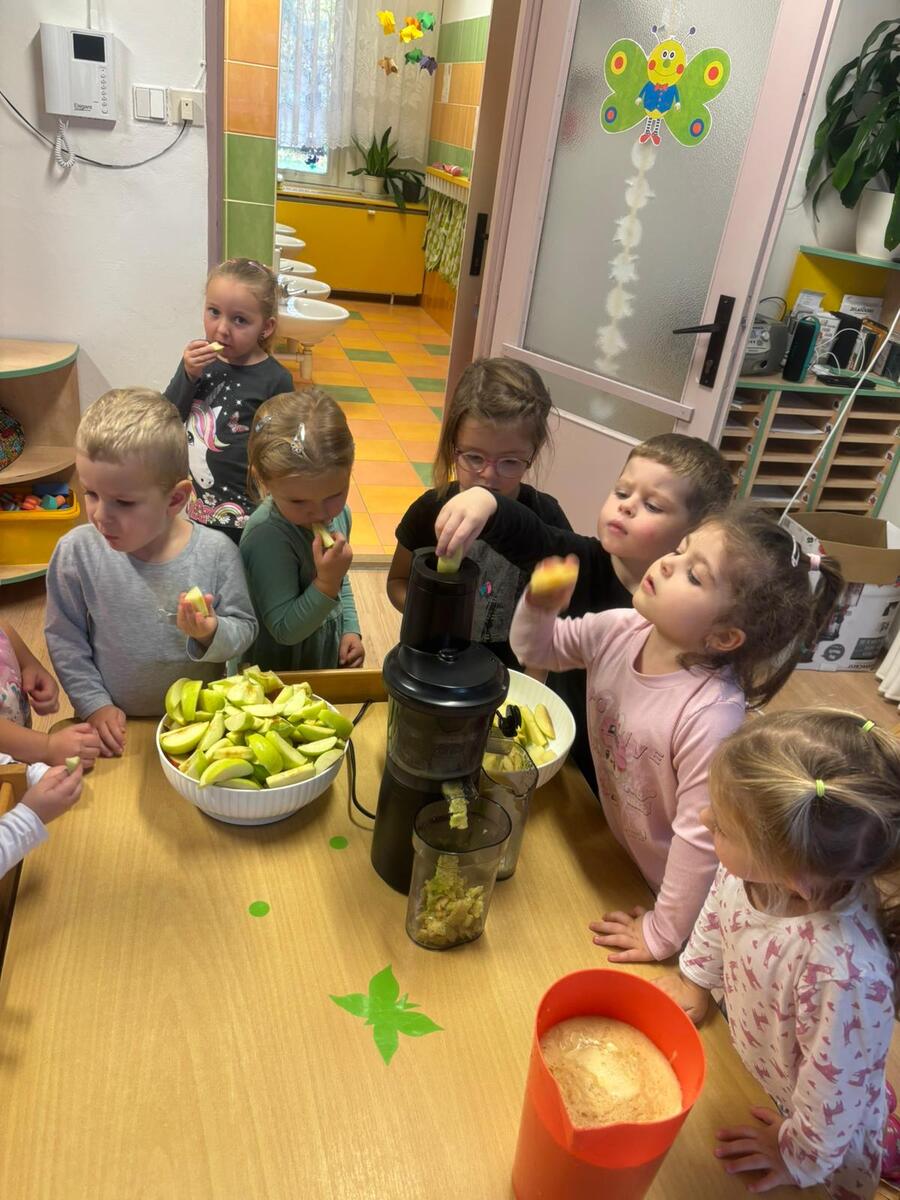 Ve třídě Motýlků se děti inspirovaly jablíčky a výrobky z podzimní sklizně - připravily si čerstvou šťávu na svačinku.