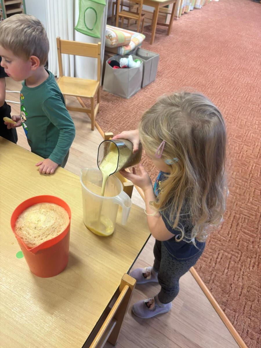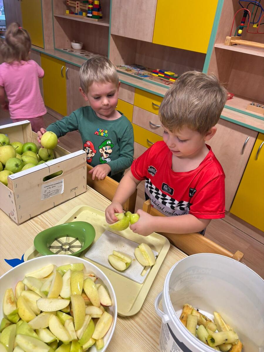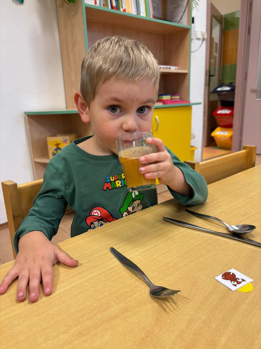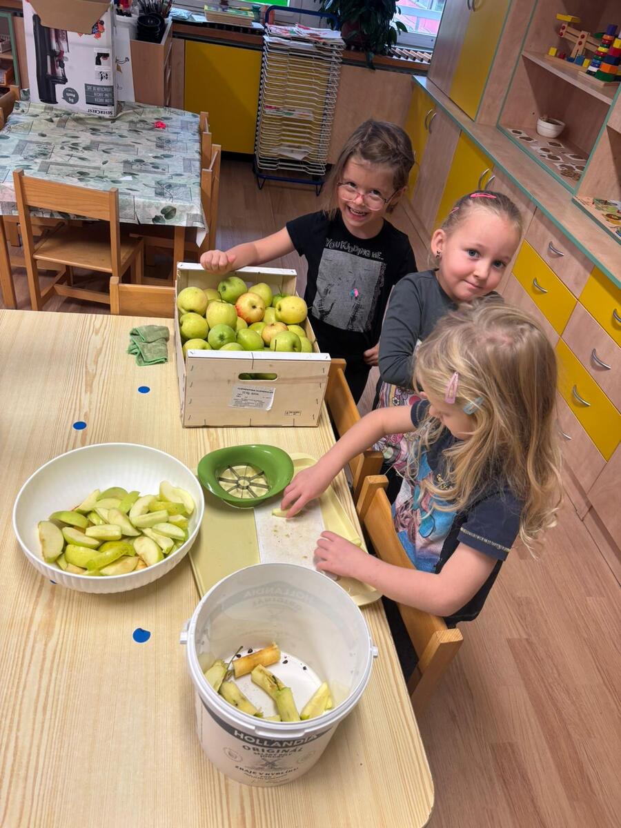 Ve třídě Motýlků se děti inspirovaly jablíčky a výrobky z podzimní sklizně - připravily si čerstvou šťávu na svačinku.