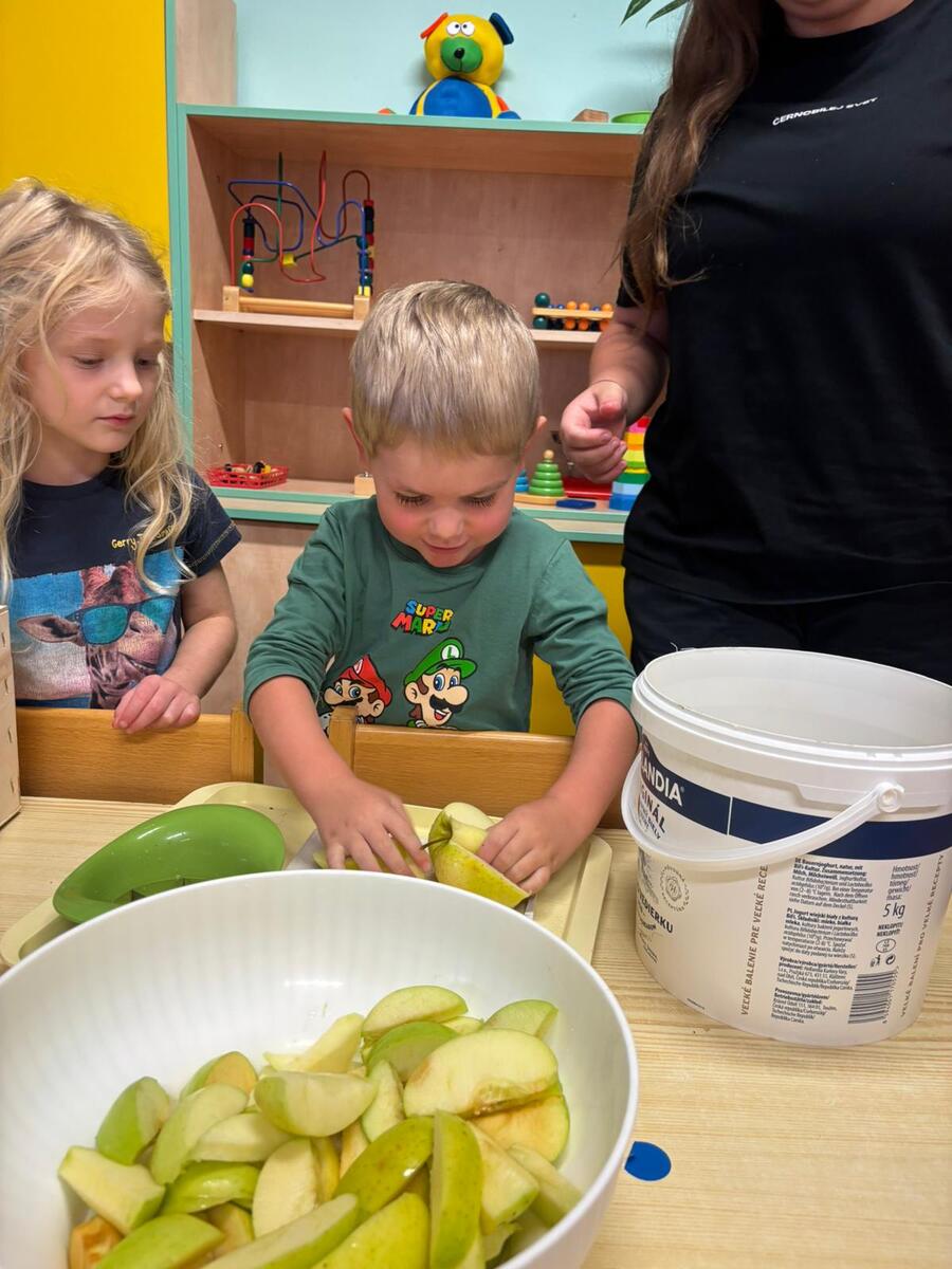 Ne každý má doma lis na ovoce či odšťavňovač, aby si mohl připravovat vždy čerstvou šťávu. Některé děti se tak setkaly s tímto kuchyňským pomocníkem vůbec poprvé. Společně se daly do přípravy jablíček tak, aby se vešly do zásobníku, a poté došlo na práci se samotným přístrojem. Dětem šla práce s odšťavňováním od ruky a čerstvý mošt byl brzy na světě. Opravdu se povedl a skvěle doplnil svačinku v naší školce.