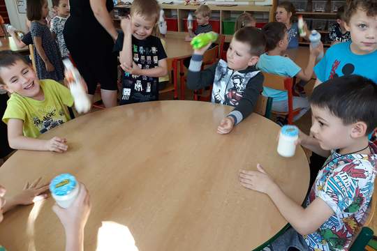 Na tomto pokusu si děti vyzkoušely, jak se dá doma udělat máslo a to pomocí šlehačky a láhve nebo nádoby, kde za pomocí třepání šlehačky, vytvořily hroudu másla a podmáslí. Opět měly možnost se seznámit s výrobou másla na interaktivní tabuli, kde shlédly výrobu másla v továrně a výrobu másla u našich předků.