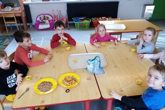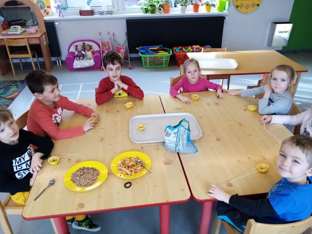 V rámci tématu "Jak se staráme o zvířátka v zimě" jsme si s dětmi vytvořily krmítka pro ptáčky, které byly z jablíček a dalších ingrediencí.