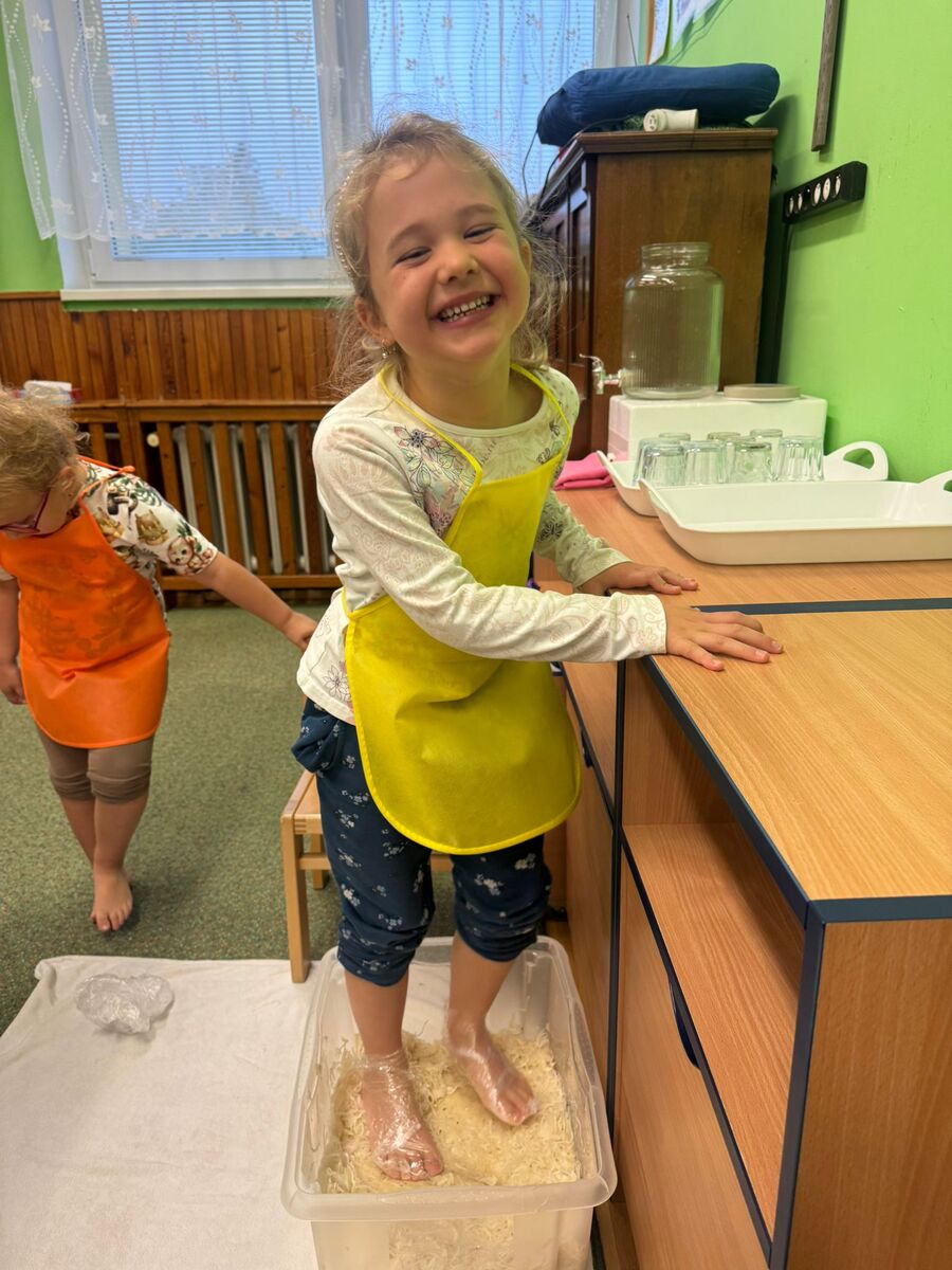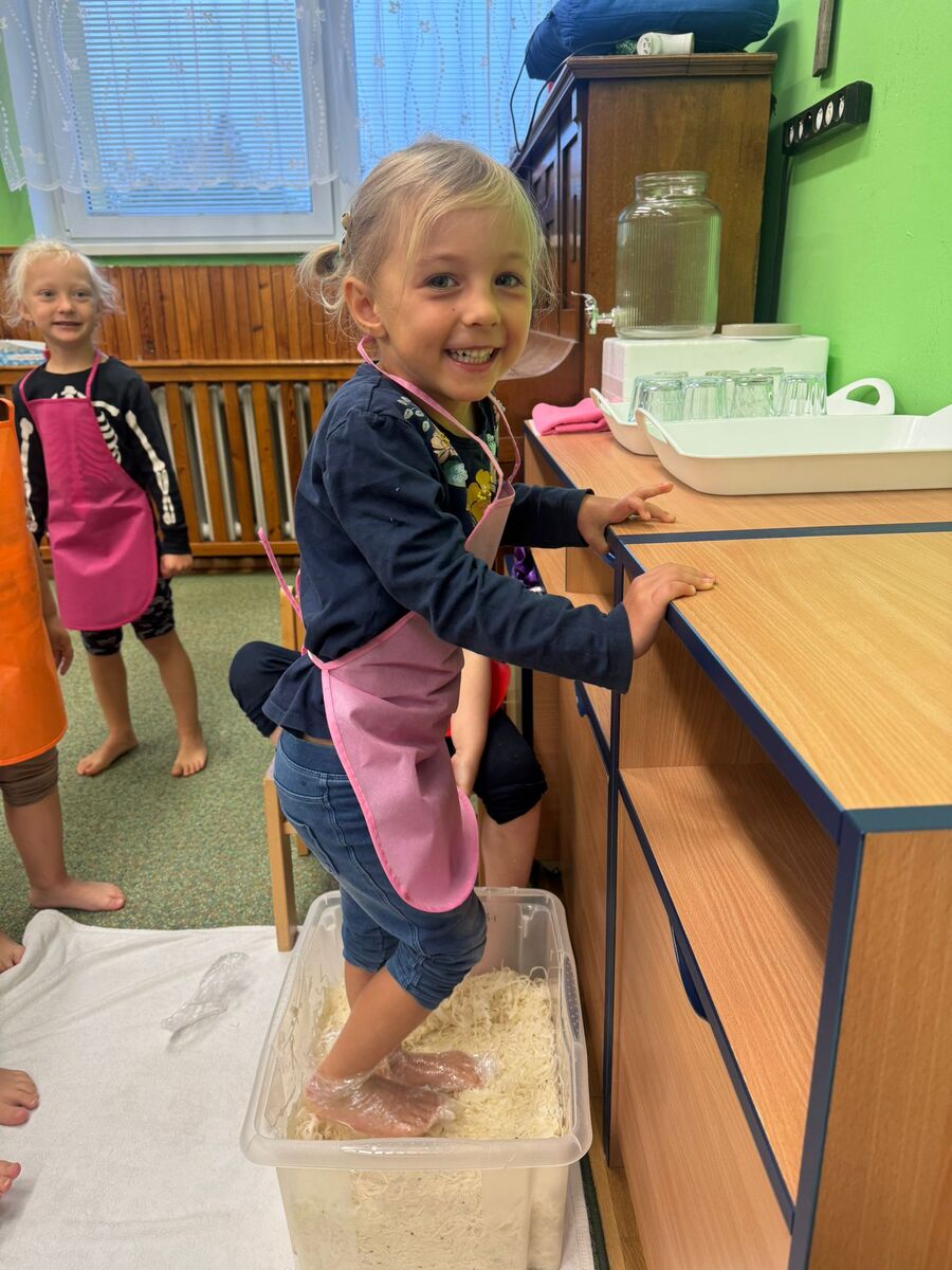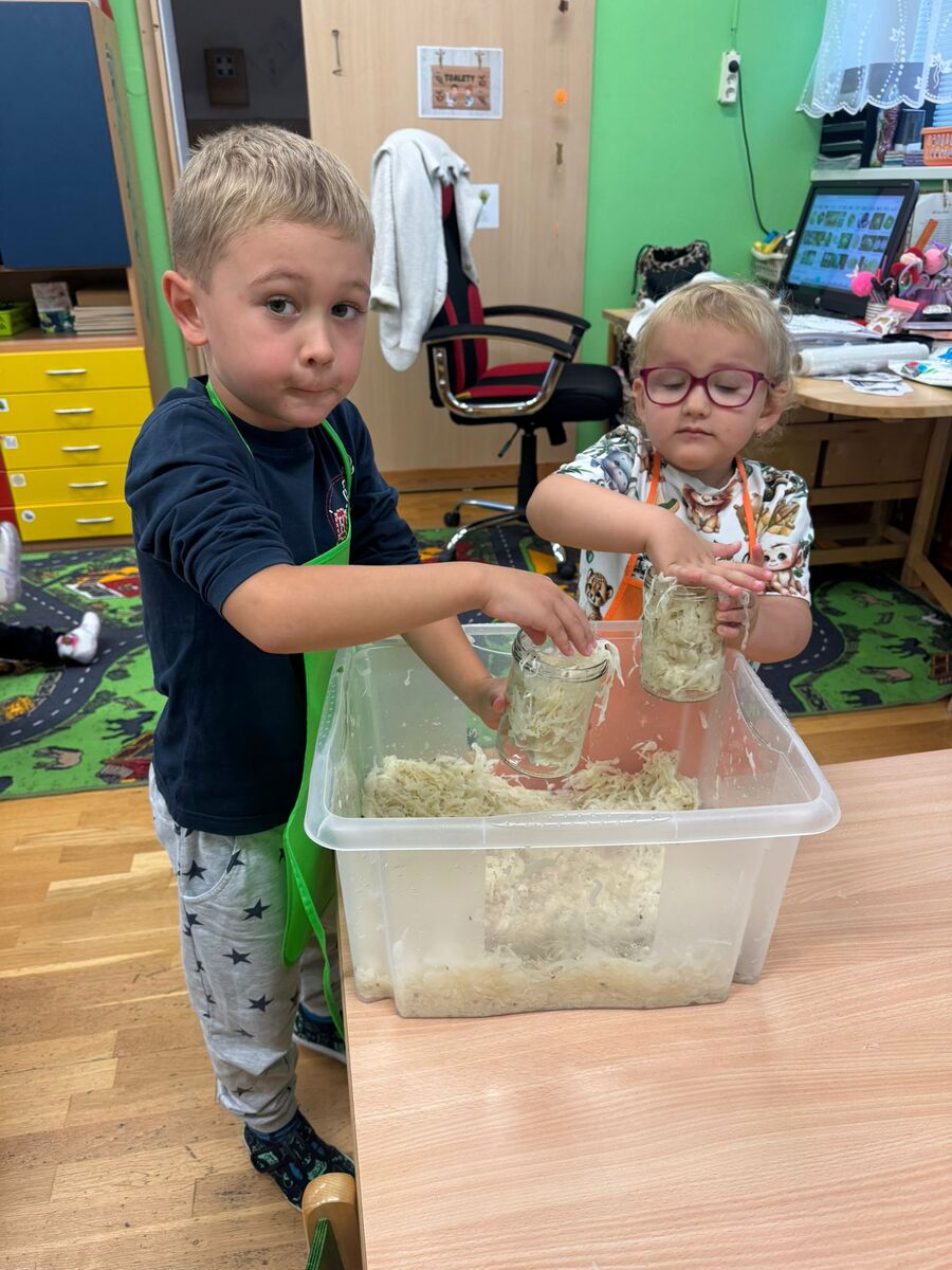 Zelí už bylo předem nakrájené, děti ho nasolily a okořenily a pořádně promíchaly. Aby to bylo jako za starých časů, umyly si nohy, obalily je do fólií a zelí pořádně vyšlapaly. Byla to pro ně velká zábava a krásná zkušenost, jak si vyzkoušet tradiční postup našich předků. Zároveň se učily trpělivosti a spolupráce s kamarádem.