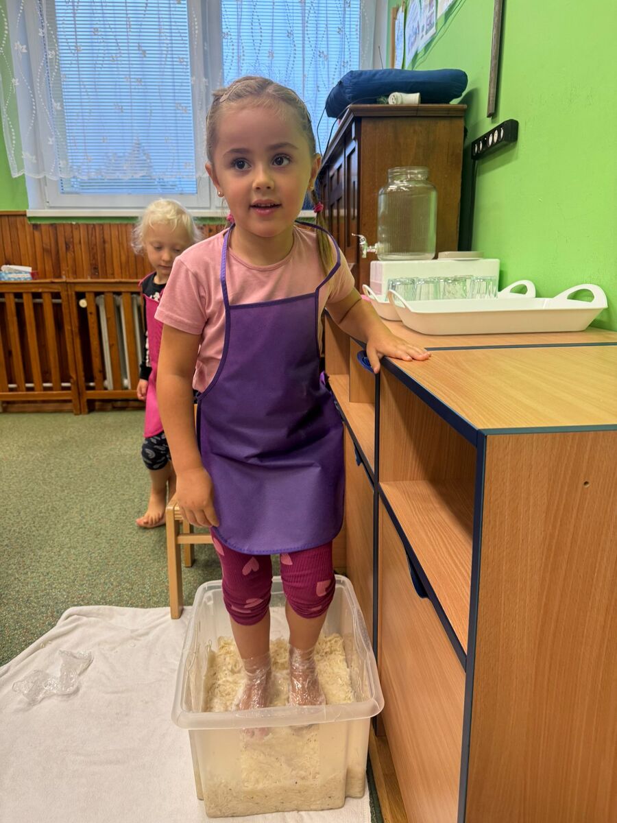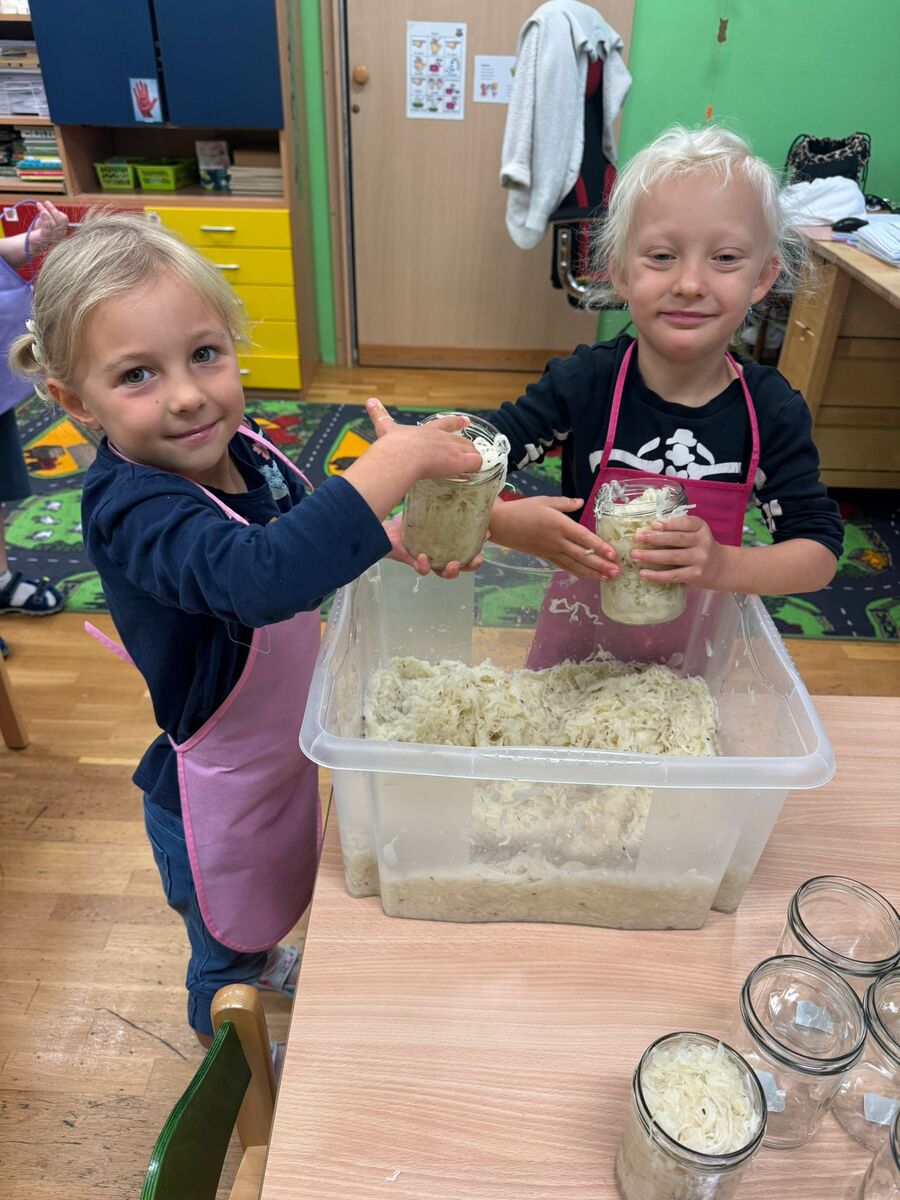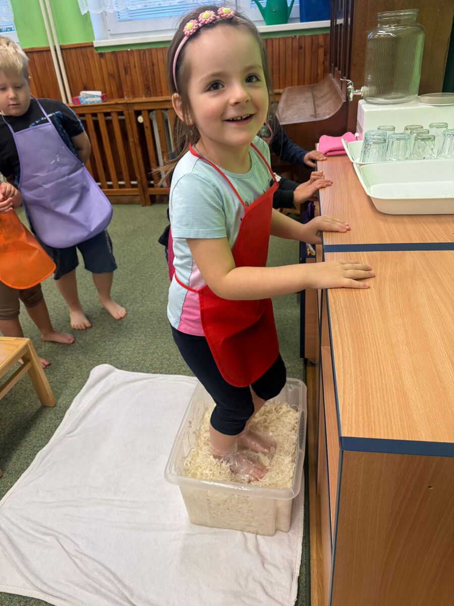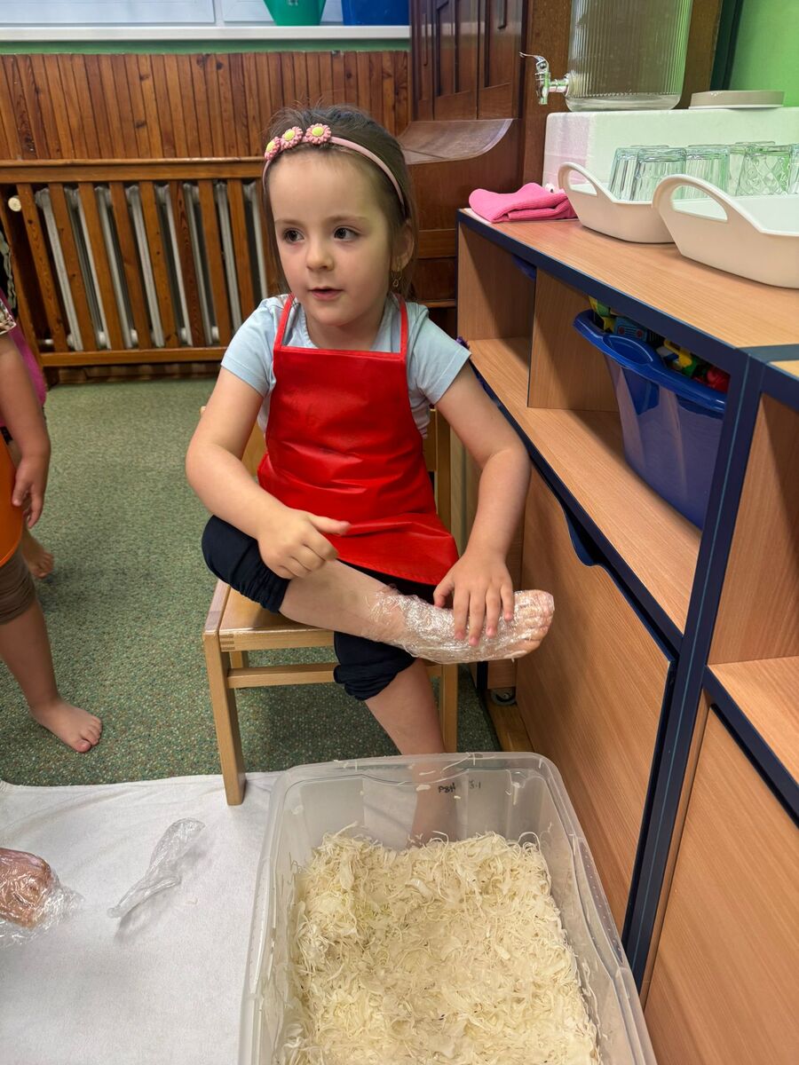 Zelí už bylo předem nakrájené, děti ho nasolily a okořenily a pořádně promíchaly. Aby to bylo jako za starých časů, umyly si nohy, obalily je do fólií a zelí pořádně vyšlapaly. Byla to pro ně velká zábava a krásná zkušenost, jak si vyzkoušet tradiční postup našich předků. Zároveň se učily trpělivosti a spolupráce s kamarádem.
