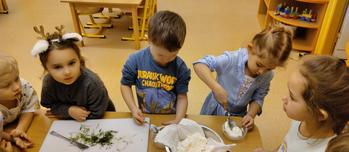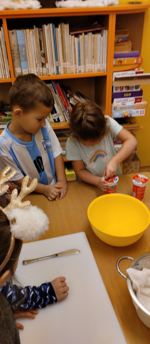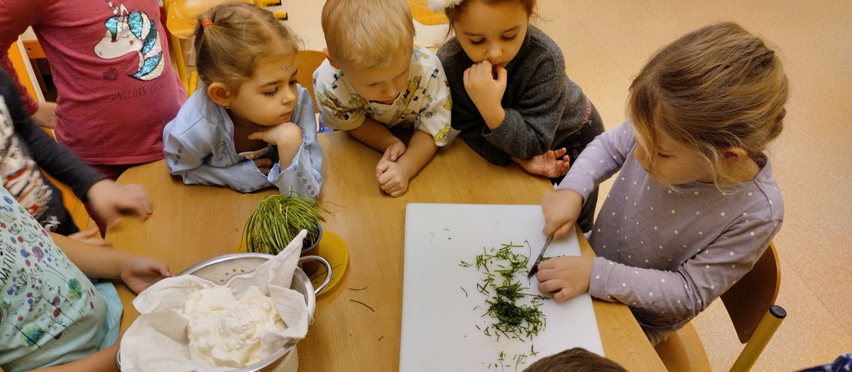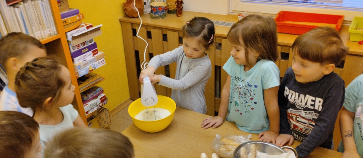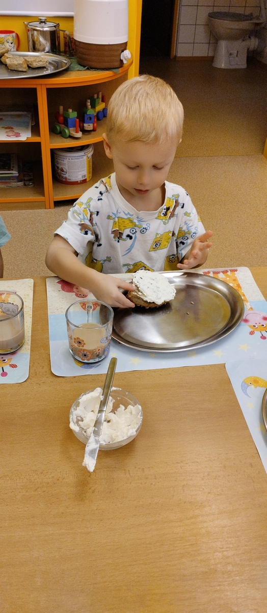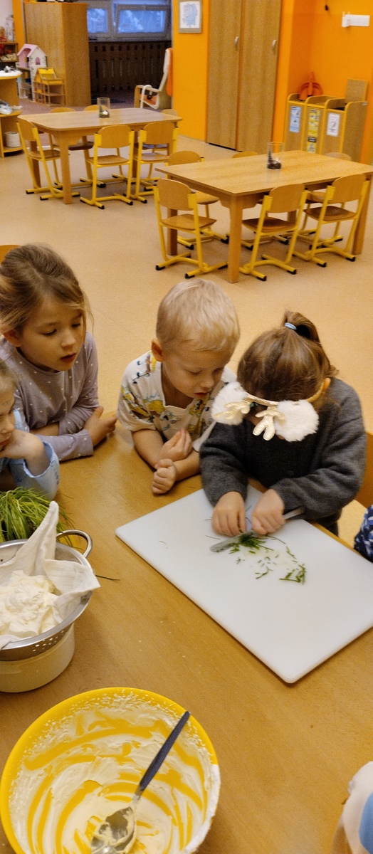 Třída broučci si dnes vyzkoušela, jak se dá snadno udělat lahodné, chutné máslo. Při jeho výrobě alespoň víme, co jíme,(kvalitní smetana), a získáváme prospěšné vitamíny A,D,E,K a podmáslí.Postup: Do mísy nalijeme 2 šlehačky. Zapneme ruční mixér a šleháme. První co uvidíme , bude šlehačka, potom se nám utvoří hrudky a máme možnost vidět, jak se odděluje podmáslí od tuh.hmoty. Směs vylijeme přes cedník. Nezapomeneme dát na cedník plenku nebo utěrku. Z másla vymačkáme zbytek domláslí. Pak už jen stačí naše máslo namazat na pečivo, dochutit bylinkami, posypak pažitkou a přejeme si dobrou chut. Dětem domácí máslo s pažitkou i bez moc chutnalo.