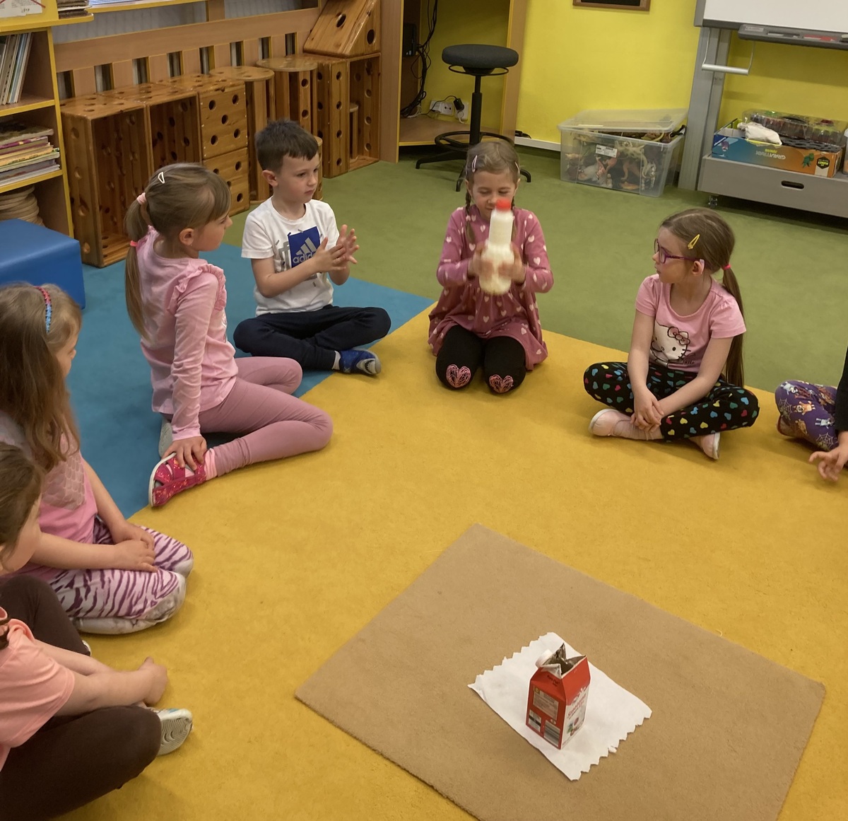 Nejdříve jsme si povídali o kravičce, mléce, smetaně. Pak jsme si ukazovali, jak se dříve tlouklo máslo v máselnici za pomoci obrázků na interaktivní tabuli.