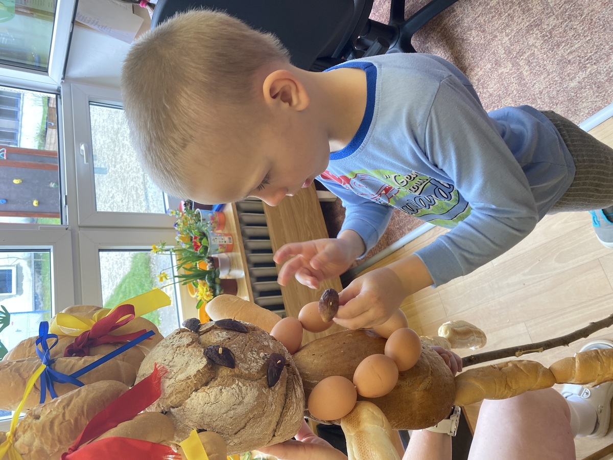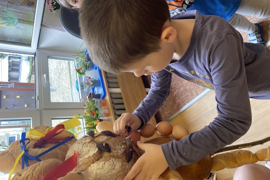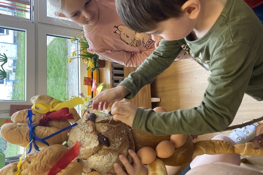 Letos jsme se rozhodli, že si Moranu vytvoříme trochu jinak. Vyrobili jsme ji z chleba, rohlíků, vyfouklých vajíček a sušeného ovoce.