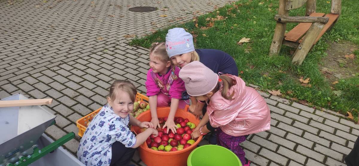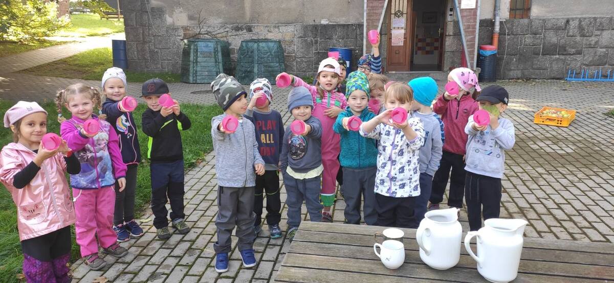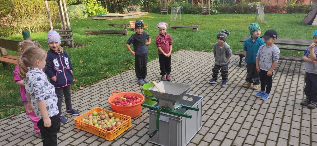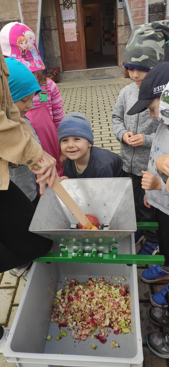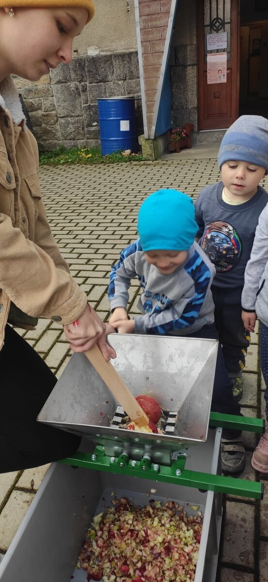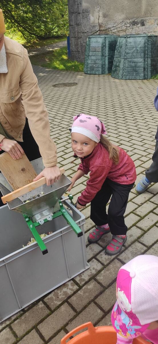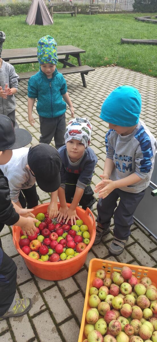 Protože se nemá plýtvat jídlem, rozhodly jsme se společně s dětmi zpracovat všechna zbylá jablíčka a vyrobily jsme si vynikající mošt. Jablíčka jsme umyly, vykrájely a rozdrtily v malé moštárně. Odměnou všem.byl sladký mošt,který zmizel jak mávnutím.kouzelného proutku:-)