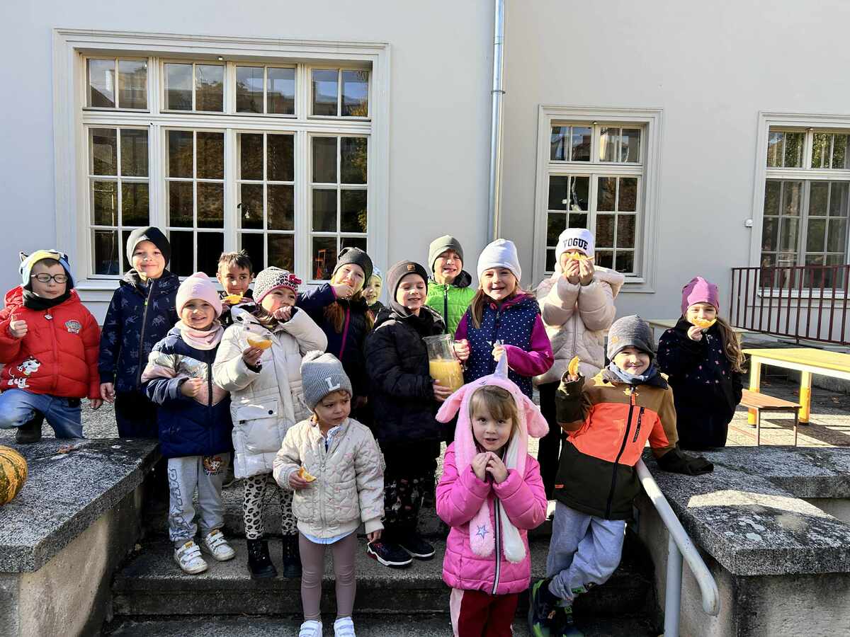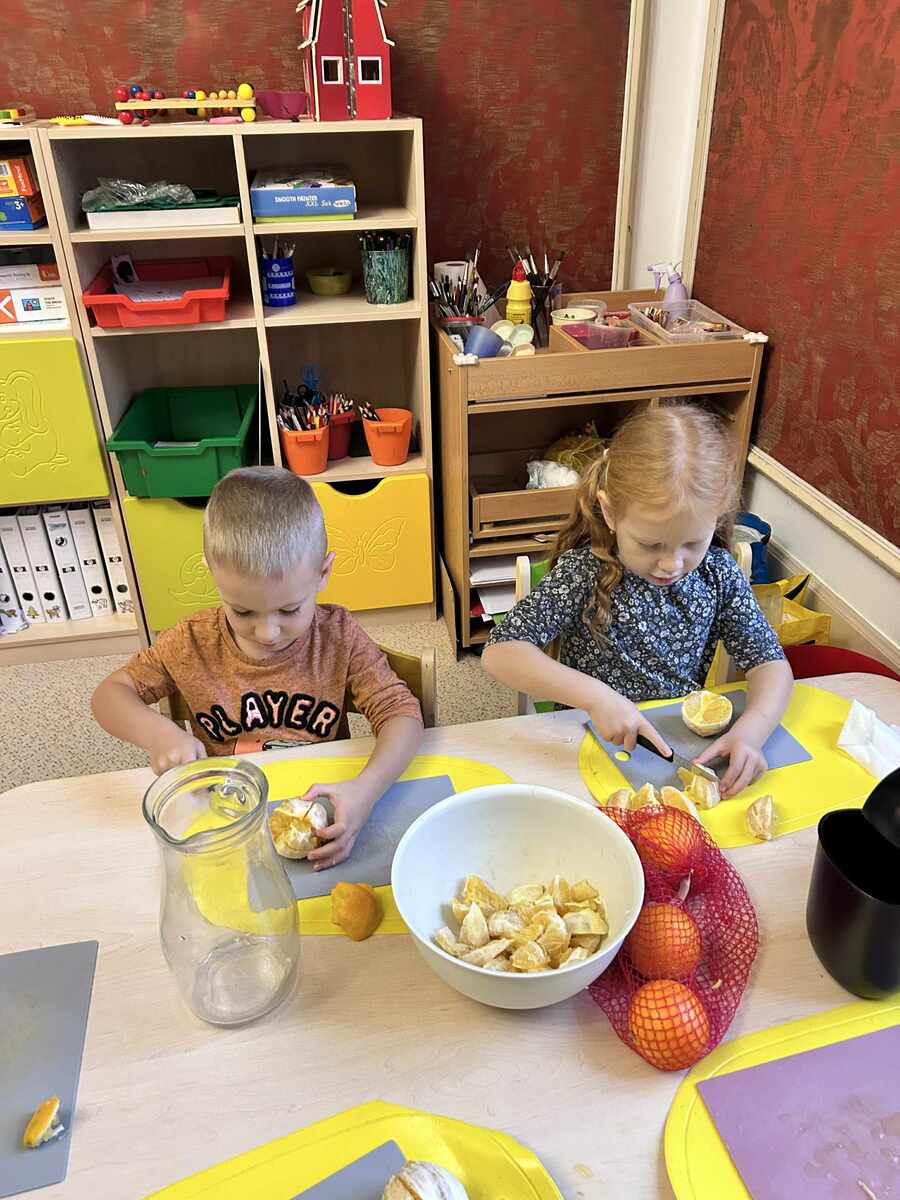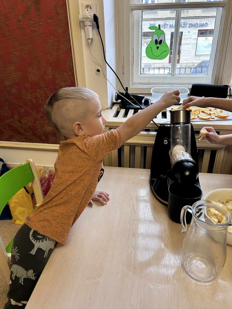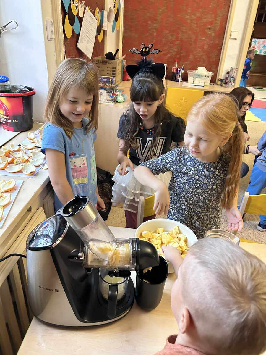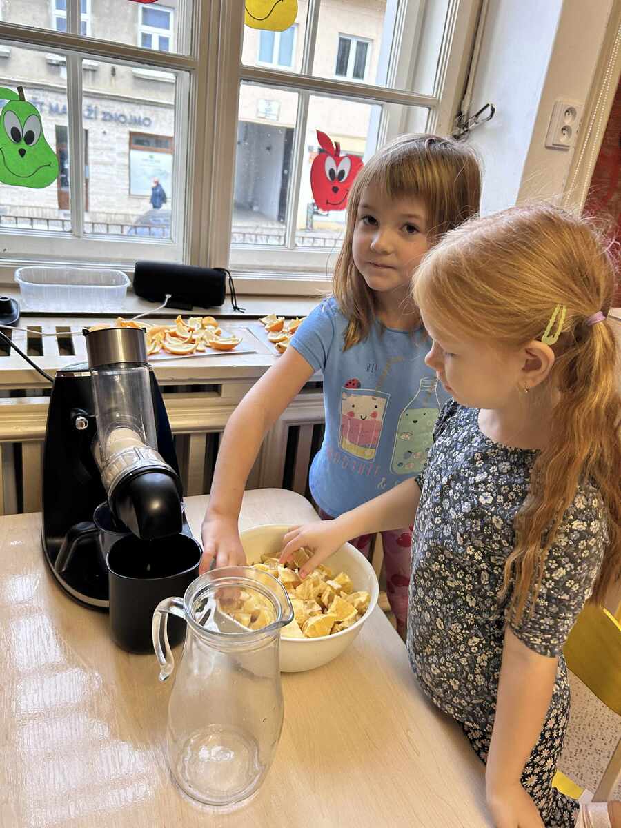 Děti si připravily zdravou a chutnou aktivitu – výrobu čerstvé pomerančové šťávy. Nejprve pomeranče oloupaly a nakrájely na menší kousky, které poté vložily do odšťavňovače. Společně sledovaly, jak se z kousků ovoce stává voňavá pomerančová šťáva. Hotový džus pak děti ochutnaly a hodnotily jeho barvu, vůni i chuť. Při obědě si mohly svou vlastní šťávu samy nalít a s chutí si ji vychutnat.