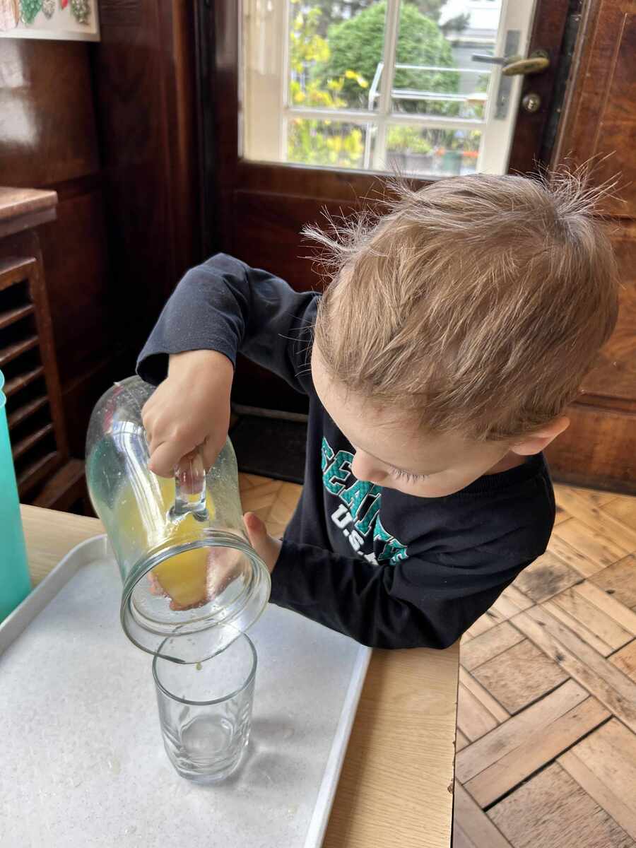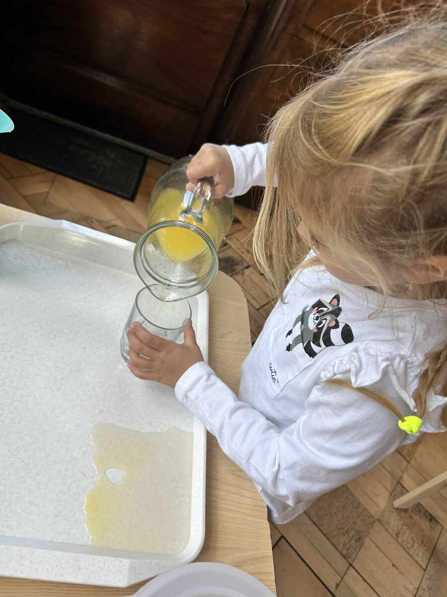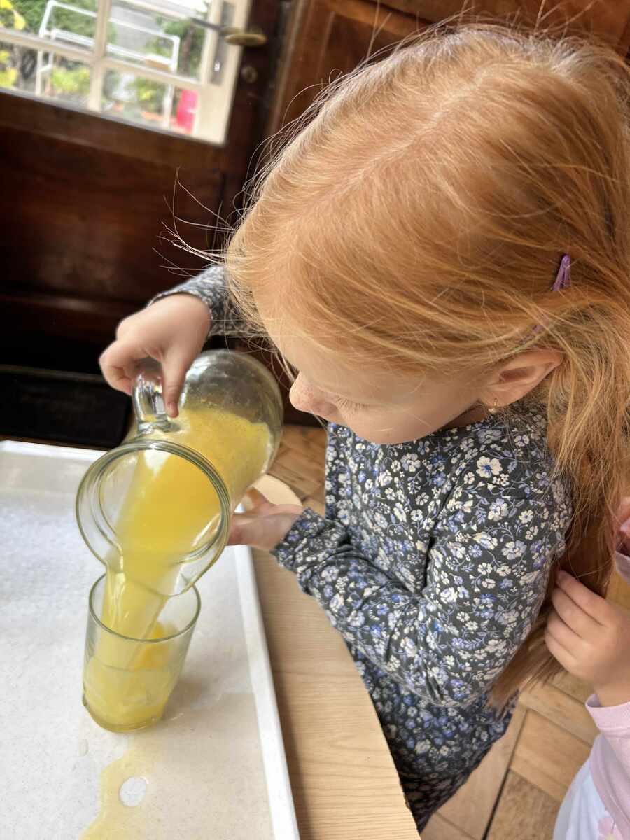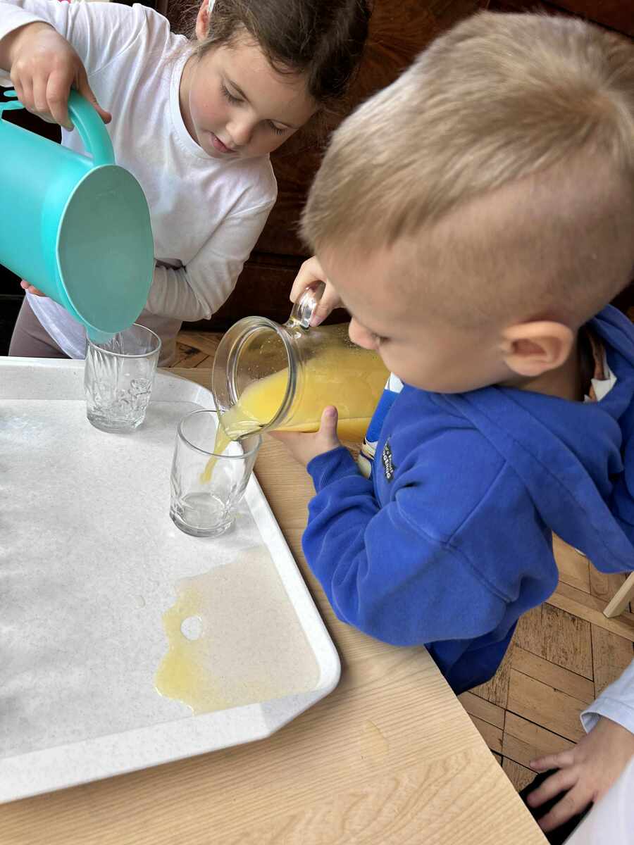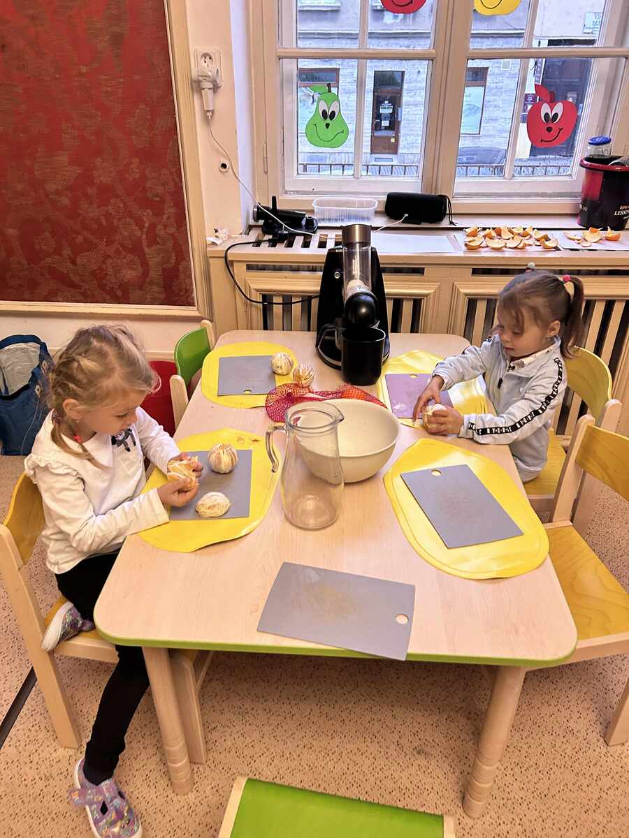 Děti si připravily zdravou a chutnou aktivitu – výrobu čerstvé pomerančové šťávy. Nejprve pomeranče oloupaly a nakrájely na menší kousky, které poté vložily do odšťavňovače. Společně sledovaly, jak se z kousků ovoce stává voňavá pomerančová šťáva. Hotový džus pak děti ochutnaly a hodnotily jeho barvu, vůni i chuť. Při obědě si mohly svou vlastní šťávu samy nalít a s chutí si ji vychutnat.