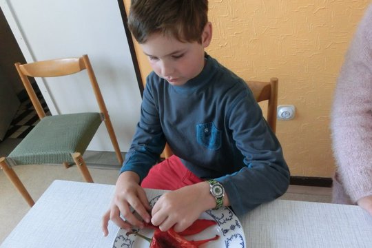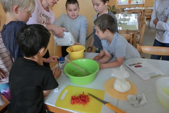 V letošní školní roce jsme začli s výrobou sýra z bílých bio jogurtů ..... sýr se nám vydařil ...krásně nám ztuhnul a my mohli druhý den pokračovat ve výrobě budapešťské pomazánky. Na ozdobu a ochucení jsme použili bylinky z naší zahrádky. Děti byly u udivení jak lehce to jde.... :-).