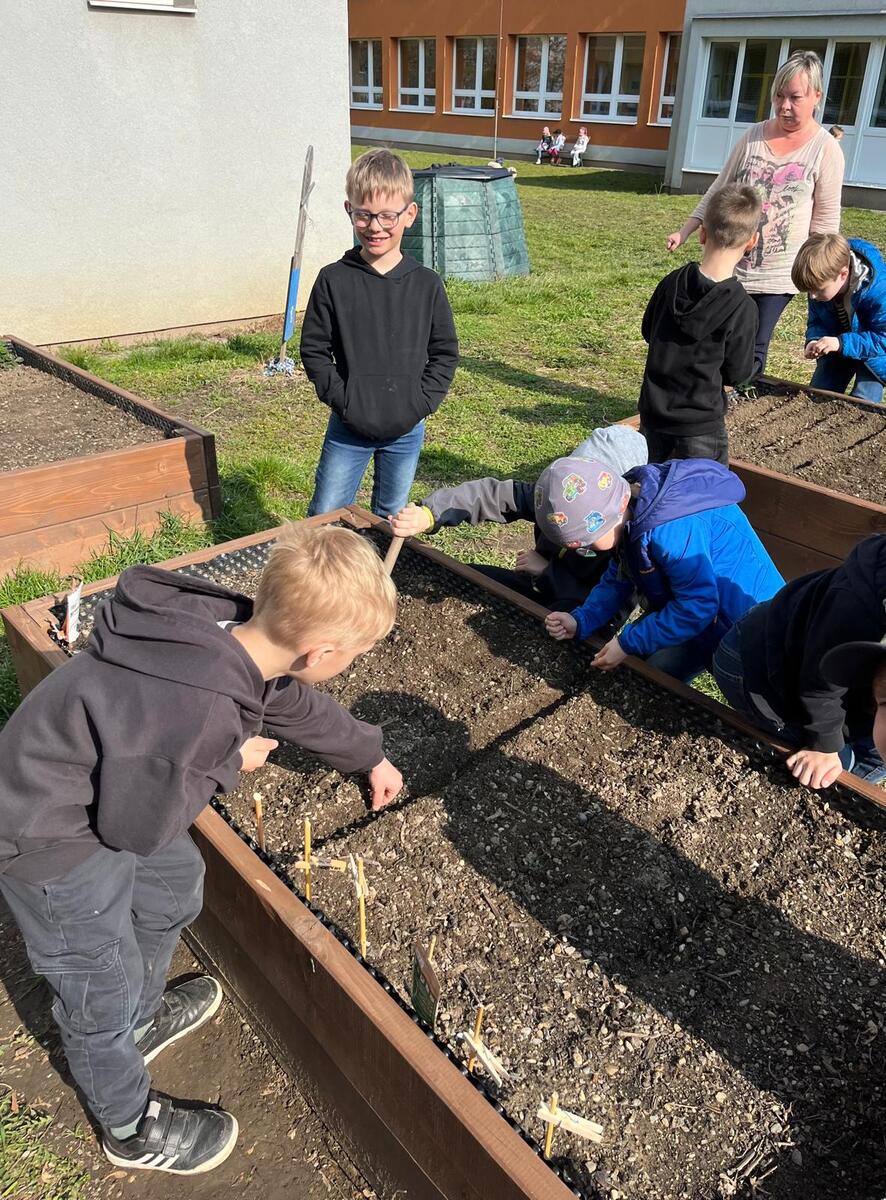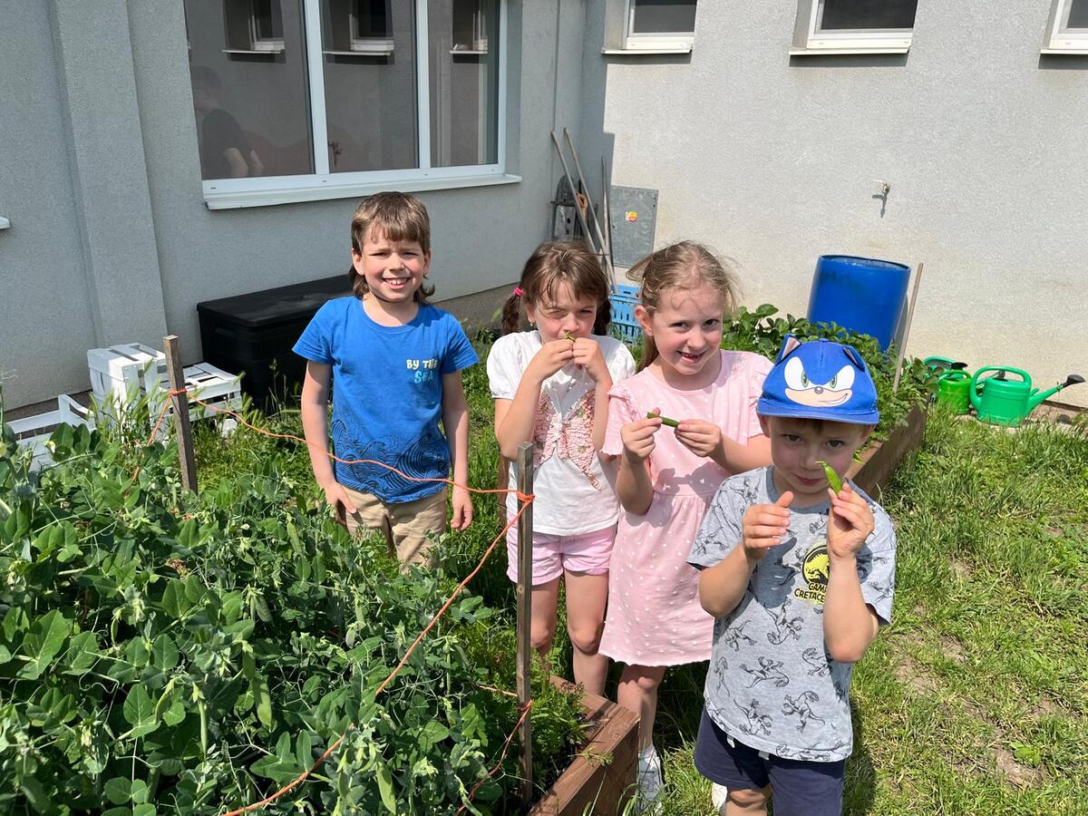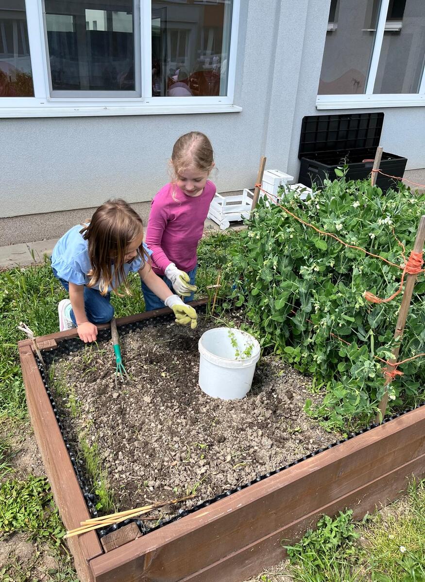 Děti v družině mají oblíbenou činnost – starají se o vyvýšené záhony. Rády zalévají, pečují o rostliny a sledují, jak rostou. Práce na zahradě je baví a učí je zodpovědnosti i vztahu k přírodě.