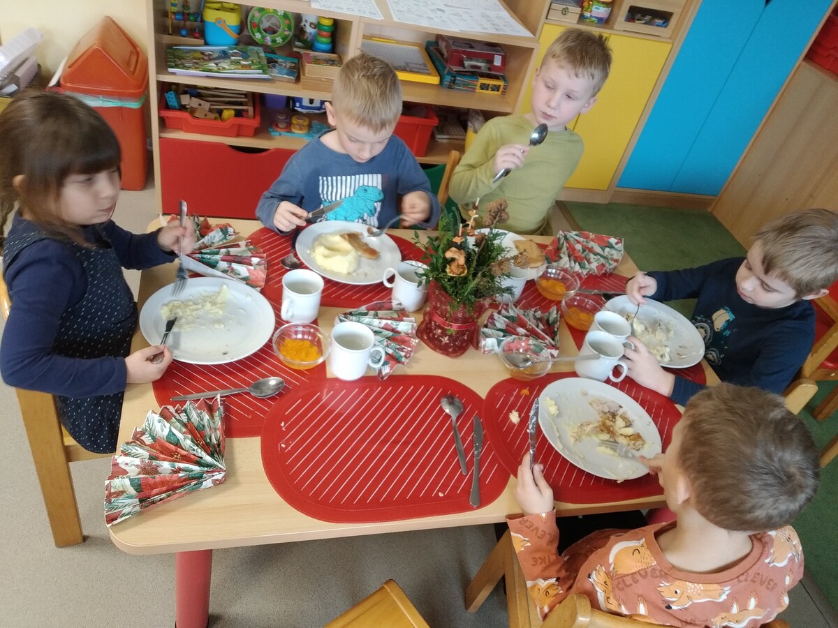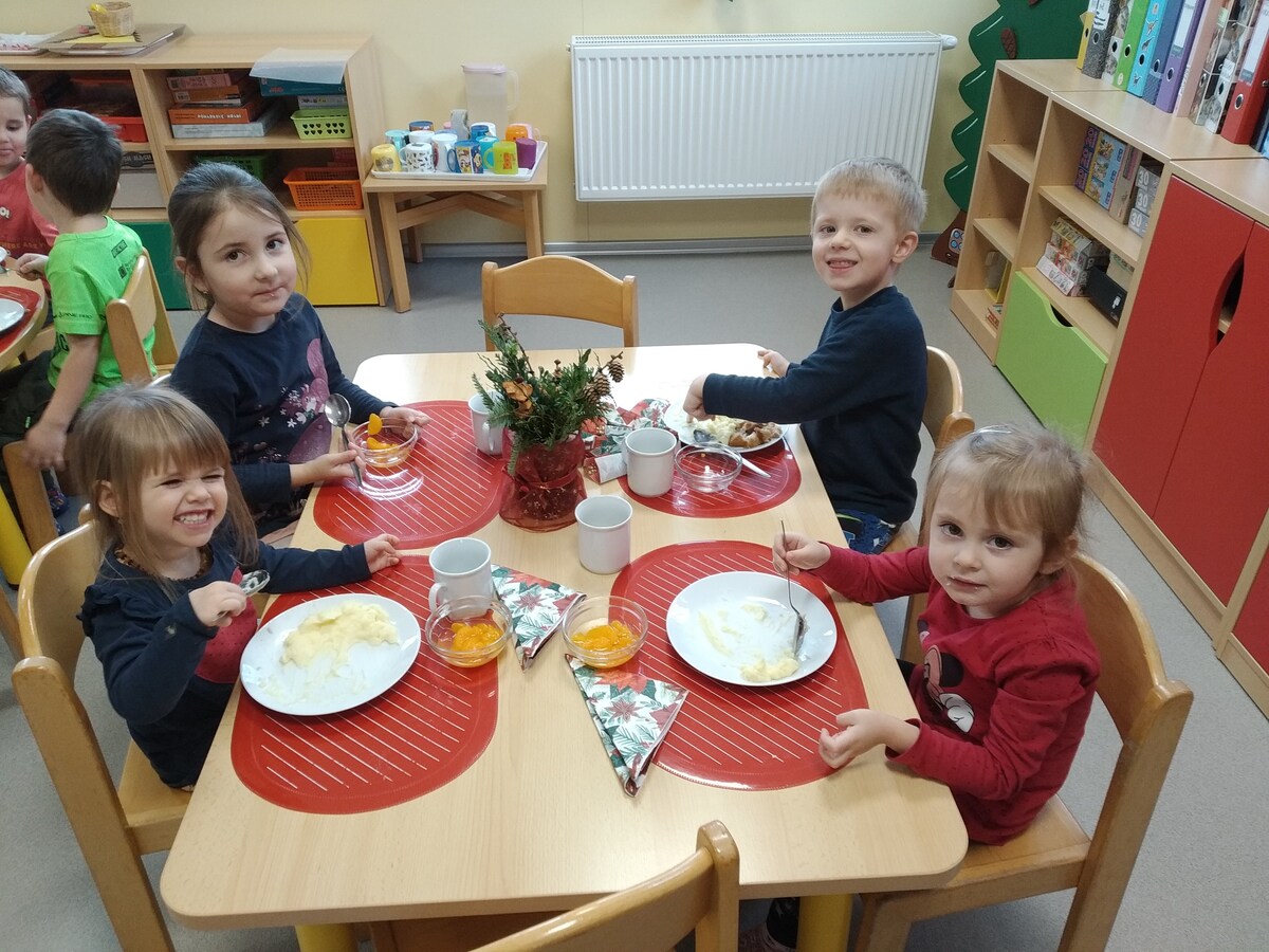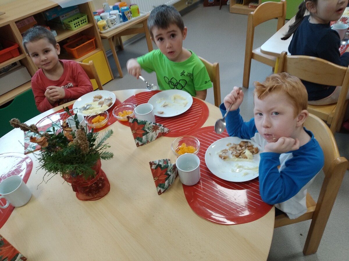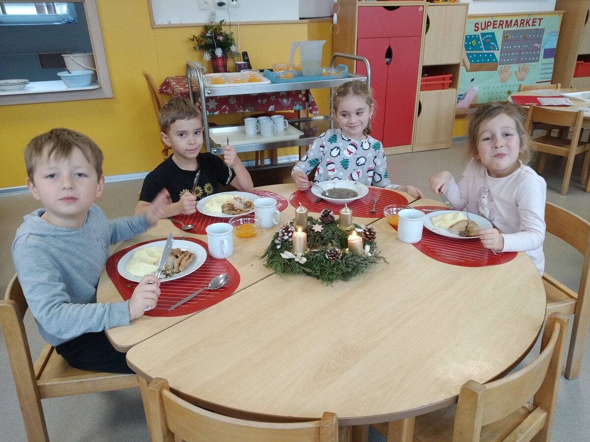 O školkovém "Štědrém dnu" si děti připomněly vánoční zvyky a tradice, těšily se z nových hraček, svátečně si prostřely stolky s poslední rozsvícenou adventní svíčkou. Paní kuchařka nám připravila kapra (z nedaleké rybárny) s bramborovou kaší a kompotem. Při svátečním stolováním bylo vidět jak si děti atmosféru dne velice užívají.