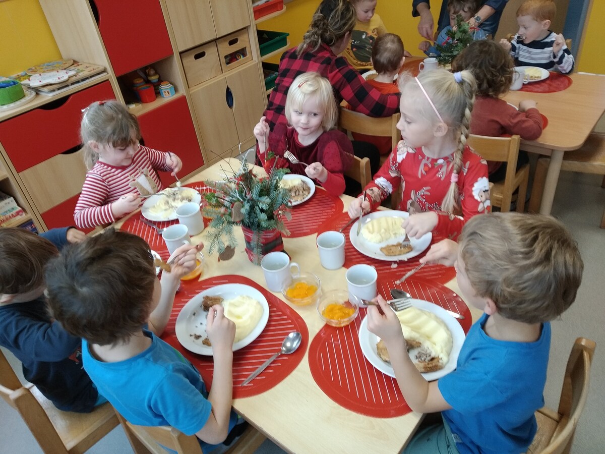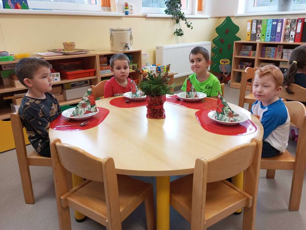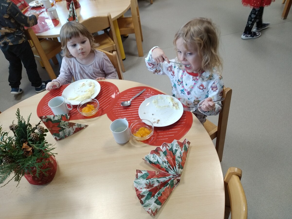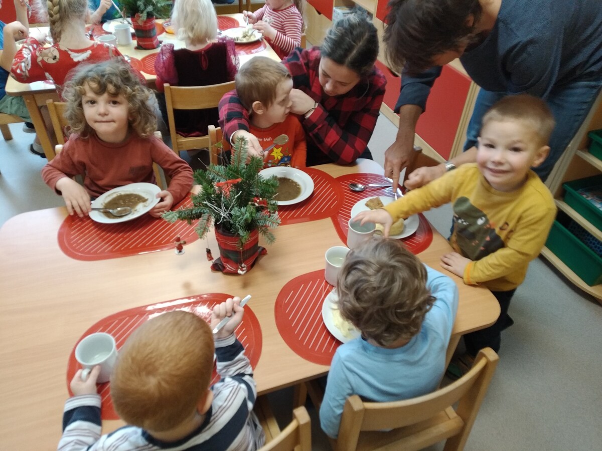 O školkovém "Štědrém dnu" si děti připomněly vánoční zvyky a tradice, těšily se z nových hraček, svátečně si prostřely stolky s poslední rozsvícenou adventní svíčkou. Paní kuchařka nám připravila kapra (z nedaleké rybárny) s bramborovou kaší a kompotem. Při svátečním stolováním bylo vidět jak si děti atmosféru dne velice užívají.