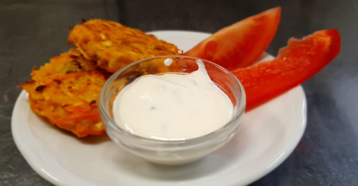 Zapečené zeleninové placičky s dipem ze zakysané smetany a bylinkami
