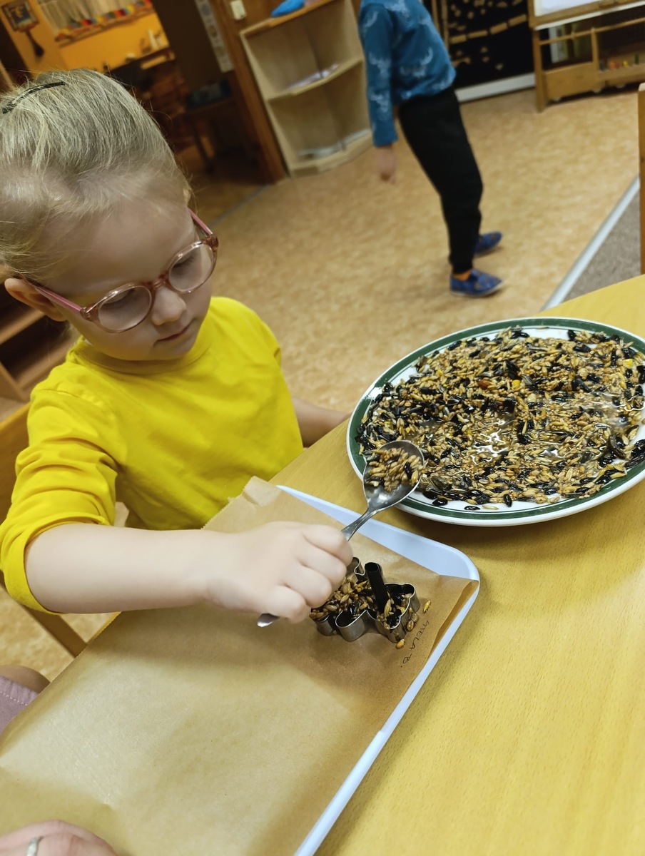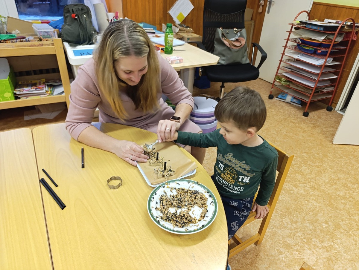 Děti ze třídy Měsíček si užily krásné a poučné dopoledne plné tvoření a péče o přírodu. Společně s paní učitelkou vyráběly závěsná krmítka pro ptáčky ze směsi semínek a sádla. Nejprve si povídaly o tom, proč je důležité ptáčkům v chladnějším období pomáhat, a poté se s chutí pustily do práce.