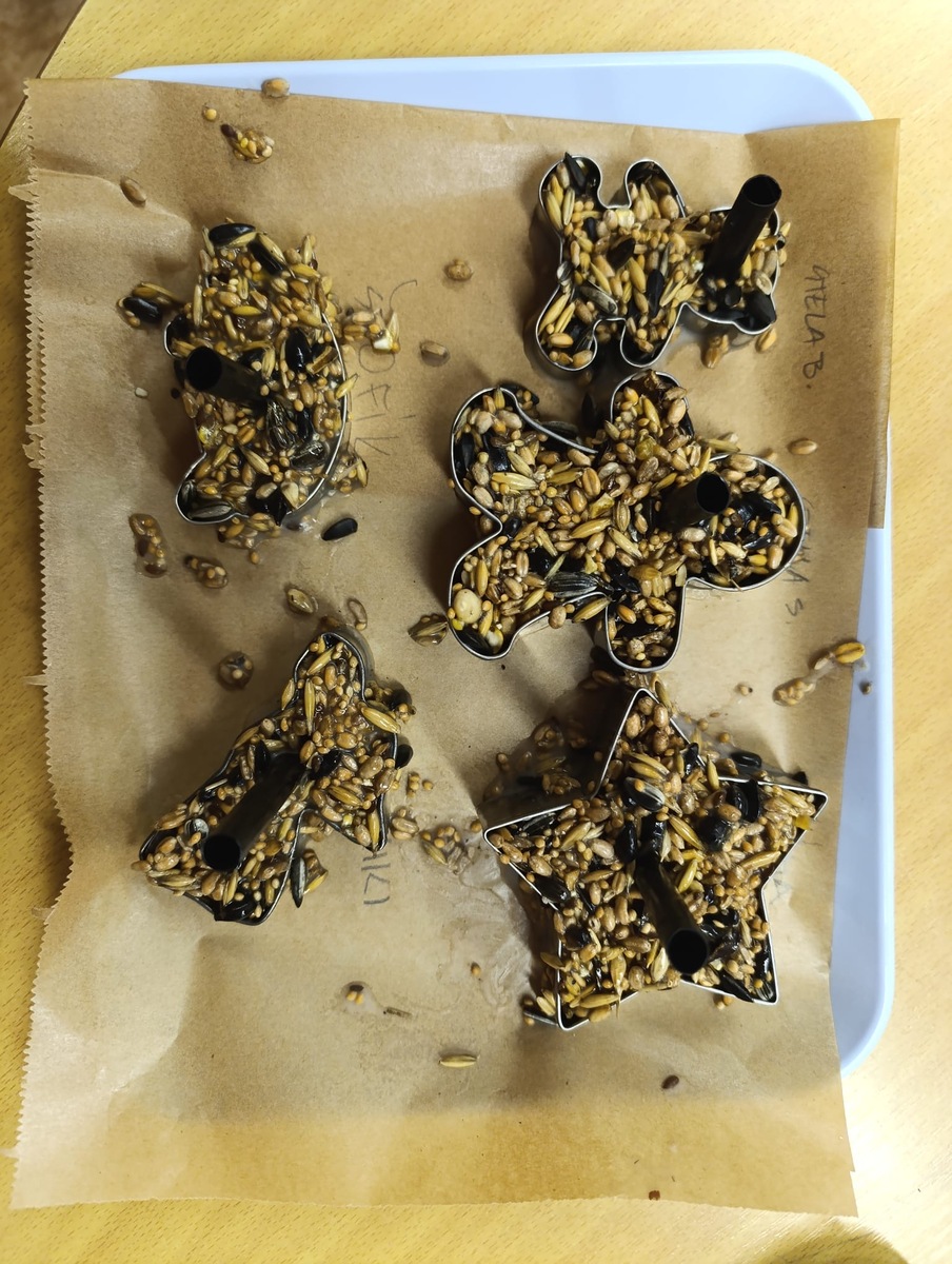 Připravenou směs děti plnily do různých vykrajovátek, které sloužily jako formičky. Po zatuhnutí vznikly krásné tvary. Hotová krmítka pak společně zavěsily na keříky a stromečky na školní zahradě.