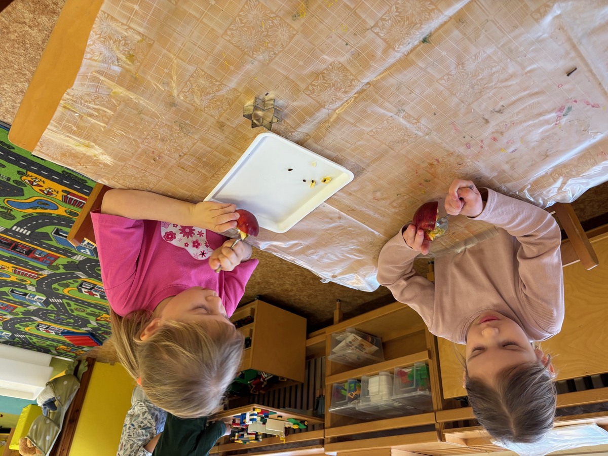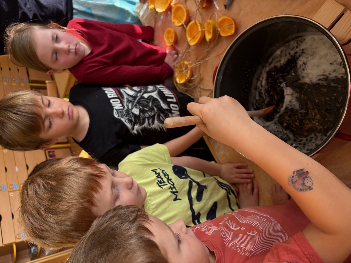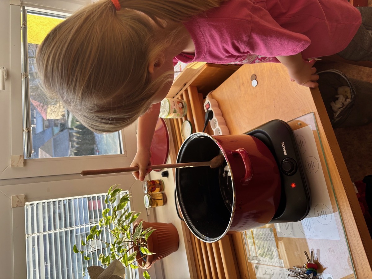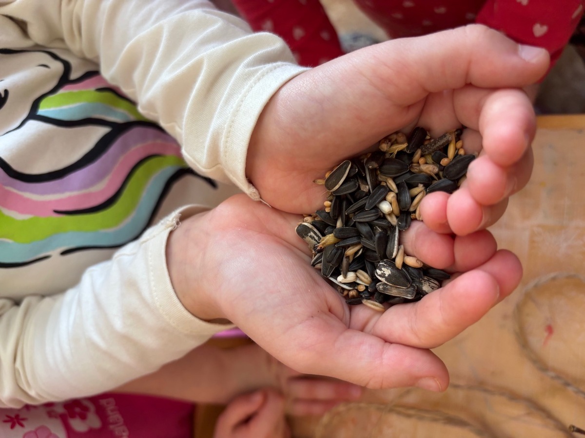 V rámci týdenního tématu „Ahoj sýkorko“ jsme s dětmi vytvořili krmítka z jablek a pomerančů. Rozpuštěný kokosový olej jsme smíchali se směsí semen a naplnili vydlabané pomeranče a jablka.