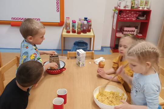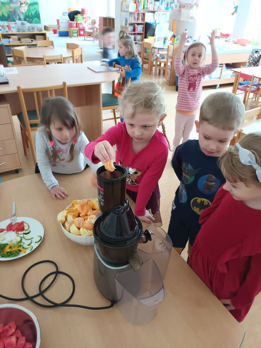 V naší MŠ děti každý týden odšťavňují ovoce. Tento týden jsme s dětmi ze třídy Křemílek, použili drť z odšťavněného ovoce místo čerstvého ovoce jako přísadu do buchty, a paní kuchařka nám ji potom upekla. To byla dobrota ????.