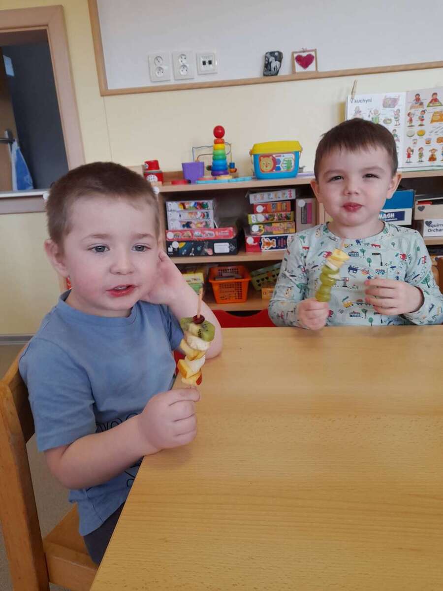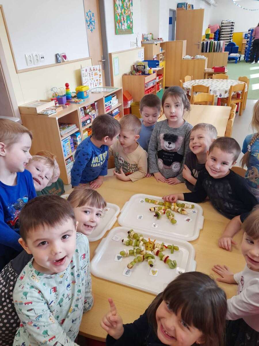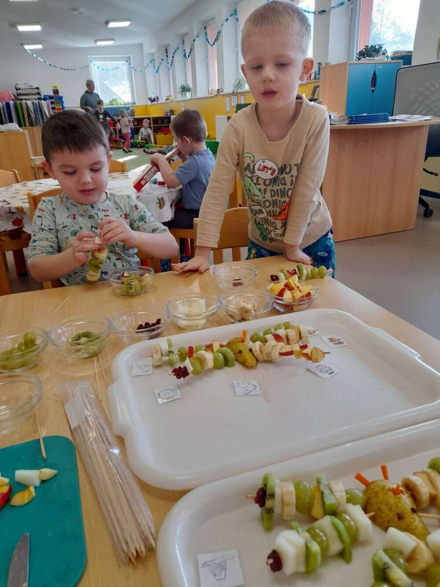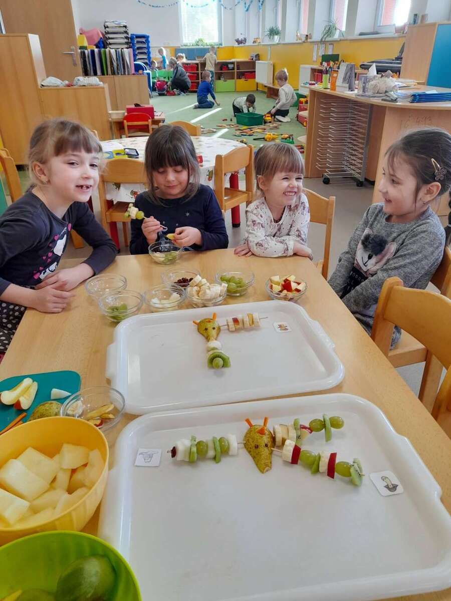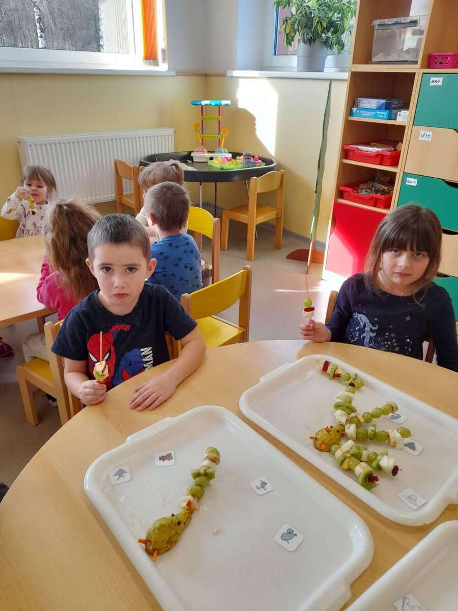 Minulý týden se nesl v duchu zdravé výživy. Třída Kačenek si vyrobila zdravého ovocného páva, kterého si pak s chutí slupla. Třída Žabiček namíchala na pečenou granolu, kterou si děti přisypávají do jogurtu. Další den si k ranní svačince připravily ředkvičkovou pomazánku.