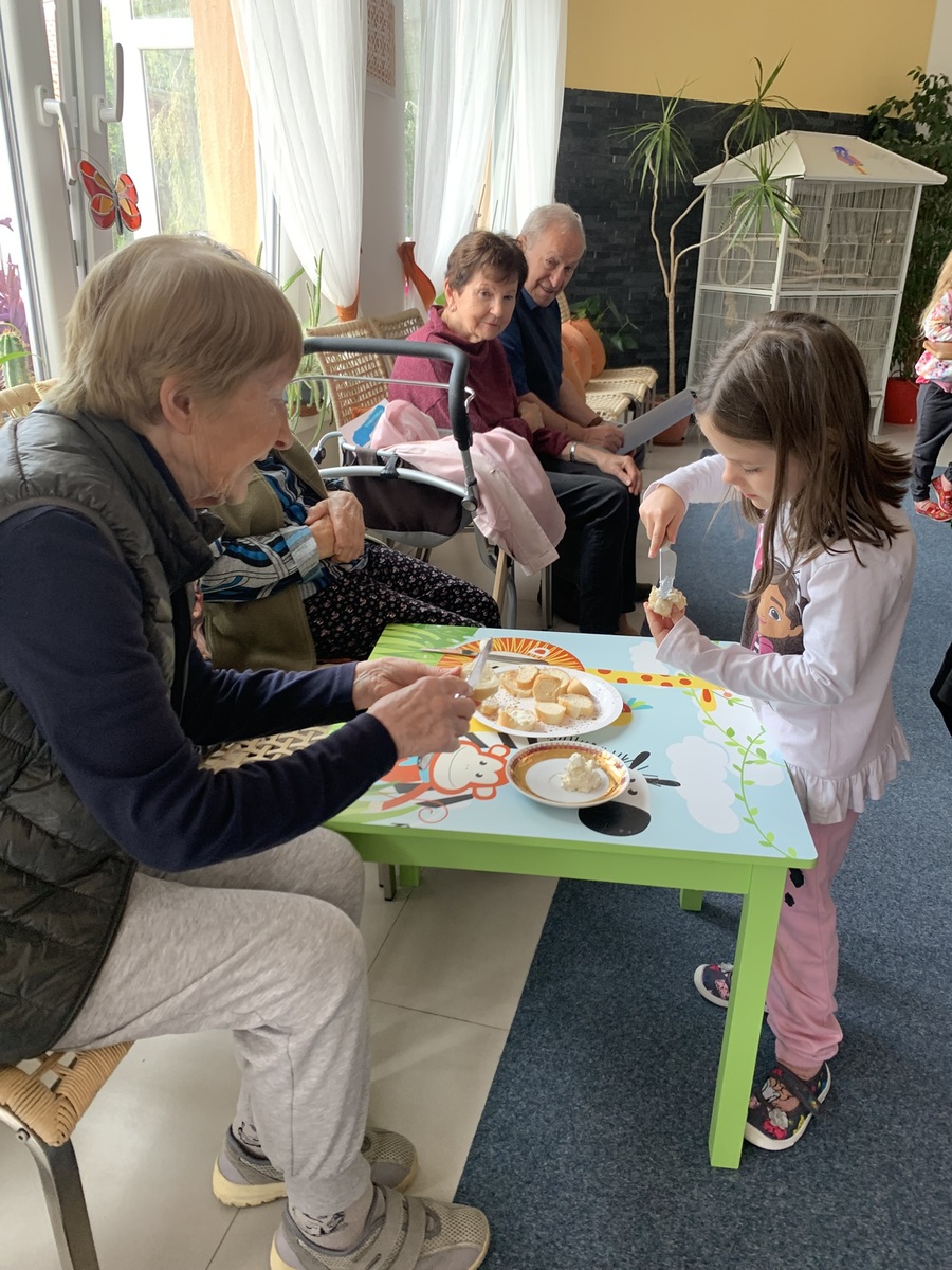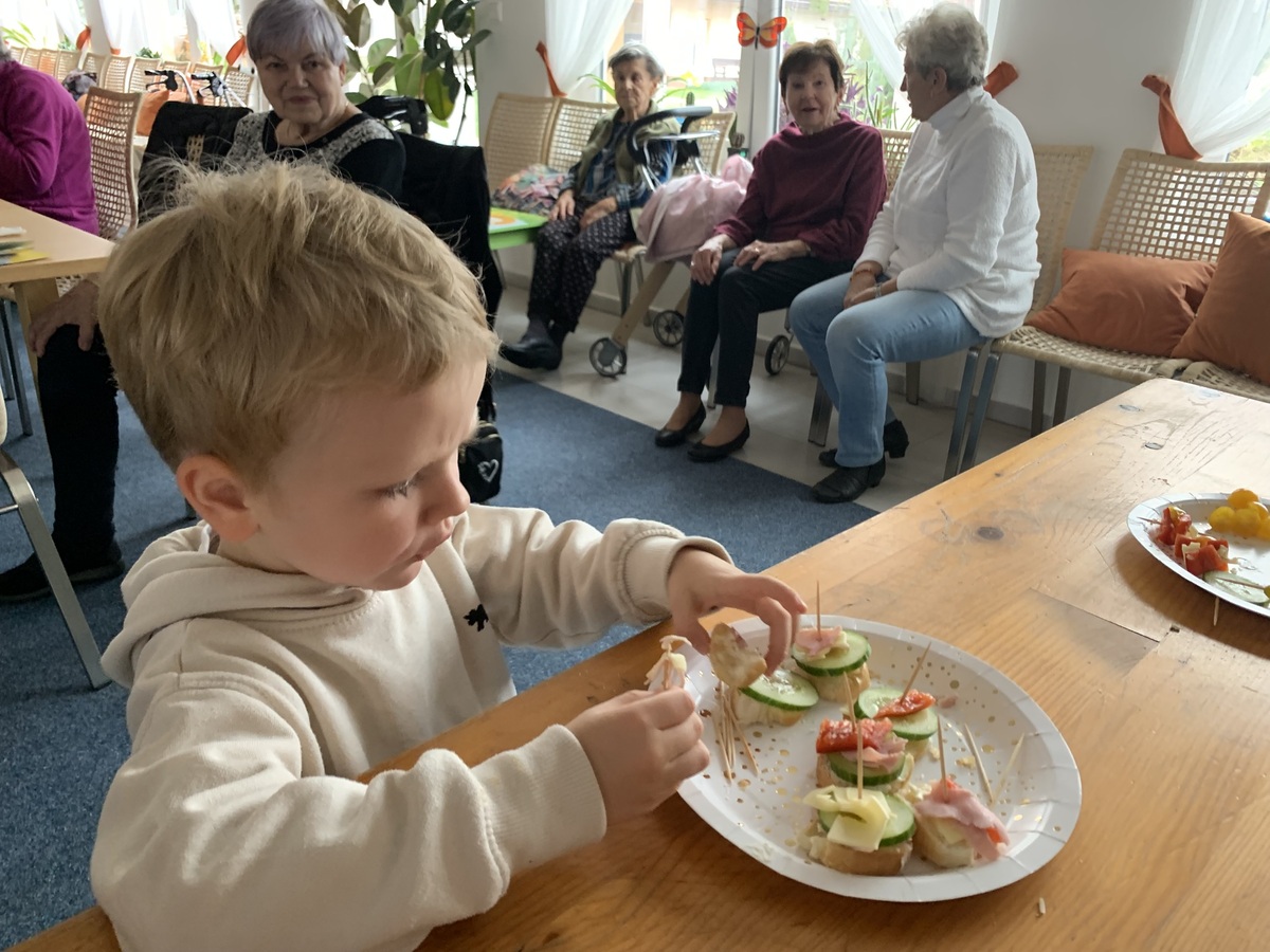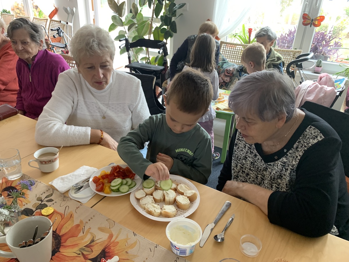 Děti navštívily domov seniorů a společně si připravily chutnou svačinku, děti byly svědky toho jaký je život starších babiček a dědečků, a senioři byli potěšeni návštěvou mládí, na které mohli zavzpomínat.
