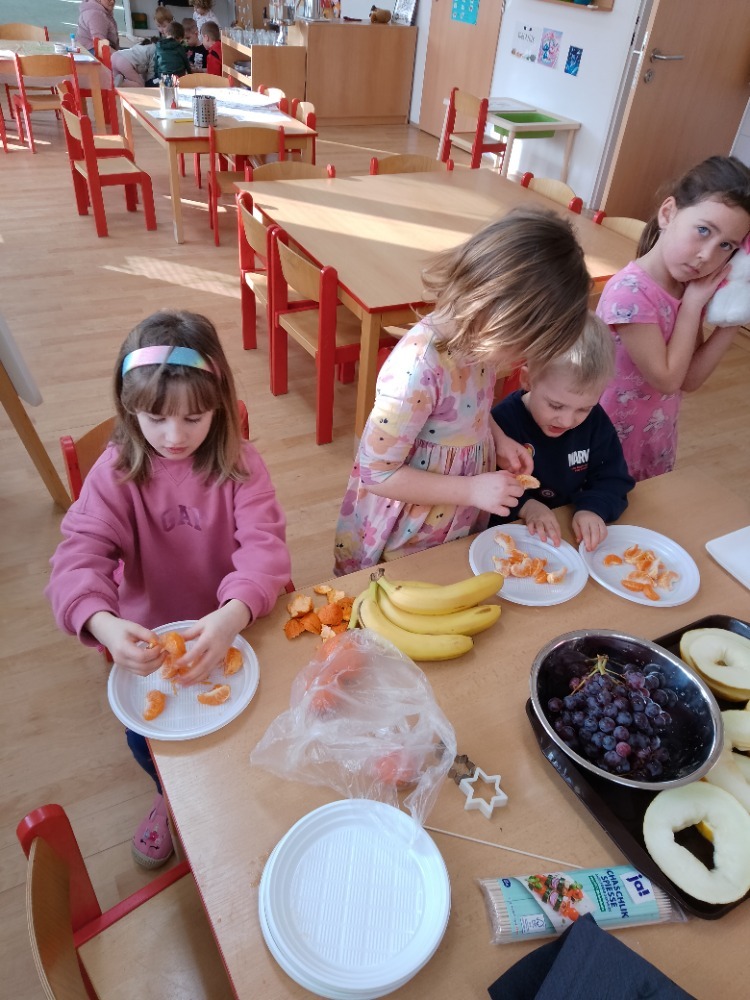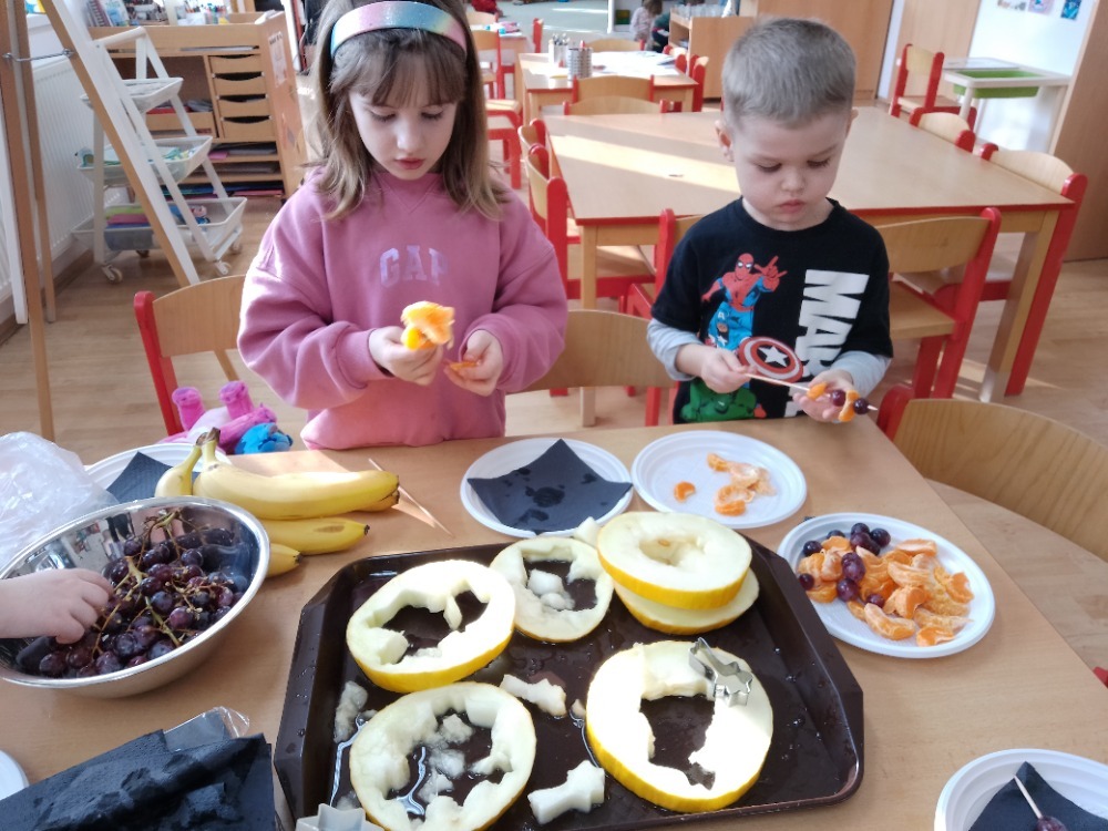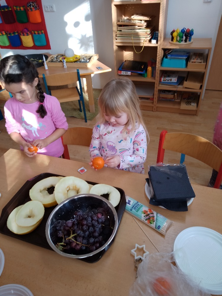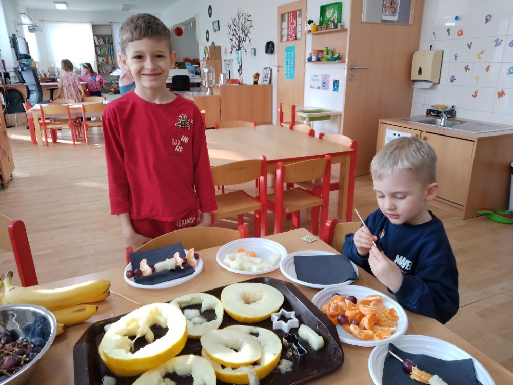 Na začátku jsme si společně prohlédli připravené ovoce. Děti jednotlivé druhy pojmenovávaly, povídaly si o jejich barvách, vůni i chuti a sdílely, které ovoce mají nejraději. Také jsme si připomněli, proč je pro naše tělo důležité jíst ovoce a jak nám pomáhá udržovat zdraví.