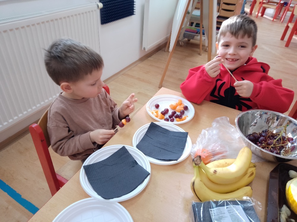 V rámci tématu o zdraví pustili do další chutné aktivity – přípravy ovocných špízů. Děti si vyzkoušely, jak lze z různých druhů ovoce vytvořit nejen zdravou, ale i krásně barevnou svačinu.