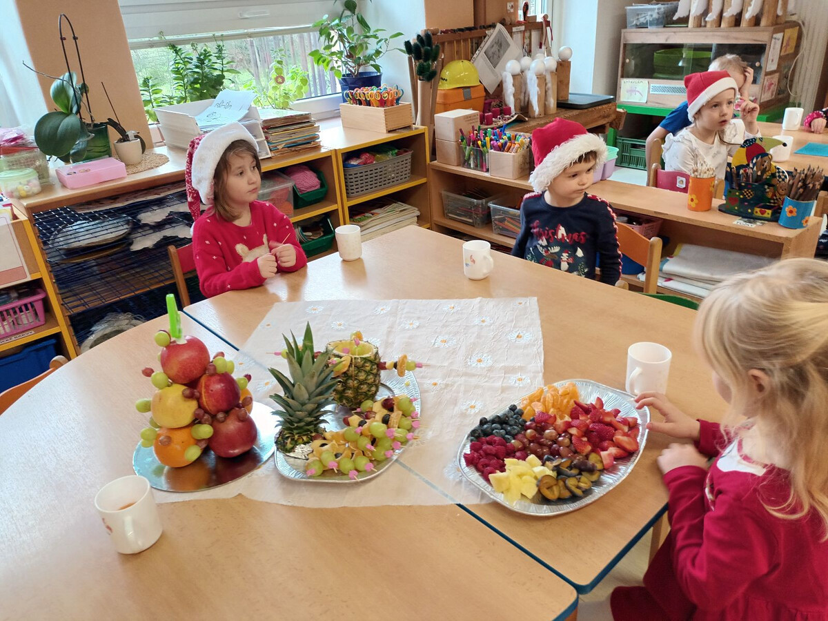 Děti si mohly pochutnat na ovocných jednohubkách, špízech a obloženém ovocném talíři. Občerstvení bylo nejen chutné, ale také velmi hezky upravené a přizpůsobené dětem. Celá akce zapadla do konceptu zdravé mateřské školy a přirozenou formou vedla děti k pozitivnímu vztahu ke zdravému stravování.