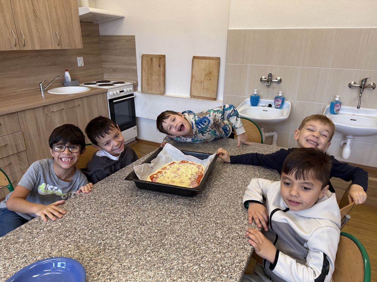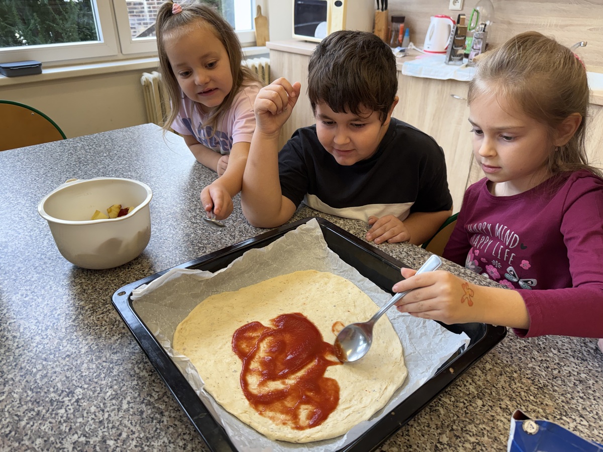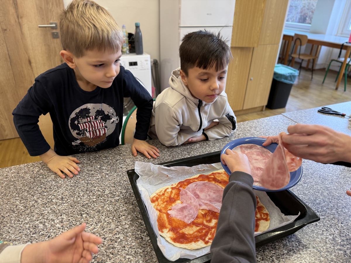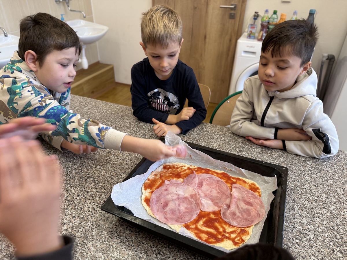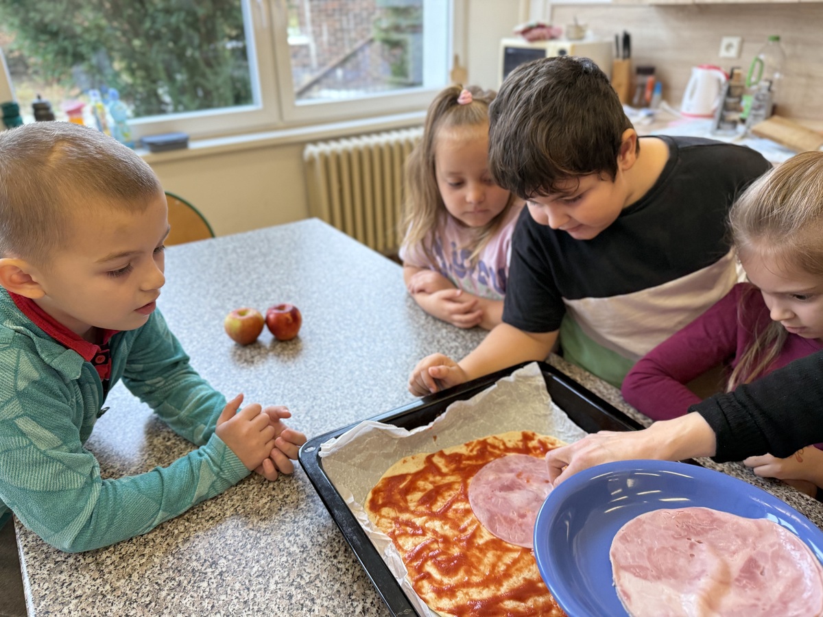 Děti si samy připravily vlastní pizzy. Podílely se na práci s těstem i na závěrečném zdobení pomocí sýra a kvalitní vysokoprocentní šunky. Aktivně spolupracovaly, střídaly se u pracovních úkonů a učily se základním kuchyňským postupům.