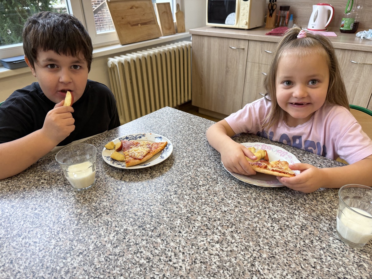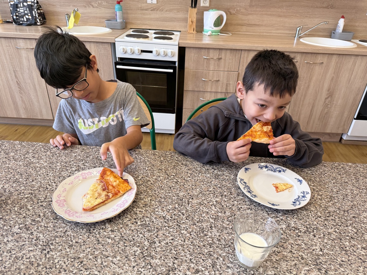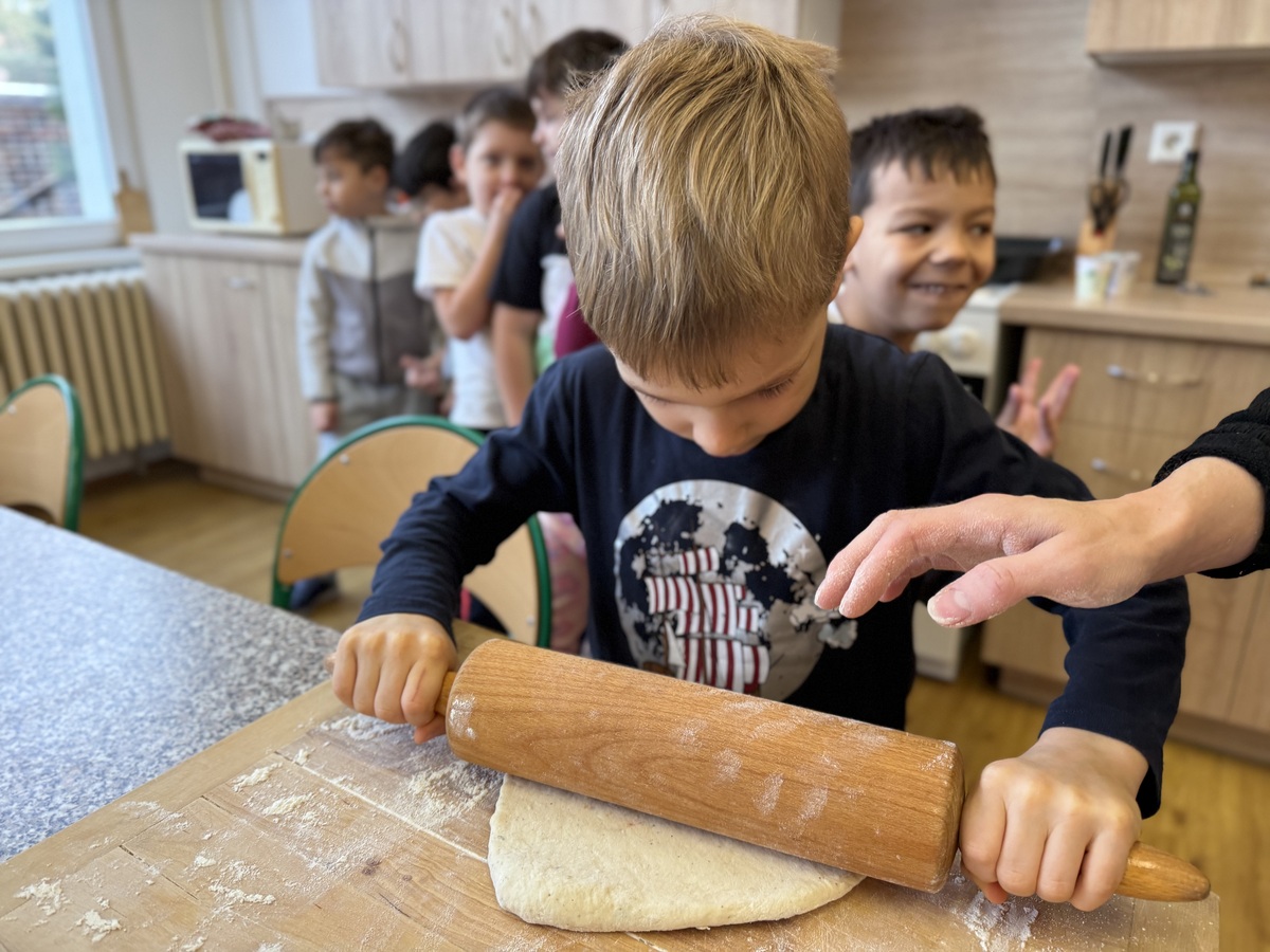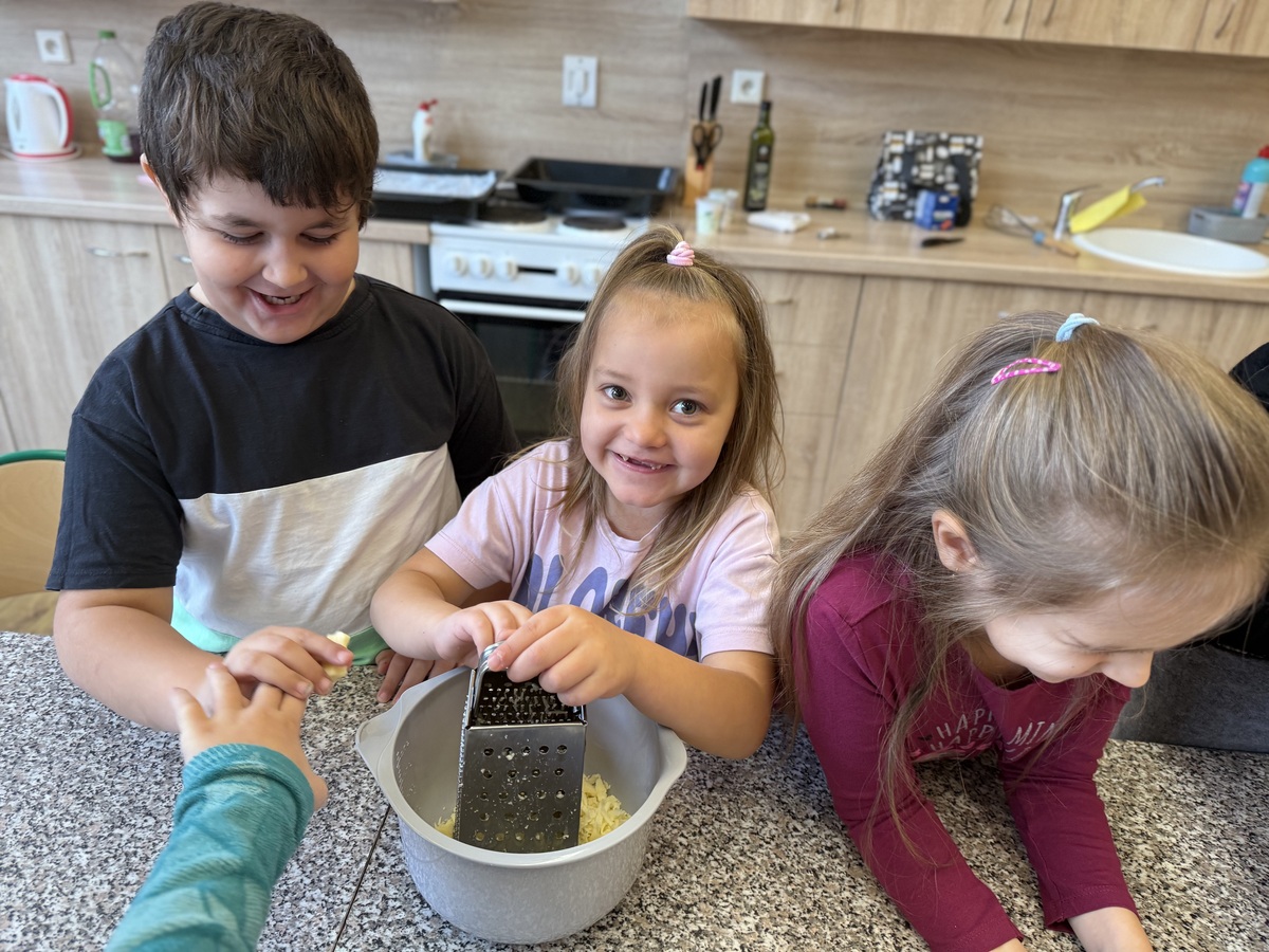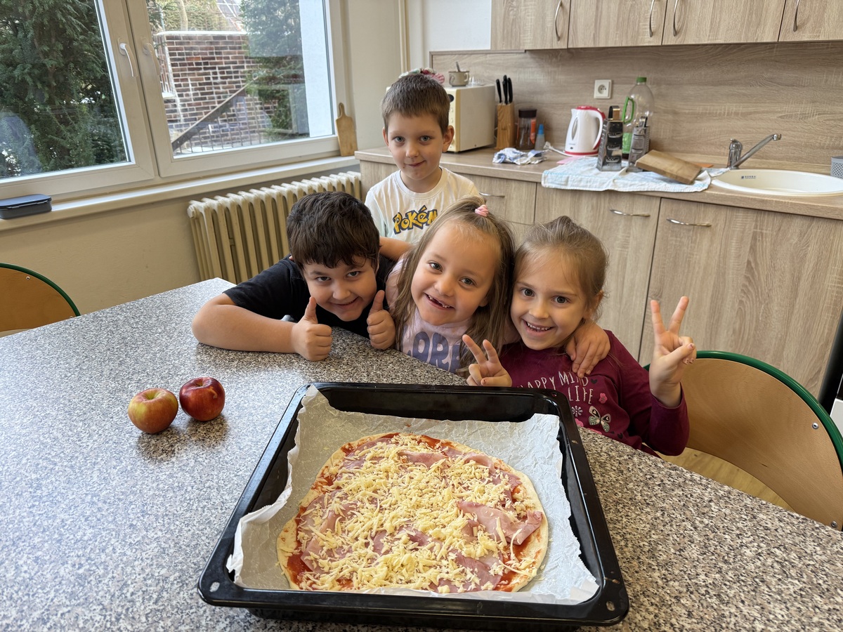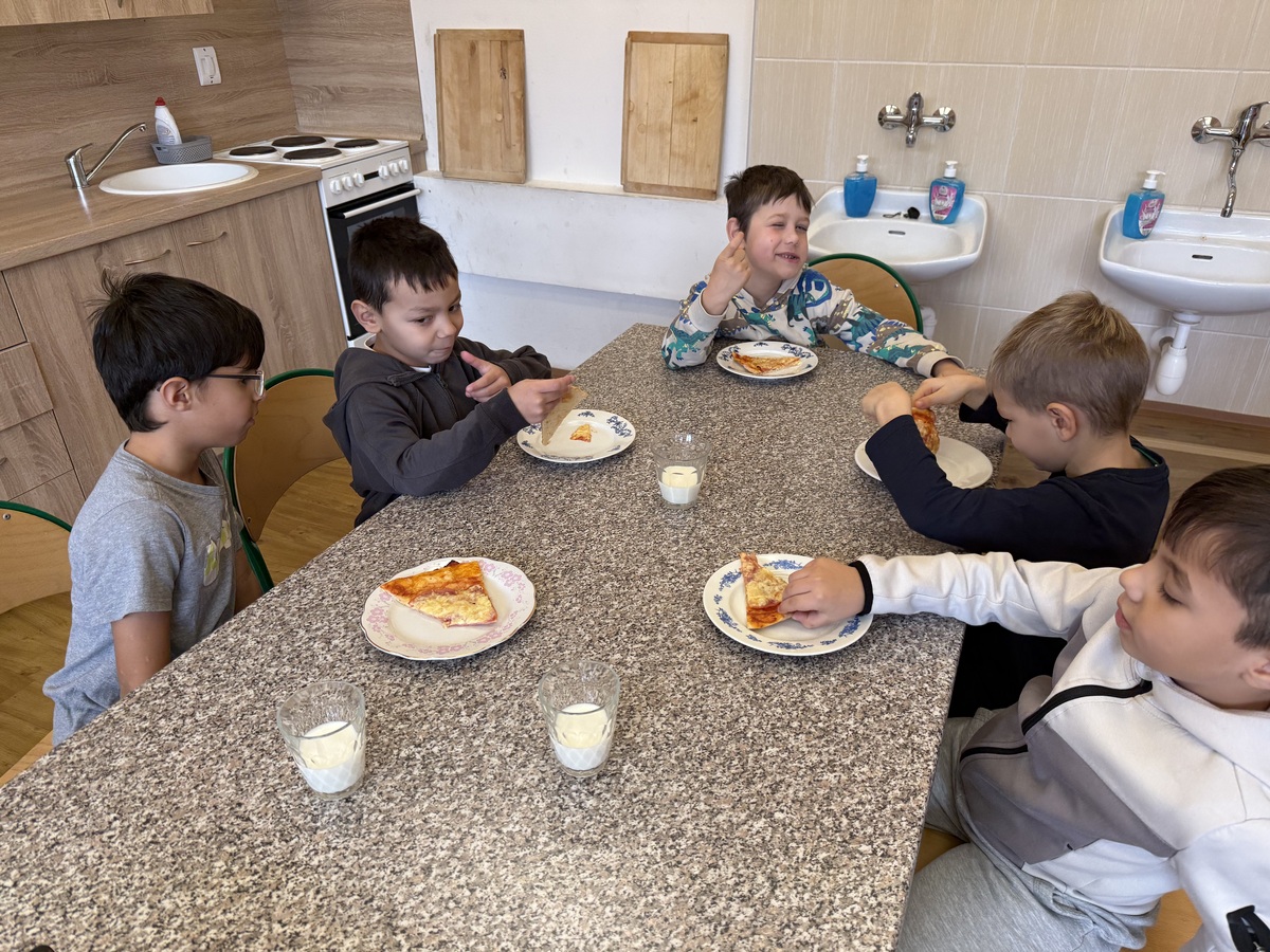Děti si samy připravily vlastní pizzy. Podílely se na práci s těstem i na závěrečném zdobení pomocí sýra a kvalitní vysokoprocentní šunky. Aktivně spolupracovaly, střídaly se u pracovních úkonů a učily se základním kuchyňským postupům.
