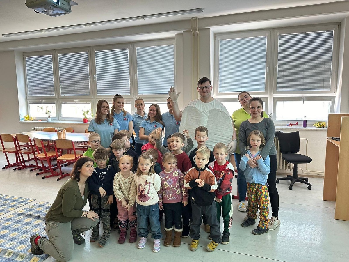 Děti se seznámily se zásadami správné ústní hygieny, kolik máme zubů, co jim prospívá a co naopak škodí. Všechny děti se aktivně zapojovaly do činností a na modelu si vyzkoušely čištění zubů s velkým kartáčkem.