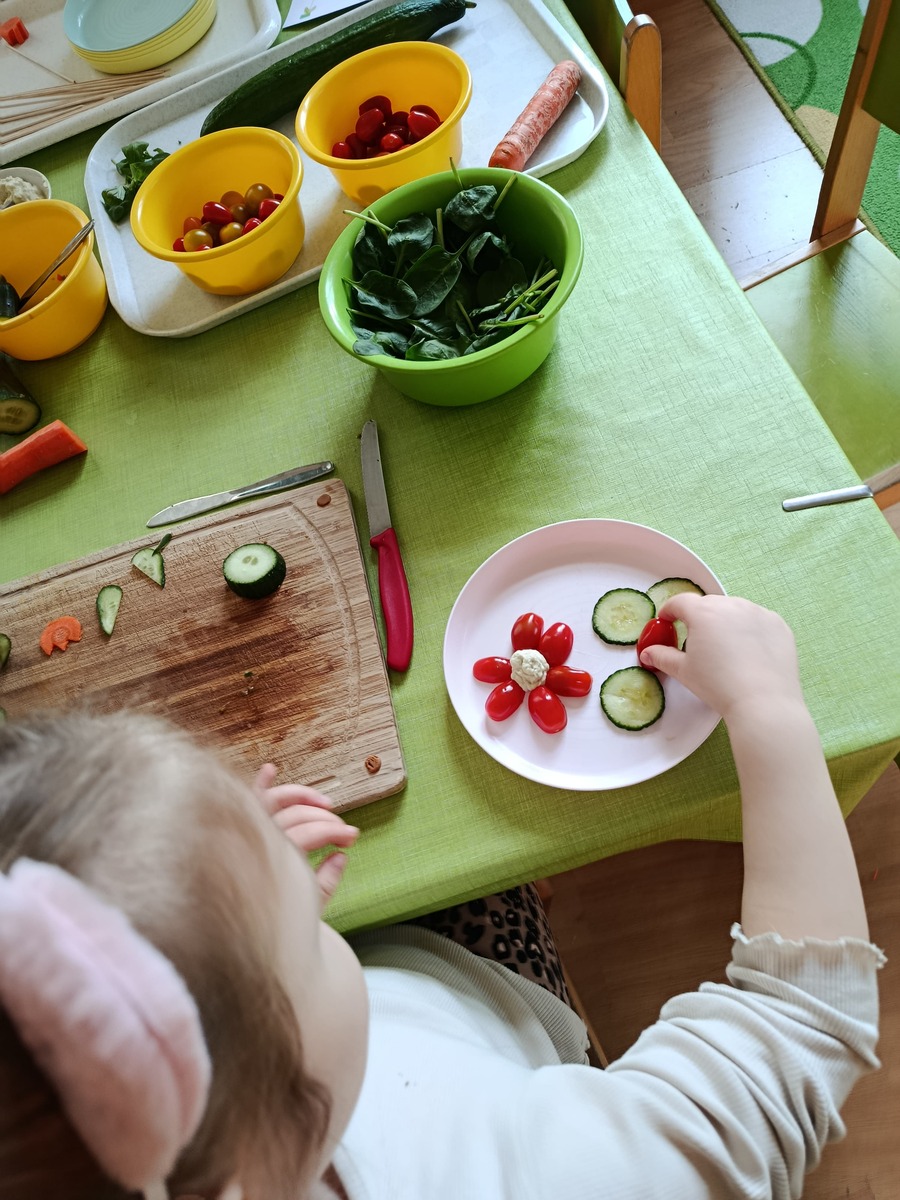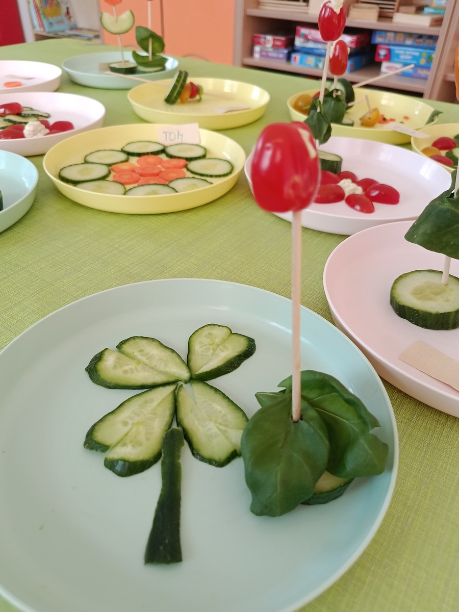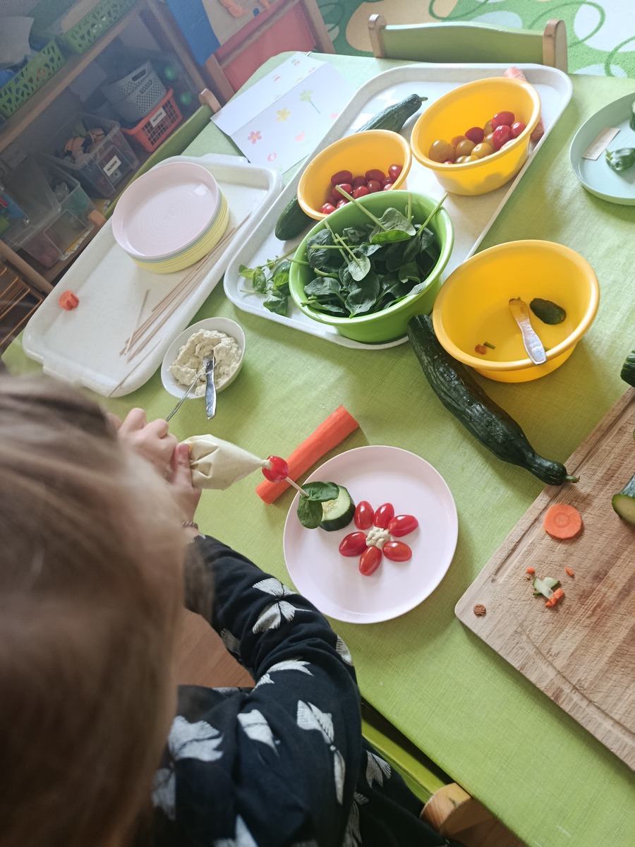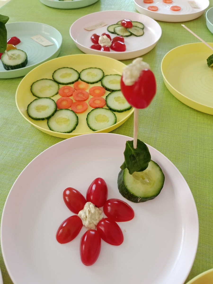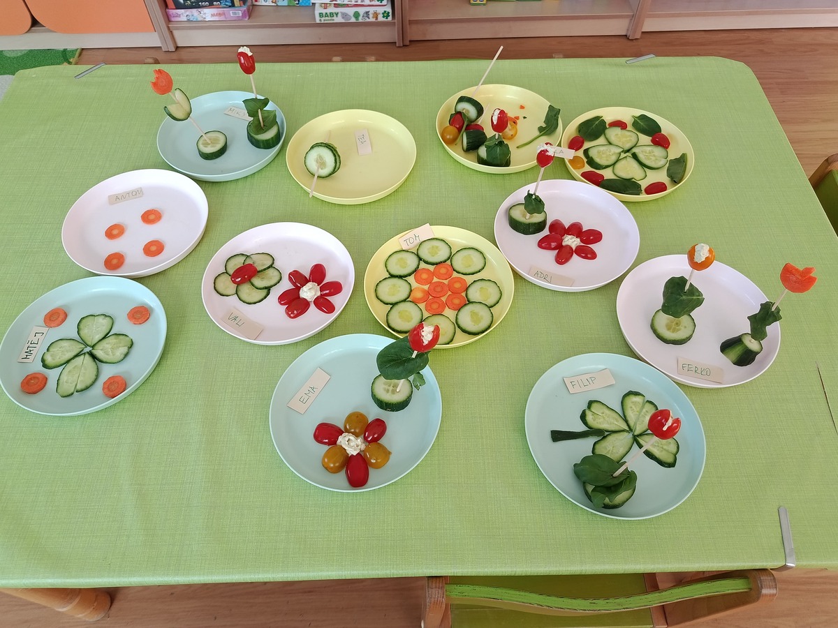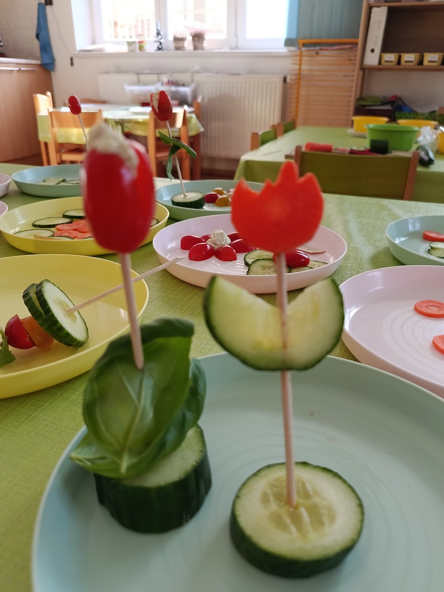 Během tématu, které bylo věnováo lidskému tělu, jsme si ve školce povídali o tom, jak v něm všechno funguje, a také o tom, co je potřeba dělat pro to, abychom byli zdraví. Víme, že je důležité jíst hodně čerstvé zeleniny a tak jsme se rozhodli, že si připravíme nějakou zdravou dobrotu. A protože už jaro ťuká na dveře a na zahrádkách se objevují první kytičky - pustili jsme se do tvoření zeleninových kytiček. Krájeli jsme rajčata různých barev, okurky, z plátků mrkve vykrajovali tulipány, některé květy jsme plnili pomazánkou. Jako listy jsme použili špenát a lístky bazalky. Radost jsme měli i ze čtyřlístků z okurek a také z barevných mandal, při jejichž tvoření jsme naplno uplatnili naši fantazii. Nakonec jsme si udělali výstavku všech originálních výtvorů, které jsme si pak přidali ke svačince a moc si pochutnali na našich 'zeleninových zahrádkách'.