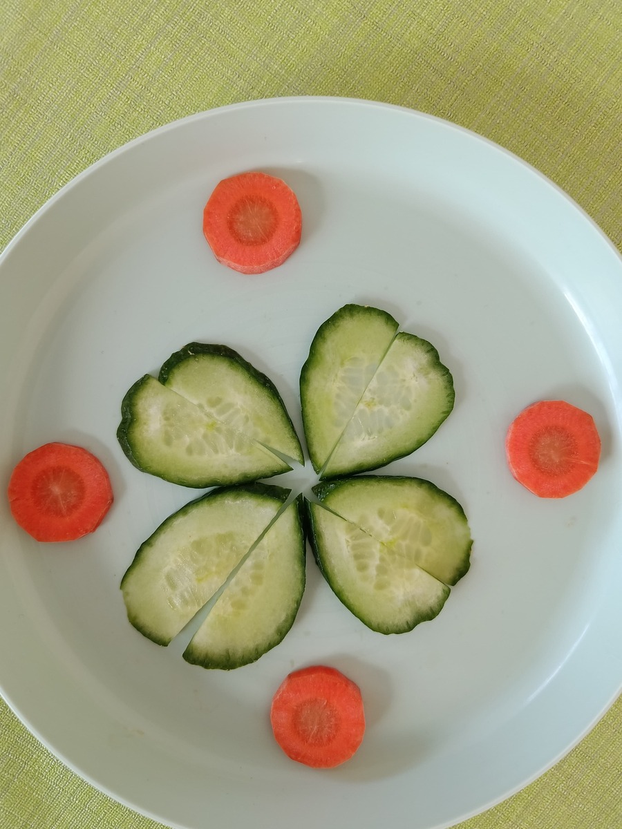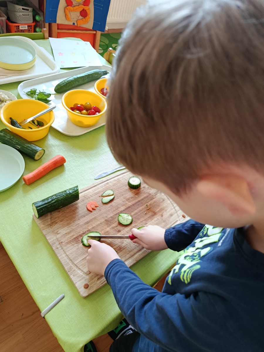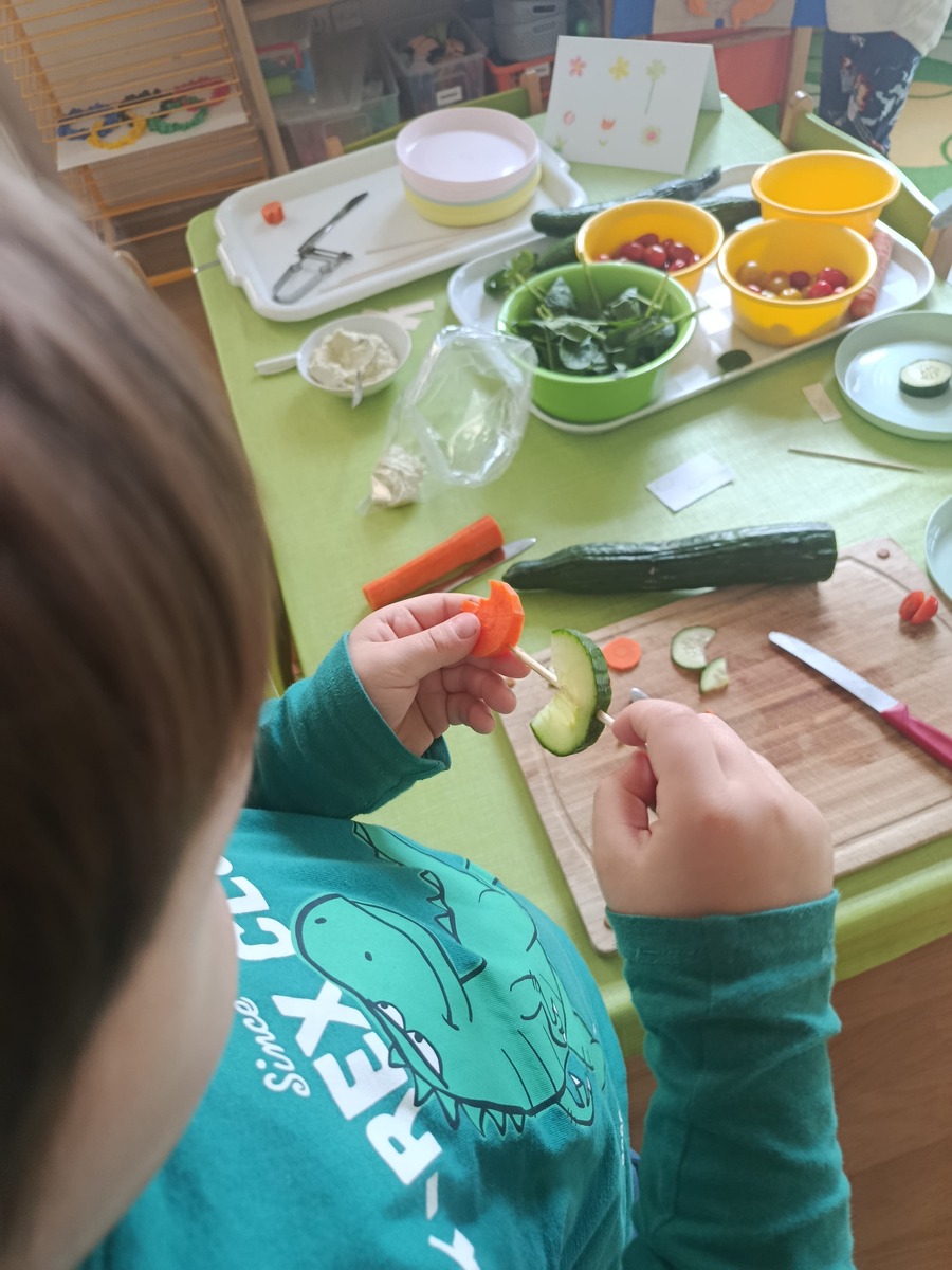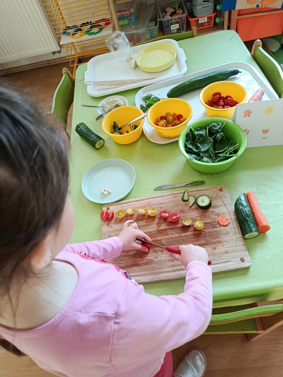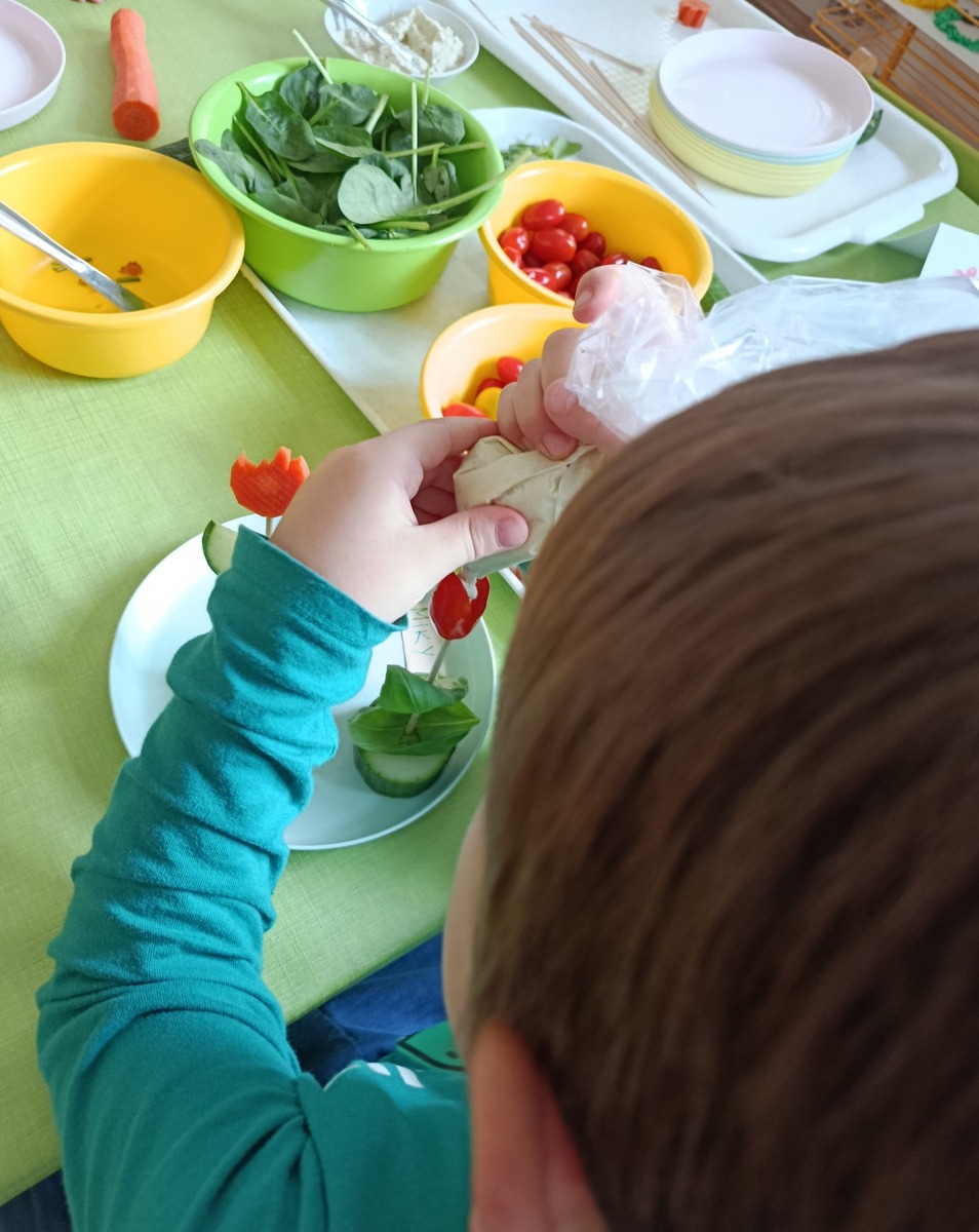 Během tématu, které bylo věnováo lidskému tělu, jsme si ve školce povídali o tom, jak v něm všechno funguje, a také o tom, co je potřeba dělat pro to, abychom byli zdraví. Víme, že je důležité jíst hodně čerstvé zeleniny a tak jsme se rozhodli, že si připravíme nějakou zdravou dobrotu. A protože už jaro ťuká na dveře a na zahrádkách se objevují první kytičky - pustili jsme se do tvoření zeleninových kytiček. Krájeli jsme rajčata různých barev, okurky, z plátků mrkve vykrajovali tulipány, některé květy jsme plnili pomazánkou. Jako listy jsme použili špenát a lístky bazalky. Radost jsme měli i ze čtyřlístků z okurek a také z barevných mandal, při jejichž tvoření jsme naplno uplatnili naši fantazii. Nakonec jsme si udělali výstavku všech originálních výtvorů, které jsme si pak přidali ke svačince a moc si pochutnali na našich 'zeleninových zahrádkách'.