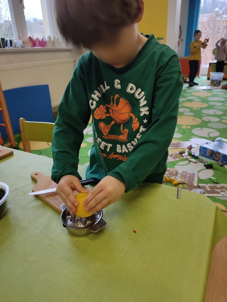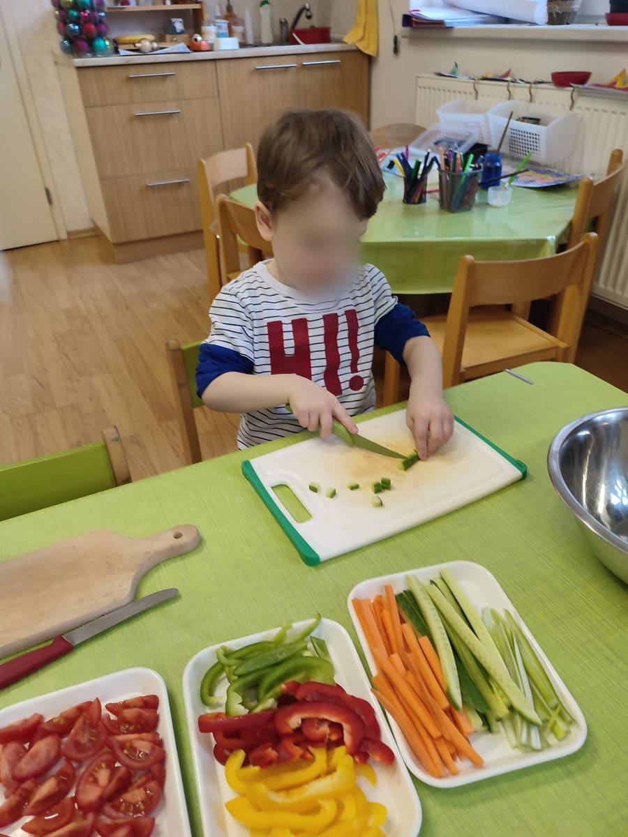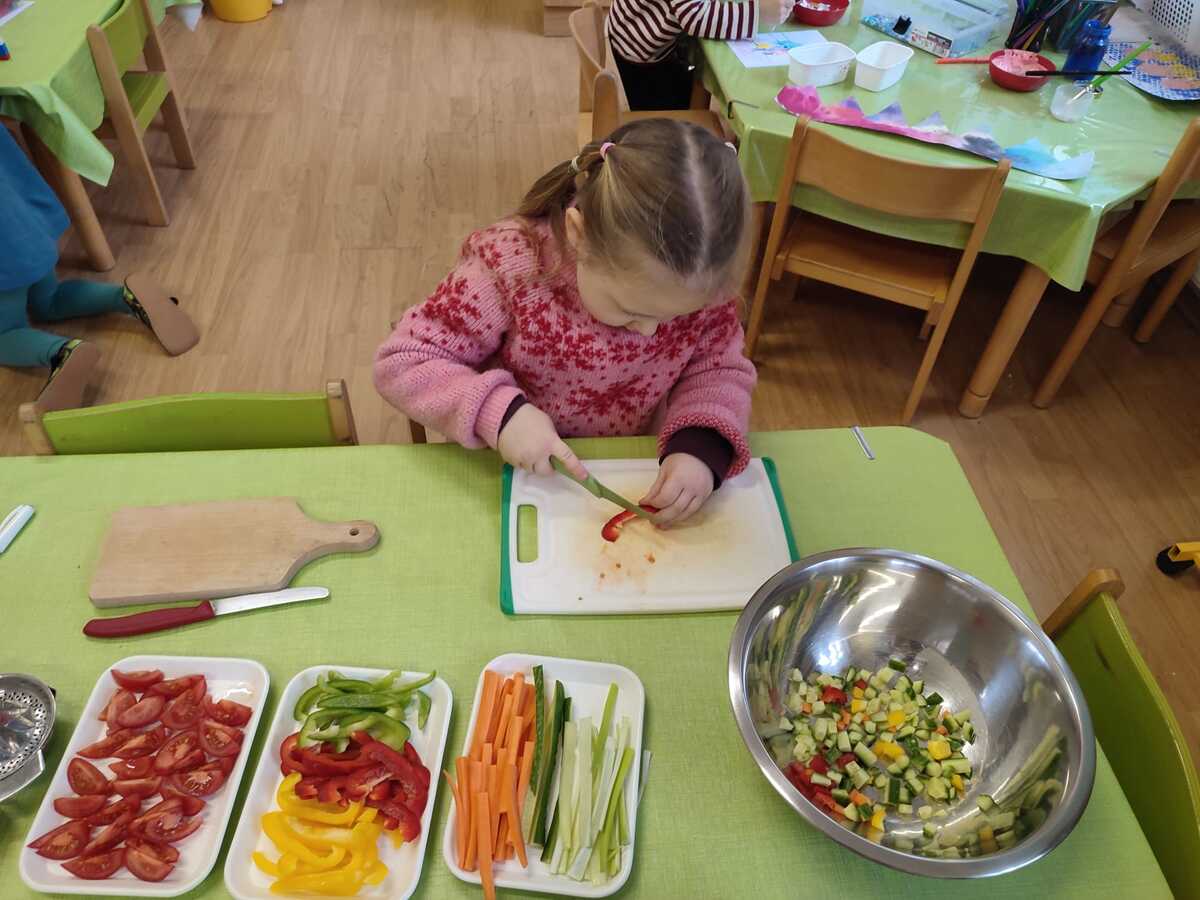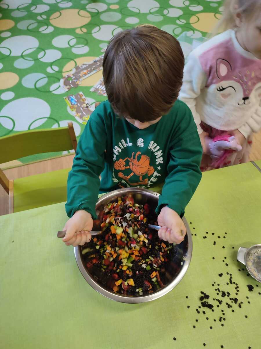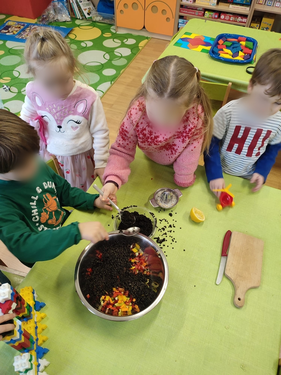 Černou čočku uvařila paní učitelka, zeleninu měly děti připravenou na stolečku s noži a prkýnky, takže hned po příchodu do třídy mohly krájet barevné papriky, okurku, mrkev, rajčata a jarní cibulku na kostičky. Vše smíchaly v míse s čočkou a čerstvě vymačkanou citrónovou šťávou. K obědu si děti samy nabíraly salát do misek a ochutnávaly, někteří si i s chutí přidávali.