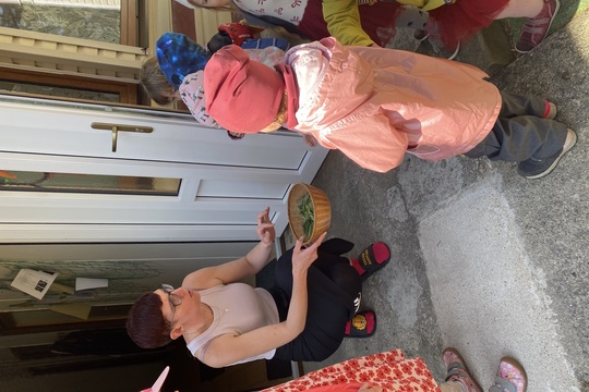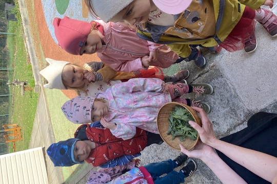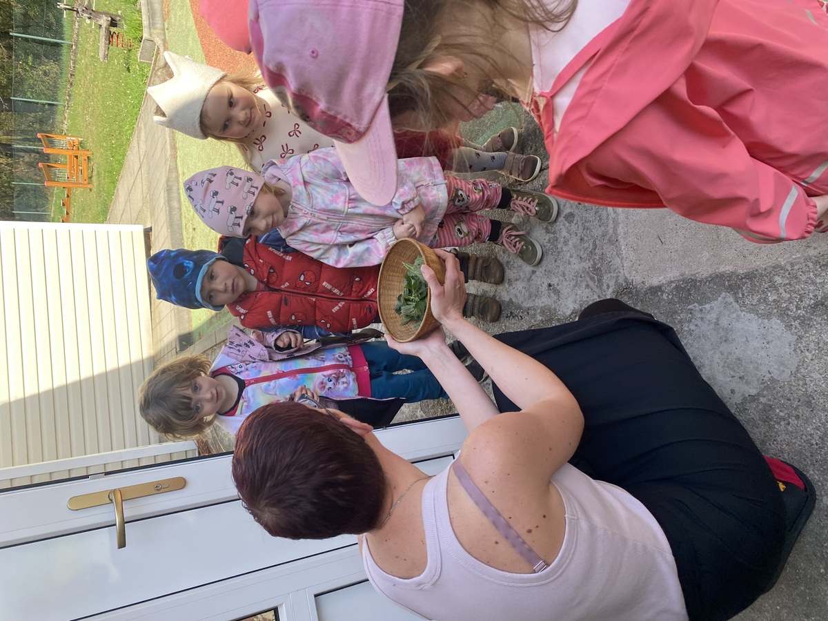 Dále nám naše paní kuchařka sestavila tematický jídelníček, který nejen hrál zelenou barvou, ale byl i moc chutný. Ráno ke svačince byl chlebík s pomazánkou a s ledovým salátem. Na oběd si připravila špenátovo – kopřivové palačinky se sýrem. A protože rádi všichni pomáháme, nasbírali jsme kopřivy při vycházce venku a pak jsme je slavnostně předali a paní kuchařka z nich uvařila oběd. Posledním jídlem toho dne byly jidáše. Paní kuchařce se všechna jídla moc povedla a všem moc chutnala.