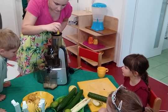 Odšťavnili jsme všechno zelené (okurku, řapíkatý celer, jablko, hrušku, limetku), usmažili jsme si vaječnou omeletu s medvědím česnekem a posypali mikrogreens. Největší úspěch měla pučálka naslano a nasladko.
