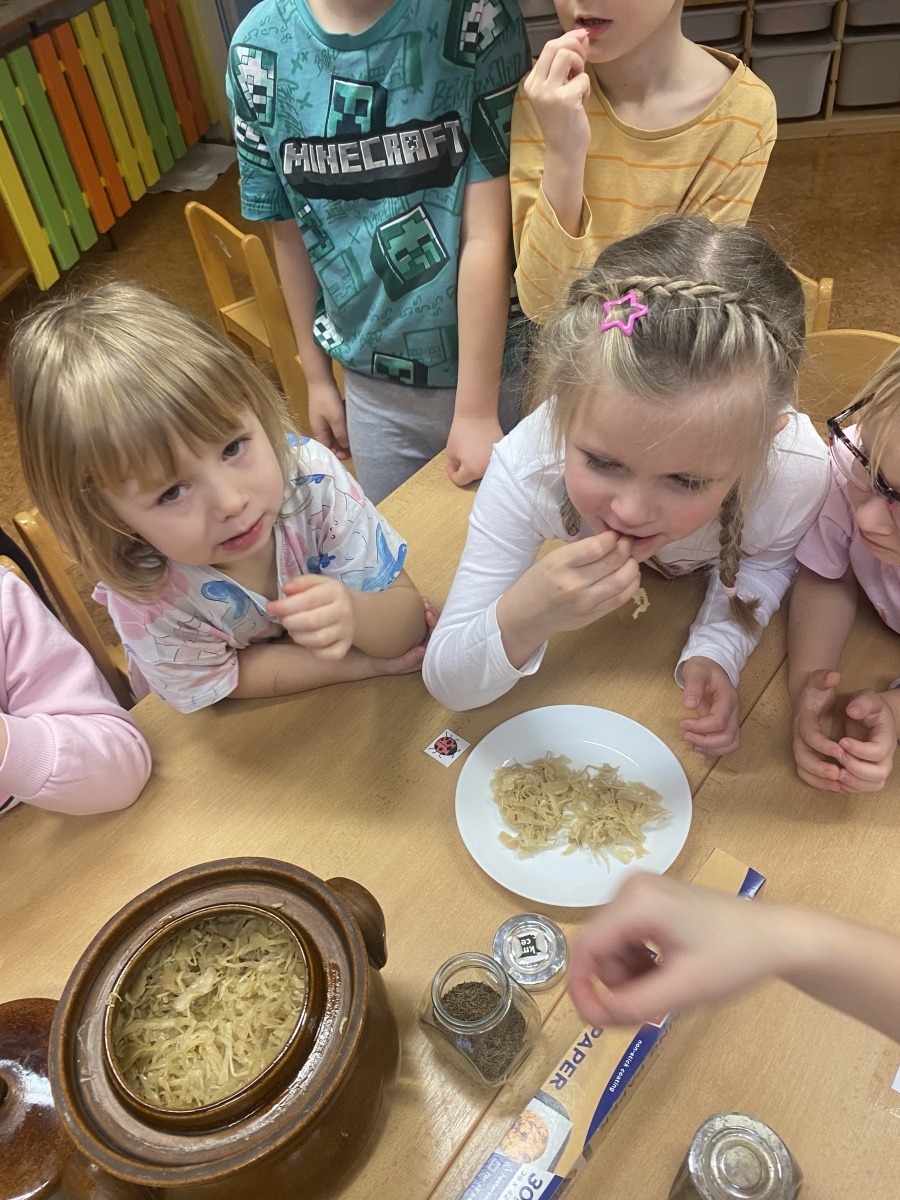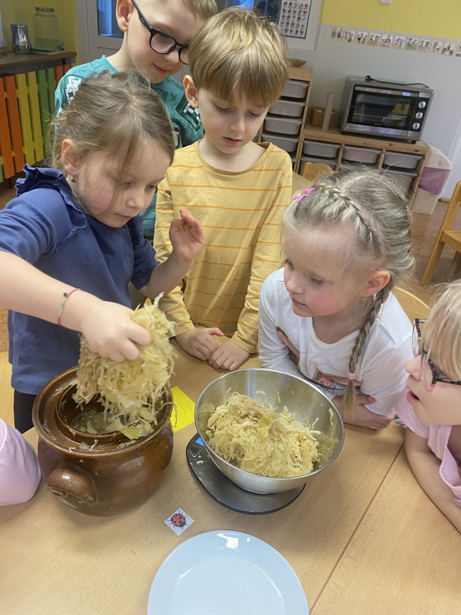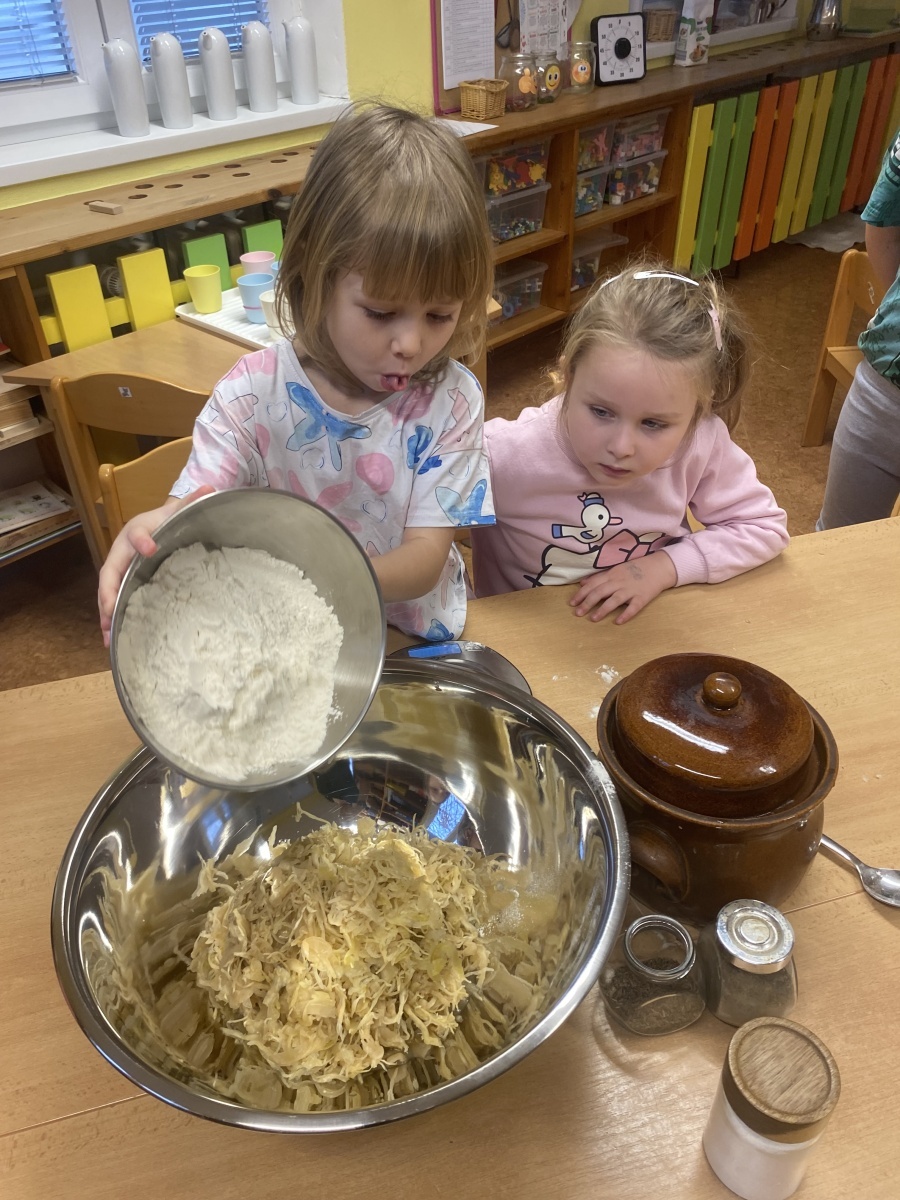 Dnes přišla sladká - nebo spíše slaná :-) odměna – zelíčko máme hotové. Někteří z nás ochutnali a několikrát žádali přídavek. Z našeho zelí jsme s dětmi za poslechu moravských lidových písní upekli zelné placky.